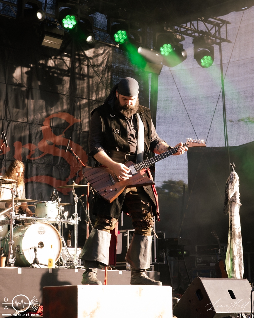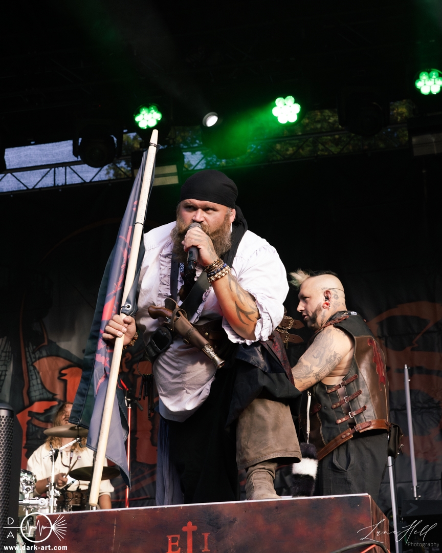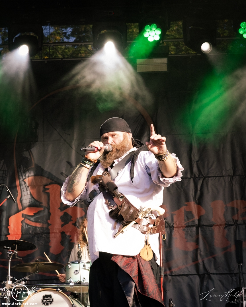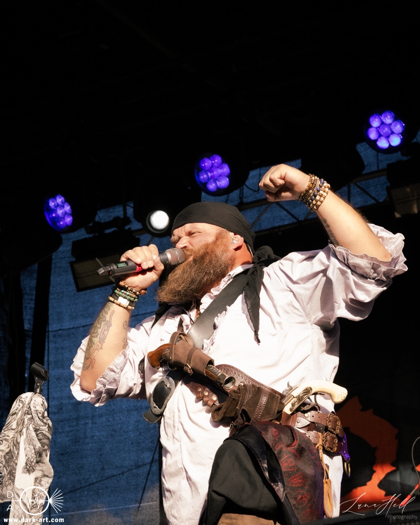 Nach PurPur wechselten wir zur Burgbühne, wo The Blackbeers spielten. Die Band gehört seit Jahren zu den festen Größen des Festivals und brachte jedes Mal ihre unverwechselbare Mischung aus Piratenfolk, guter Laune und markanten Rhythmen mit. Wer kurz zuvor bei der offiziellen Eröffnung war, entdeckte hier direkt ein vertrautes Gesicht wieder: Ulf, der Veranstalter, stand bei The Blackbeers als „Admiral“ selbst auf der Bühne. Mit mehreren Musikern auf der Bühne, Gesang, Geige, Akkordeon und Percussion entsteht ein Klangbild, das sofort Bewegung in die Menge bringt. Vor der Burgbühne herrschte entsprechend ausgelassene Stimmung, viele sangen mit oder ließen sich einfach von der Musik treiben.