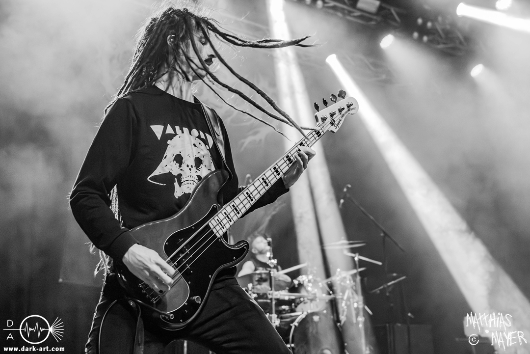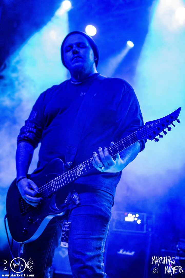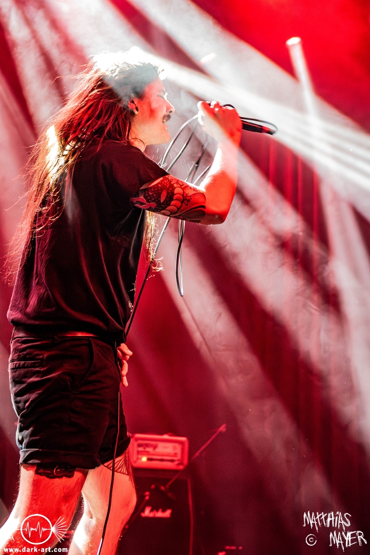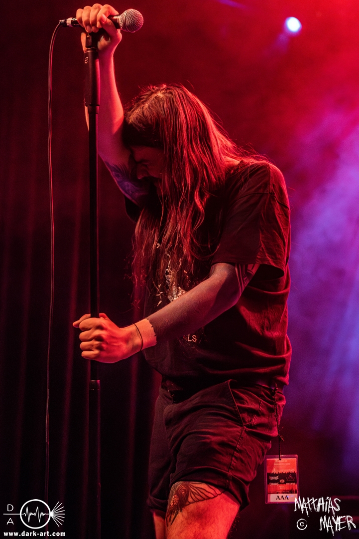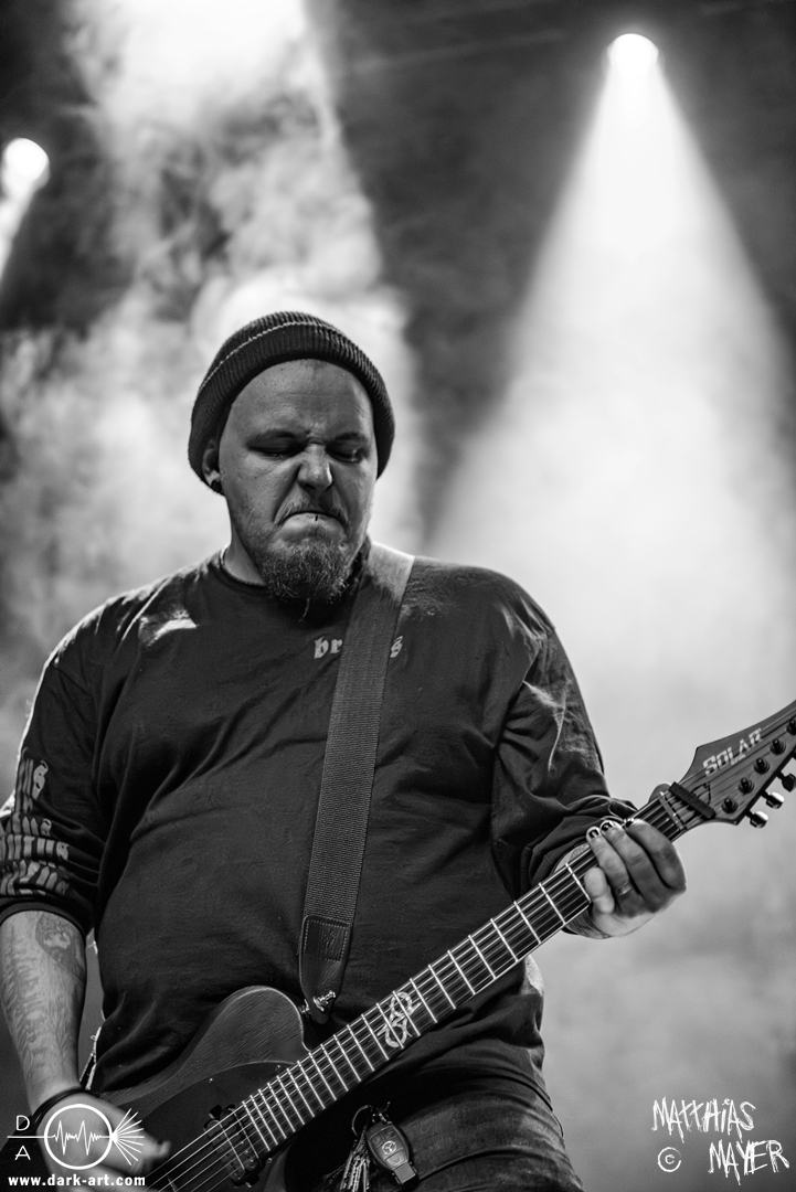 Nekrodeus rissen das Publikum jäh aus der Trance, in die es die vorherigen Bands versetzt hatten. Statt atmosphärischer Klangreisen gab es hier prügelnde Rhythmen, gnadenlose Geschwindigkeit und ein Feuerwerk an roher Aggression. Die wütenden Screams und messerscharfen Gitarrenriffs peitschten durch die Halle und brachten die Menge sofort in Bewegung. Frontmann Stefan Rindler brachte es auf den Punkt: „Baphofest, wollt ihr mit uns tanzen?… auf die Plätze, fertig, auf die Fresse!“ Das Set war gespickt mit Songs vom neuen Album Ruaß, das erst wenige Tage alt war. Der Circle Pit, der sich zum Schluss in einer Ecke der Halle formte, war ein Sinnbild für die entfesselte Energie dieses Auftritts.