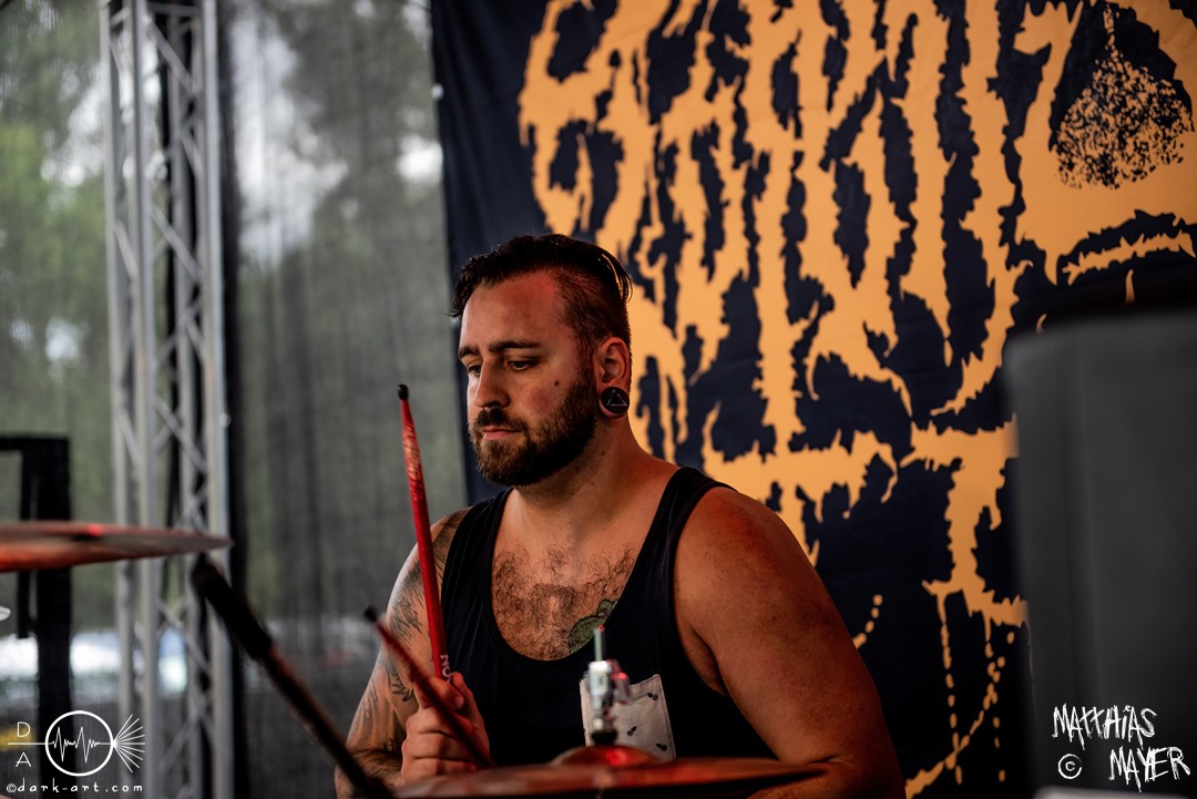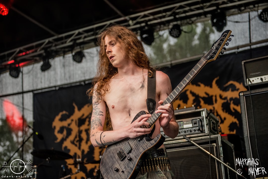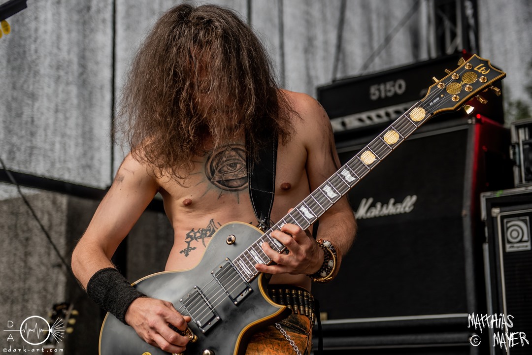 Darkfall durften, entgegen ihres Namens, wieder im strahlenden Sonnenschein ran. Dafür machten sie ihrem anderen Titel „Thrash till Death“, welcher auf den seitlichen Aufstellern prangte, alle Ehre. Sofort legten sie ohne Gnade los und hauten den Zuhörern einen nach dem anderen um die Ohren. Leider wurden auch sie von technischen Problemen geplagt und so geriet Sänger Thomas in Plauderlaune und erzählte, dass sie aufgrund der langen Anreise aus Österreich noch einen Zwischenstopp in Passau eingelegt hatten. Dort hatten sie sich schon ordentlich einen angesoffen und hofften, dass dies nicht auffiel. Und das alles im schönsten Dialekt. Zu der Frage, ob jemand Bock hätte eine Dildo Show zu machen, hielt er plötzlich den großen Schwarzen in der Hand. Freiwillig fand sich niemand und so ging es dann auch mit der regulären Setlist weiter. Zum Schluss wurde noch die erste Reihe, mitsamt der zwei putzigen Kids, welche ordentlich abgegangen sind, abgeklatscht. Der Nachwuchs scheint gesichert.