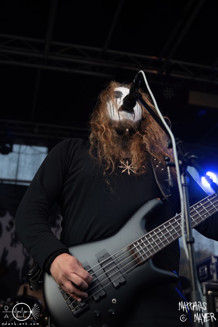 Den Auftakt des zweitägigen Festivals durften die deutschen Black Metaller von Totensucht bestreiten. Trotz des zu Beginn immer noch strömenden Regens zogen sie schon etliche Menschen auf das Infield und vor die Bühne. Hart, aber doch zwischenzeitlich sehr melodisch, schafften sie es, eine tolle Stimmung zu erzeugen. Auch fand ich das Wetter hier recht passend, handeln ihre Texte doch von Okkultismus, Spiritualismus und ähnlichem. Mir gefiel der schnörkellose und geradlinige Auftritt sehr gut und auch bei dem restlichen Publikum kamen sie sehr gut an, trotz kurzer technischer Probleme direkt am Anfang. Ein gelungener Debut-Auftritt der Band, nach über 10 Jahren Bandgeschichte.