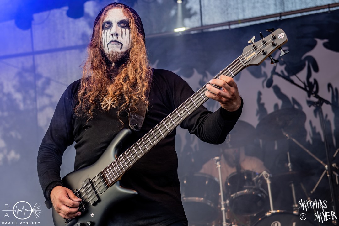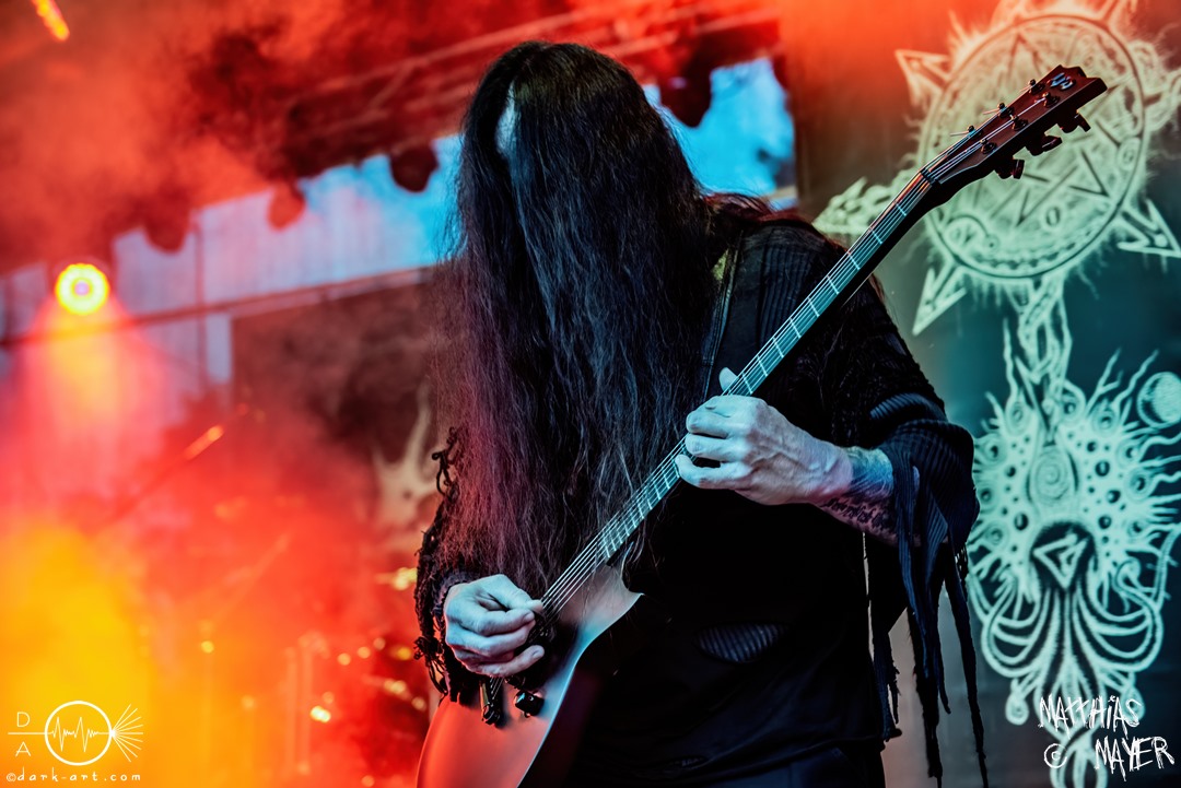 Dann wurde es wieder etwas düsterer und gediegener. Die Franzosen Seth, welche nach über einer halben Stunde Verspätung die Bühne betraten, hüllten das Festival in eine düstere Atmosphäre. Ein kleiner Altar war in der Mitte vor dem Drumset aufgebaut und runde Metallaufsteller mit eingearbeiteten Drachen und Flammen standen links und rechts platziert. Sänger Saint Vincent war dabei eine ganz eigene Erscheinung, mit Ketten an beiden Handgelenken und einem langen schwarzen bodenlangen Mantel mit einer verzierten Schärpe, betrat er die Stage mit einem Kerzenleuchter und zwei Kerzen darauf. Teilweise zückte er später noch einen gezackten Dolch, welchen er bedrohlich der Menge entgegenstreckte. Das ganze untermalt von verdammt viel Nebel, erschuf es eine ganz eigene Stimmung, welche die Leute abholte. Sie konnten mit ihrer Bühnenperformance komplett überzeugen. Zum letzten Lied kam dann noch eine Frau auf die Bühne, welche dann von dem Sänger gespielt gewaltsam obenherum entkleidet wurde und sich dann selber in einer Art Ritual mit Blut übergoss. Dazu gab es dann von selbiger noch eine Feuershoweinlage mit Fächern. Ein bisschen Klischee muss halt doch sein. Seth lieferten absolut überzeugend ab. Wer sie noch nie gesehen hat, dem empfehle ich, dies schleunigst nachzuholen.