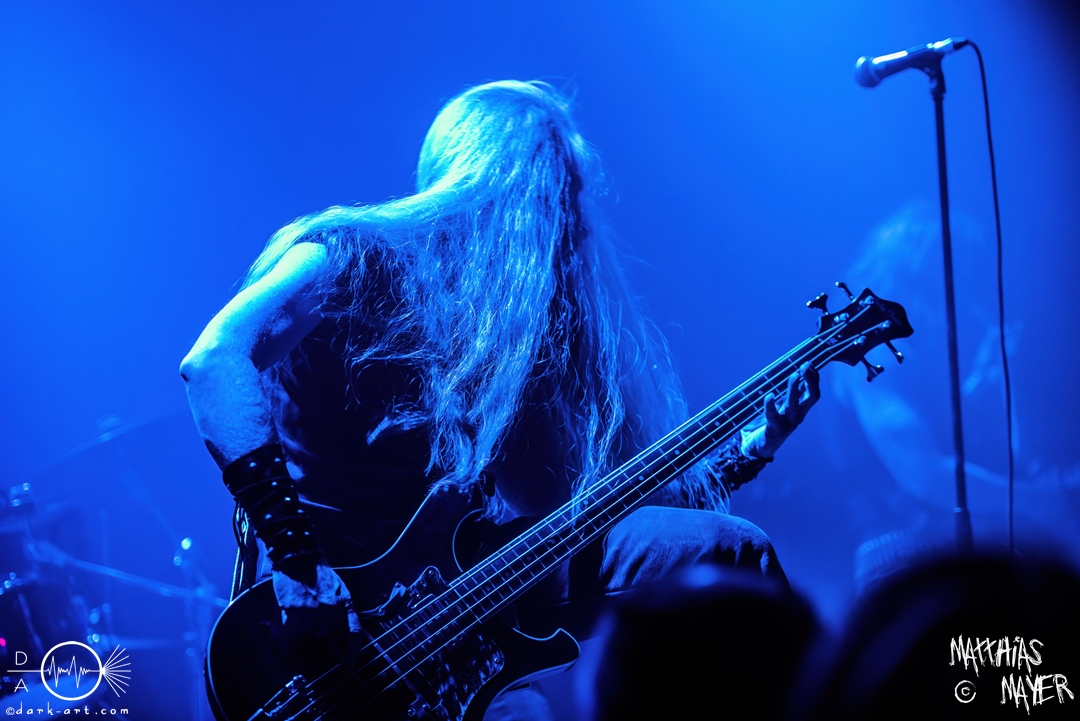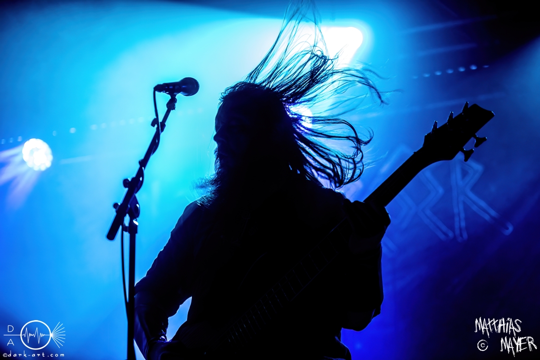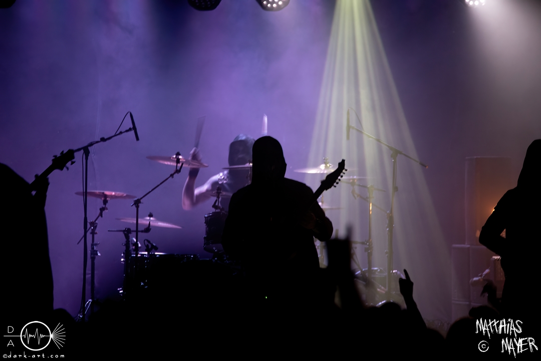 Mit Sulphur Aeon driften wir langsam in den Cosmik-Horror von Lovecraft und seinem Zirkel ab. Das Opening trifft wie ein Donnerschlag die Arena. Mit einer wahrlich tragenden Stimme und fast erdrückender Instrumentalarbeit reißt uns die Band tief hinab in die Unterseestadt Ryleigh, nur unterbrochen von den gelegentlichen, hohen Gesangsparts. Der Stimme folgend schraubt sich die Melodie im Lauf des Auftritts wieder und wieder in die Höhe, wie ein Schwarm schwarzer Krähen auf ihrem Weg in den unendlichen Kosmos. Die Zuhörer quittieren diese Entwicklung mit fliegenden Haarmähnen, Vogelschwingen gleich, immer wieder auf und ab. Mein persönliches Highlight sind aber die wahrlich bösartigen Ansagen des Frontmanns M., welche mir wieder und wieder Gänsehaut beschert haben.