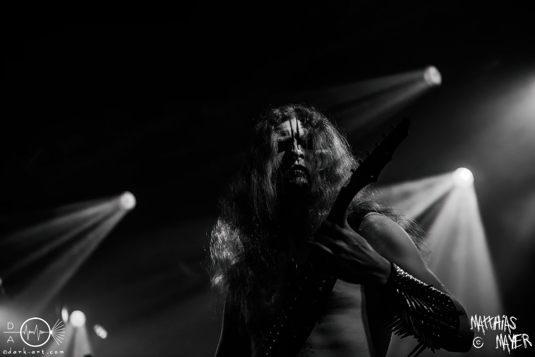 Die Band mit den wahrscheinlich eindruckstärksten Namen auf dem gesamten Festival, Darkened Nocturn Slautercult! Wie zackige Glasscherben schnitt sich die Stimme von Onielar in meine Ohren. Dazu wuchtige Melodien und gelegentliche Kontraste in der Stimme und den Instrumenten, aber auch der einzige im sonst so zähen, rohen Black Metal. Die Bühnendekoration aus Kuhschädeln, eisernen Pentagrammen und Ketten erinnert mich an Bands wie Gorgoroth oder Mayhem, welche bereits mit diesen Elementen gespielt hatten. Dazu die beeindruckenden Bühnenoutfits, bestehend aus Killernieten, literweise Kunstblut, Corpse Paint und das weiße Totenhemd von Onielar. Optisch macht die Band einiges her.