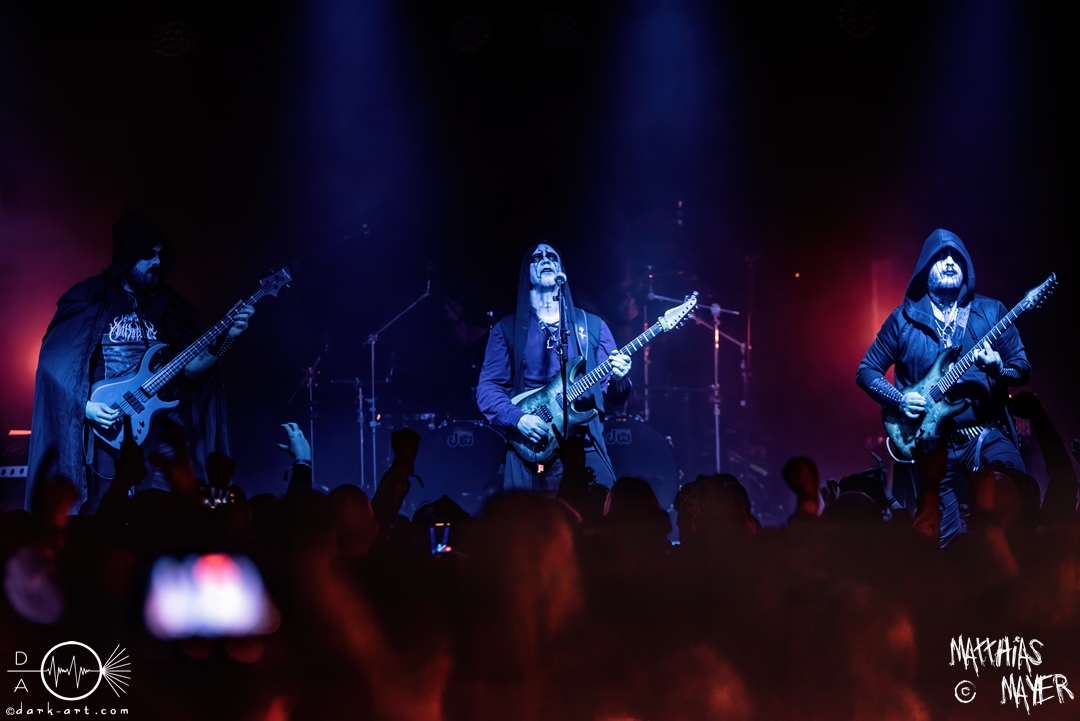 Die Vorhänge in der Halle wurden aufgezogen und nur Kerzenständer erhellten die Instrumente. Danach erschienen schwarze Gestalten in langen Umhängen auf der Bühne. Mit Corpse Paint und Kapuzen gekleidet betraten sie die Bühne und begannen mit ihrem fast minimalistischen Black Metal. Das lag an dem eher sparsamen Einsatz der Drums, welche am Anfang sogar aussetzten. Dadurch wirkte der Sound weniger aggressiv und dafür umso gedämpfter und langgestreckter. Dabei fand sich hier kein weiterer Doom-Ableger nach Candlemass, sondern ein eigener, atmosphärischer Black Metal. Eine Dame neben mir ist fast gestorben vor Verzückung für diese Darbietung von Thy Light. Ein ungewöhnliches, aber beeindruckendes Lob an deren Musik.