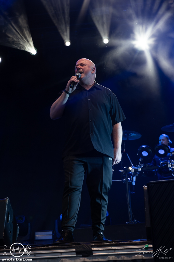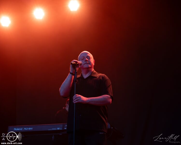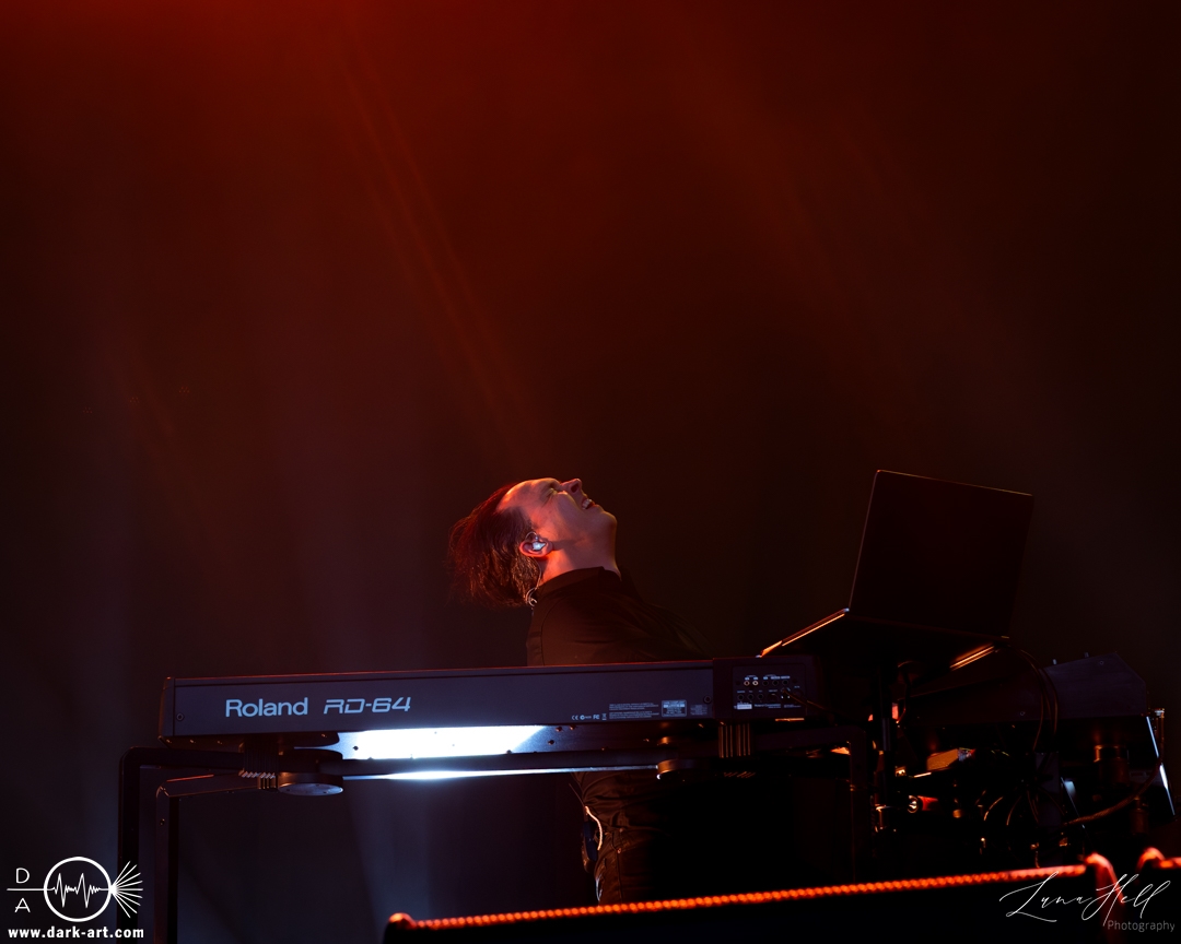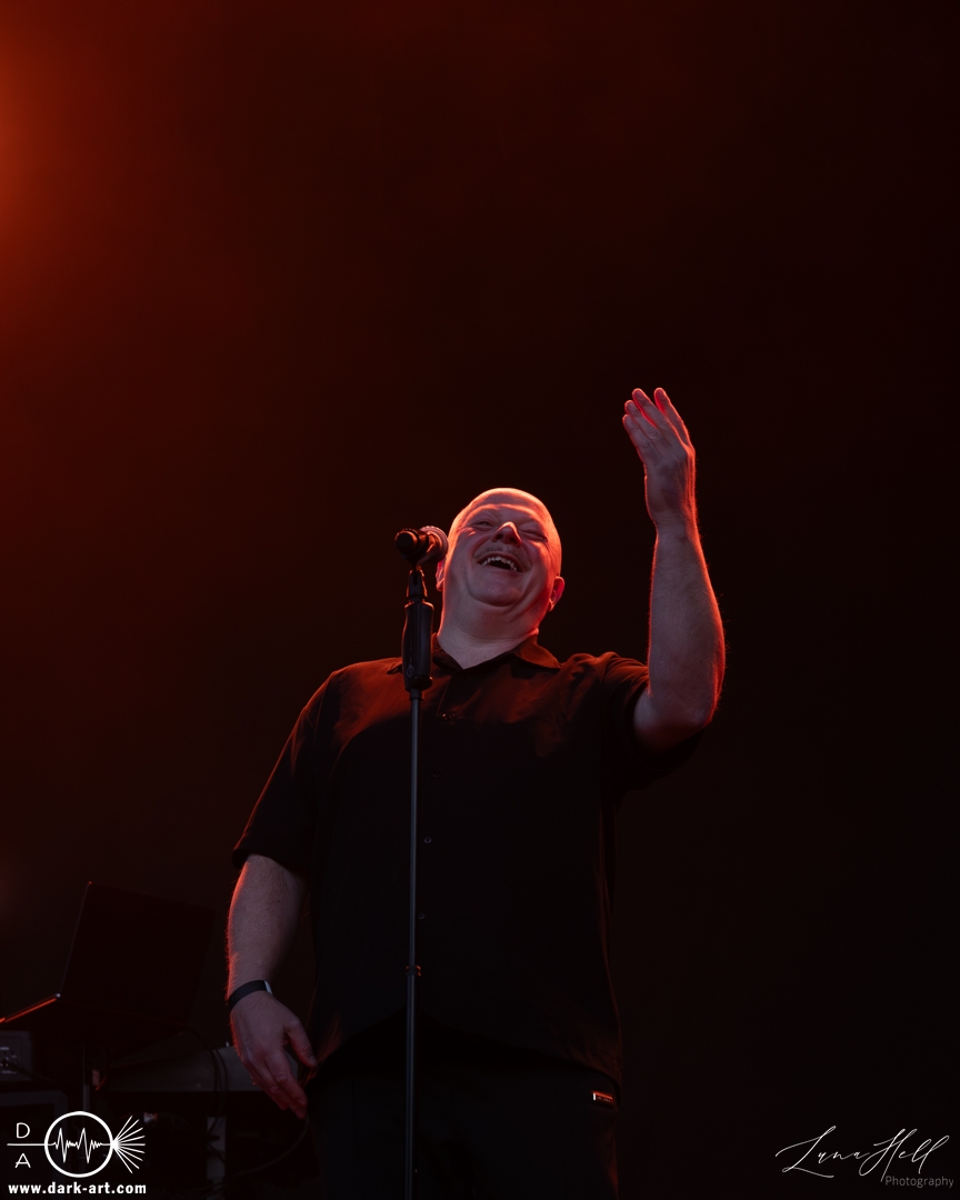 Zum Abschluss des Tages stand VNV Nation auf der Schlossbühne auf dem Programm. Als Headliner des Tages war die Bühne prall gefüllt, und man konnte dem Frontmann Ronan Harris deutlich ansehen, wie sehr er sich über die große Menschenmenge vor der Bühne freute. Die Besucher hatten sich fast geschlossen versammelt, viele kamen von anderen Bühnen und vom Festivalgelände, um diesen Auftritt nicht zu verpassen. Die Energie war spürbar, die Musik pulsierte durch die Menge, während die Kombination aus elektronischen Beats und atmosphärischen Melodien die Zuschauer in den Bann zog. Trotz der späten Stunde blieb die Stimmung intensiv, viele standen konzentriert bei ihrem Platz, einige bewegten sich im Rhythmus der Musik, und insgesamt erzeugte das Publikum ein gemeinsames, elektrisierendes Erlebnis.