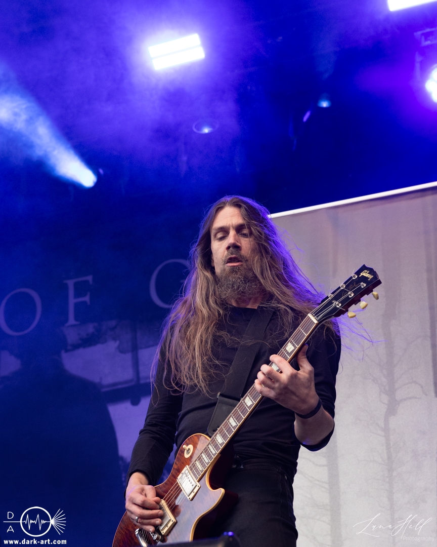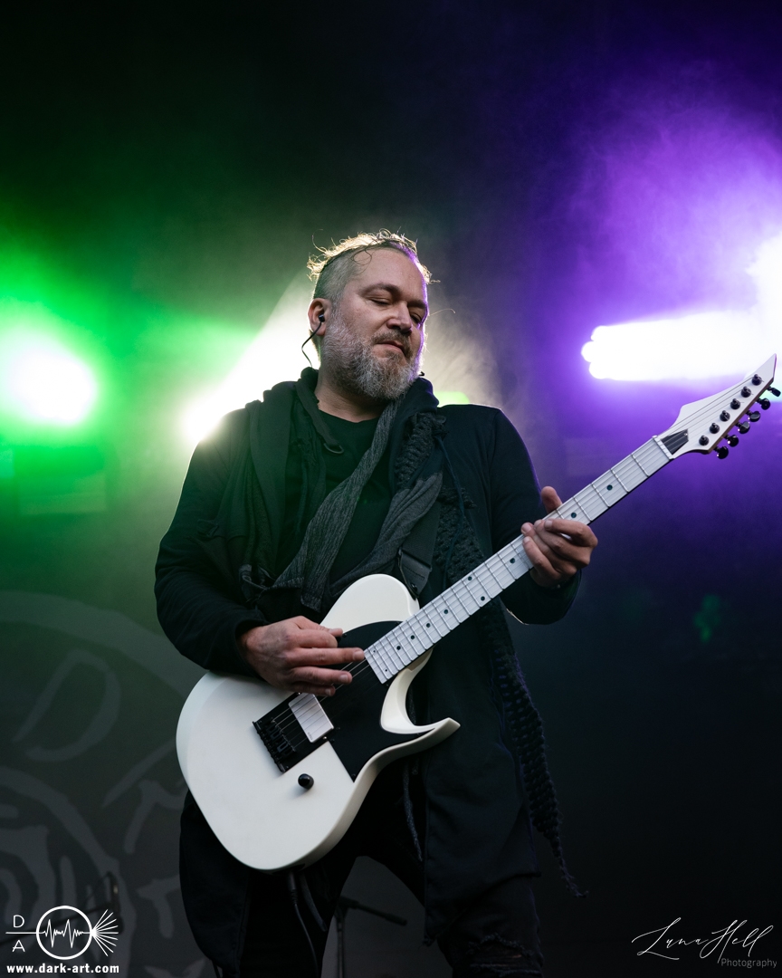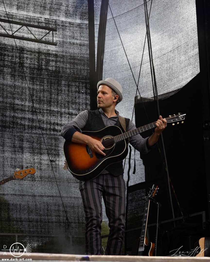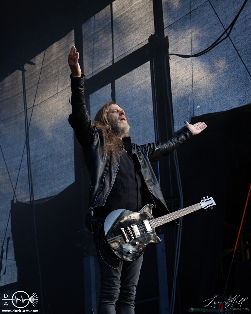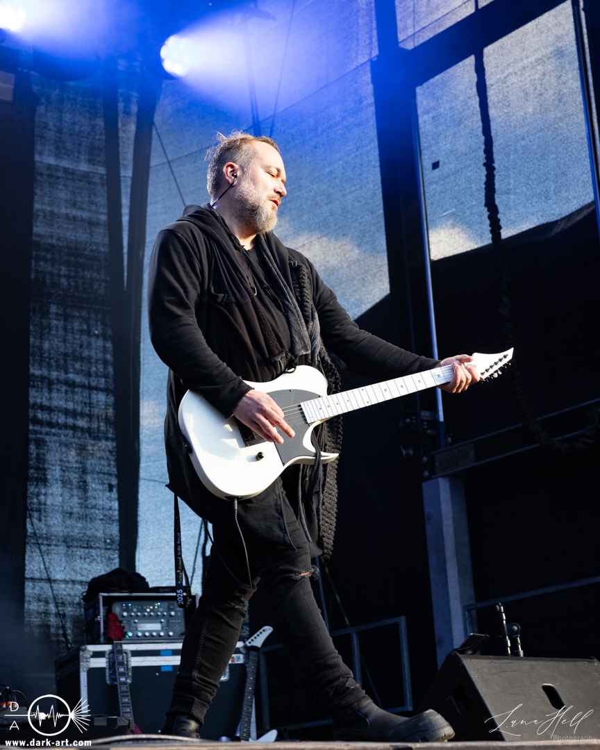 Auf der Schlossbühne präsentierte End of Green einen starken Kontrast zur vorherigen Band. Dunklere, melancholische Klänge und tiefgründige Vocals prägten die Stimmung und hoben sich deutlich vom ruhigeren Folk von Delva ab. Schon innerhalb der ersten drei Lieder begann es zu regnen, doch das tat der Atmosphäre keinen Abbruch. Die Besucher vor der Bühne ließen sich davon nicht abschrecken, standen konzentriert und aufmerksam an ihrem Platz und ließen sich von der dichten, intensiven Performance mitreißen. Unter den Zuschauern fiel unter anderem ein Fan auf, der sich passend zur Band eine eigene Jacke gehäkelt hatte, ein kleines Detail, das die Verbundenheit zur Musik zeigte.