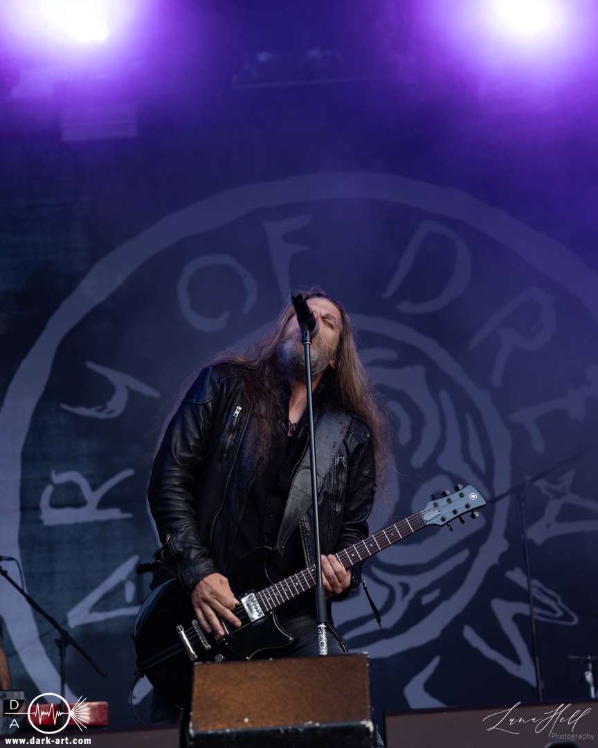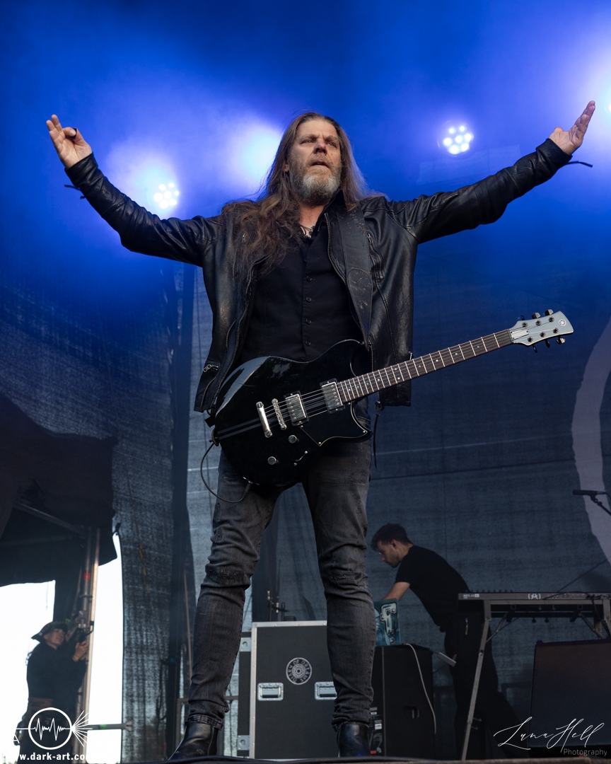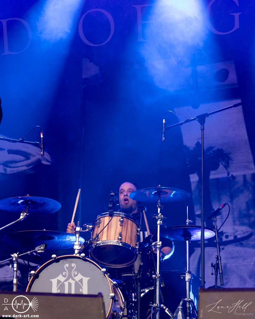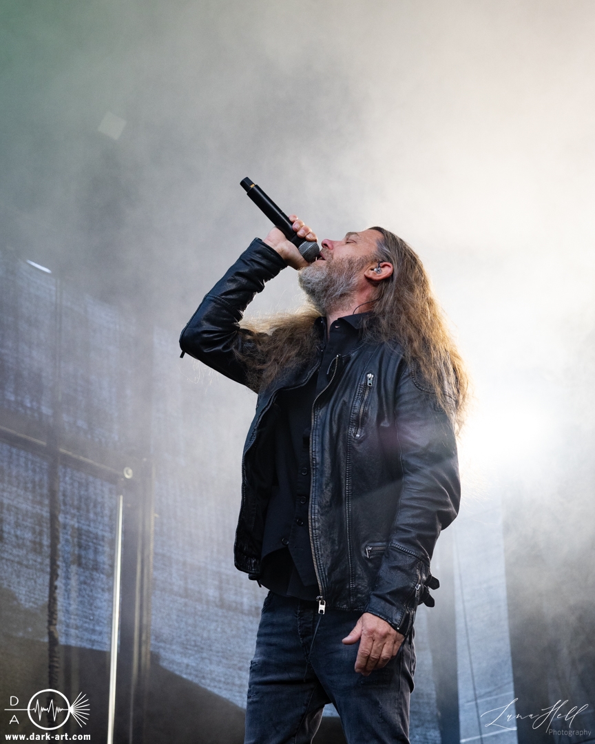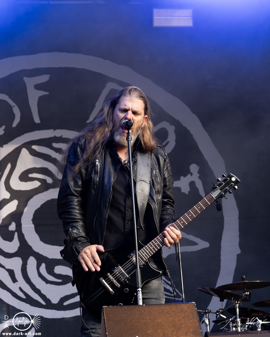 Auf der Schlossbühne präsentierte End of Green einen starken Kontrast zur vorherigen Band. Dunklere, melancholische Klänge und tiefgründige Vocals prägten die Stimmung und hoben sich deutlich vom ruhigeren Folk von Delva ab. Schon innerhalb der ersten drei Lieder begann es zu regnen, doch das tat der Atmosphäre keinen Abbruch. Die Besucher vor der Bühne ließen sich davon nicht abschrecken, standen konzentriert und aufmerksam an ihrem Platz und ließen sich von der dichten, intensiven Performance mitreißen. Unter den Zuschauern fiel unter anderem ein Fan auf, der sich passend zur Band eine eigene Jacke gehäkelt hatte, ein kleines Detail, das die Verbundenheit zur Musik zeigte.