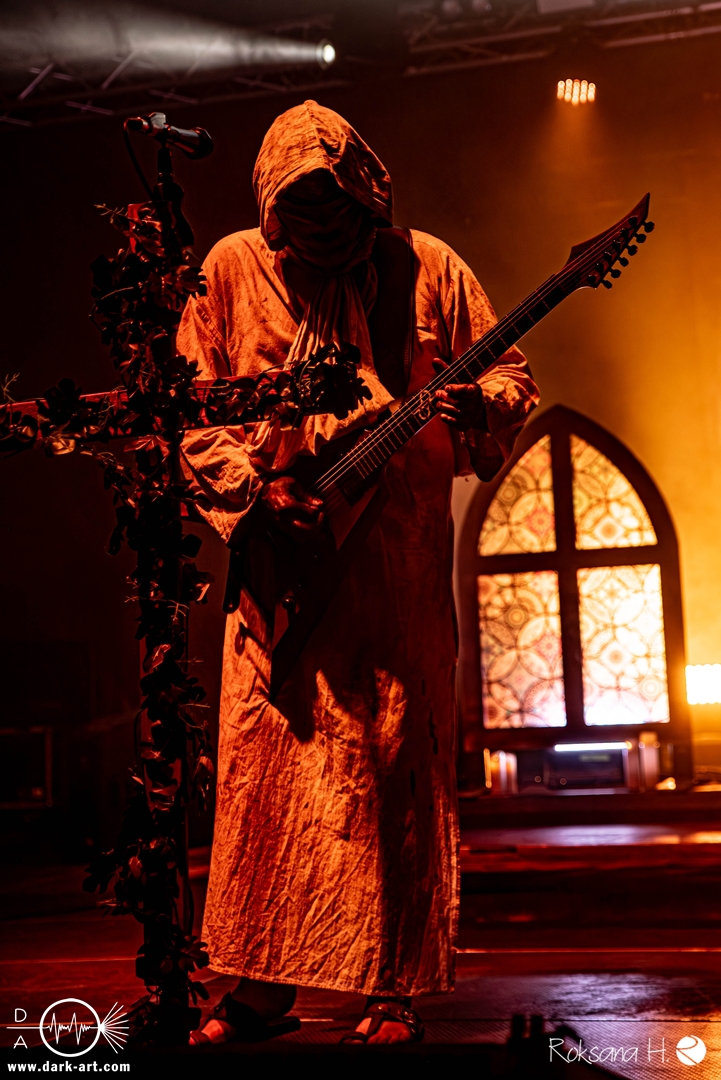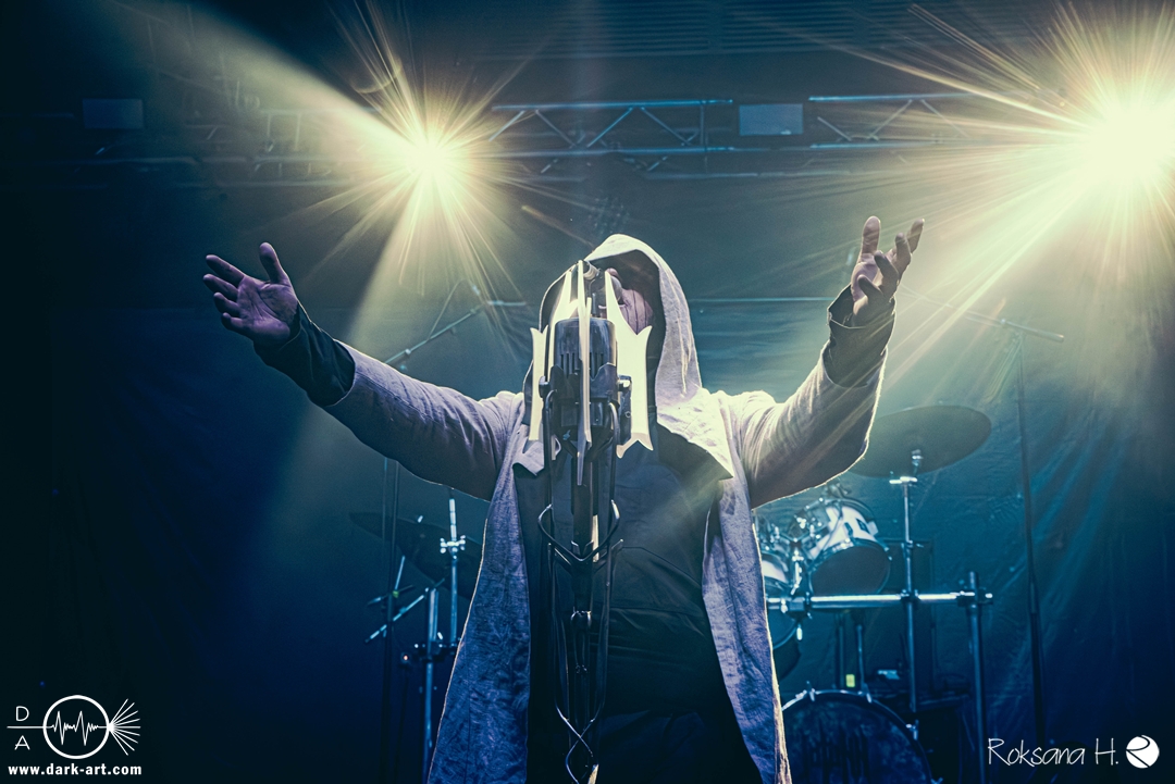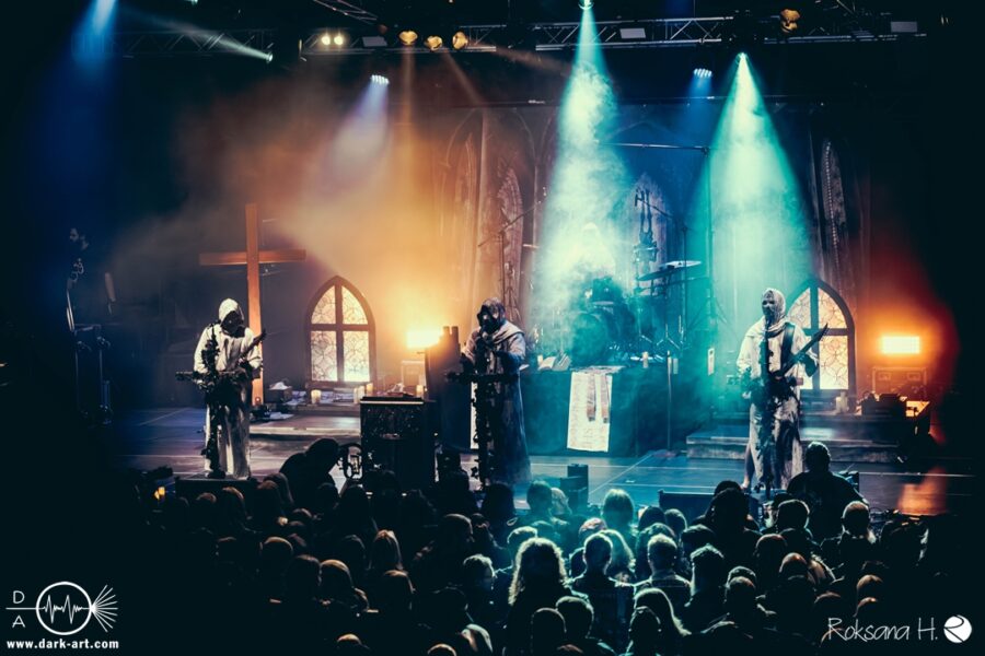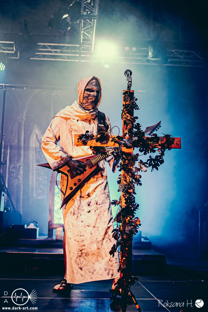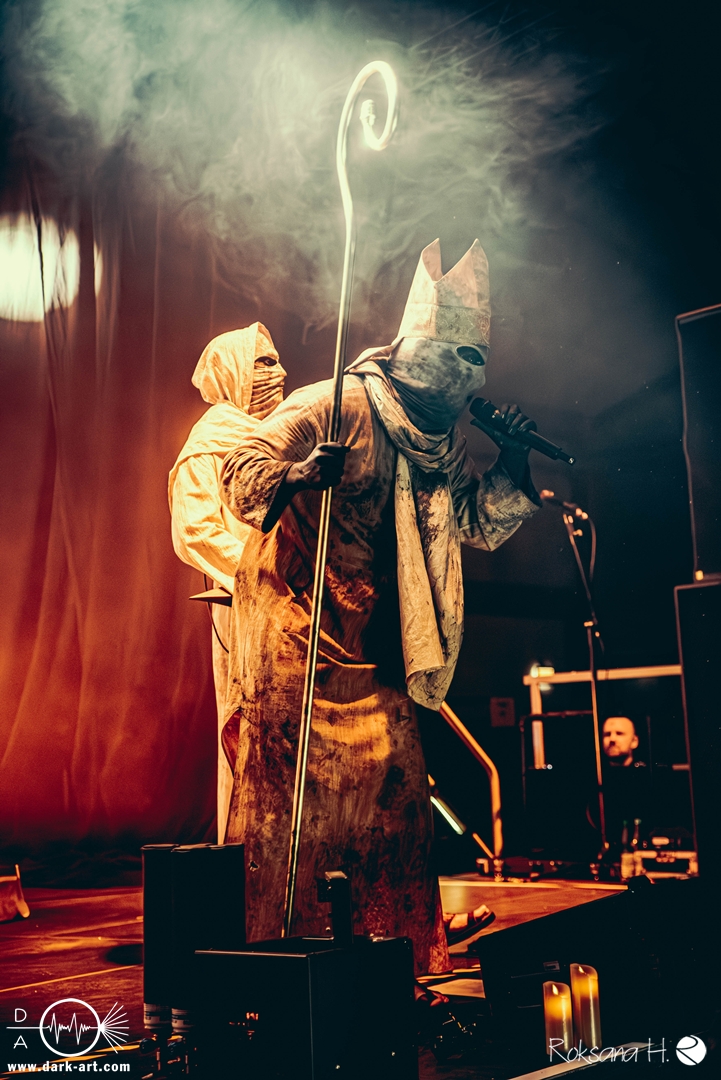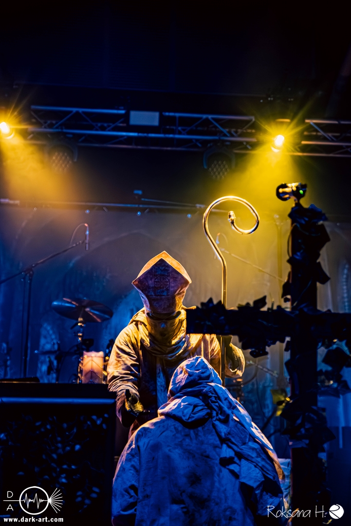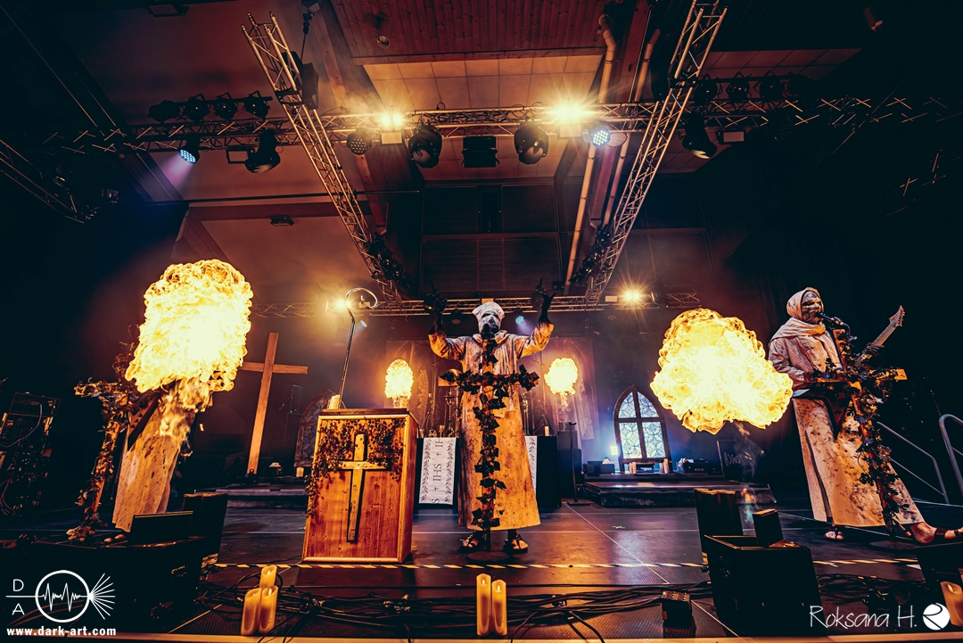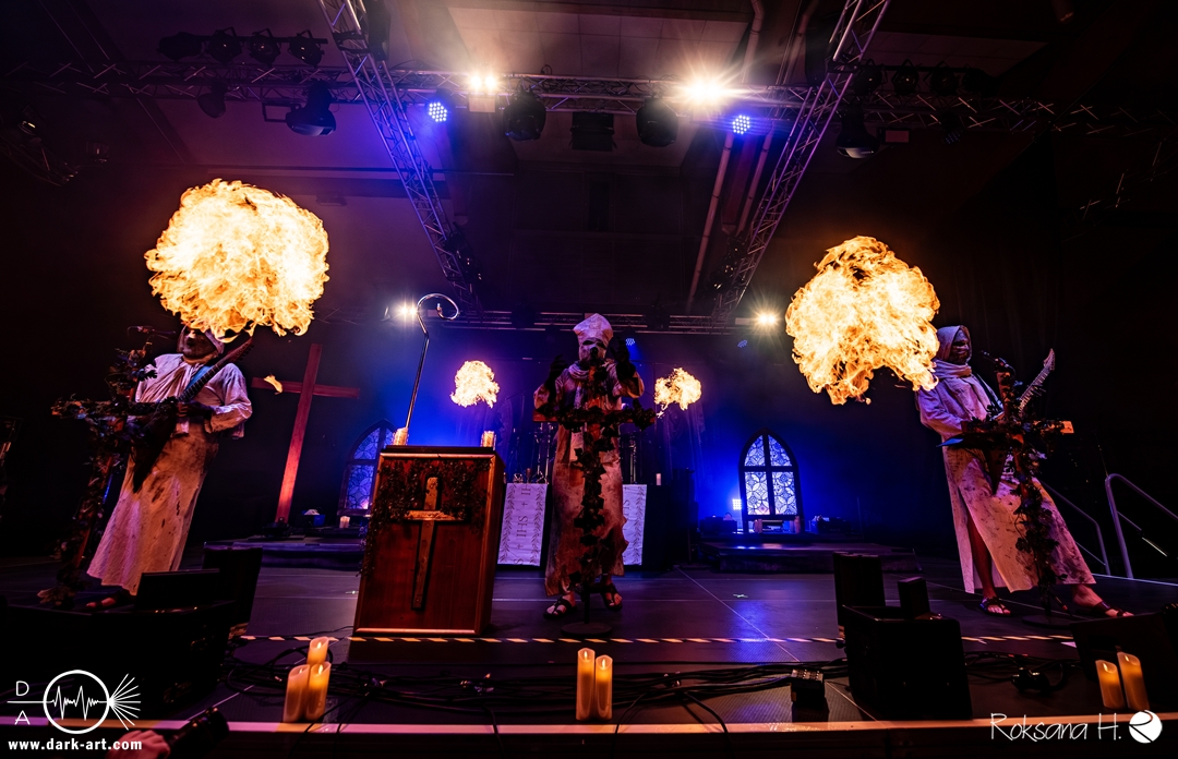 Ob es nun einen Gott gibt, oder, wie der Bandname nahelegt, eben nicht: rein visuell wurden bei Non Est Deus erstmal die ebenso großen wie christlichen Geschütze aufgefahren: Kathedralenbanner als Hintergrund, mehrere Kreuze und Deko nach Art kirchlicher Buntglas-Fenster auf der Bühne, weiße Gewänder (am Sänger samt Mitra und Hütestab), sowie diverse weitere Kirchen-Paraphernalia als Requisiten. Auch im Ablauf der Bühnenshow orientierte man sich an entsprechenden christlichen Ritualen: Es wurde etwa die Predigt aus einer Bibel imitiert und (vor Save Us) die Kommunion an einen Mit-Musiker verteilt, zwischendurch gab es mal ein wenig (angedeutete) Selbst-Geißelung (konsequenterweise bei Flagellation), und am Schluss Glockenläuten. Garniert wurde das Ganze mit auf Rhythmus und Inhalt der Songs abgestimmten Nebel- und Feuerstößen, sowie einer durchaus charismatischen und motivierten Führung durchs „Programm“ durch Noise, dessen teilweise zackige bis grenz-militärische Bewegungen nochmal vergegenwärtigten, dass man den Mann auch von Kanonenfieber kennt. Ähnlich wie dieses Projekt scheint auch Non Est Deus in den letzten Jahren einen ordentlichen Hype zu erfahren: Die Halle war voll und das Publikum begeistert genug, um auch ohne große Motivationsreden von der Bühne mitzugehen, mit zuklatschen, die Hände oder Fäuste zu recken, oder auch mal zu headbangen.