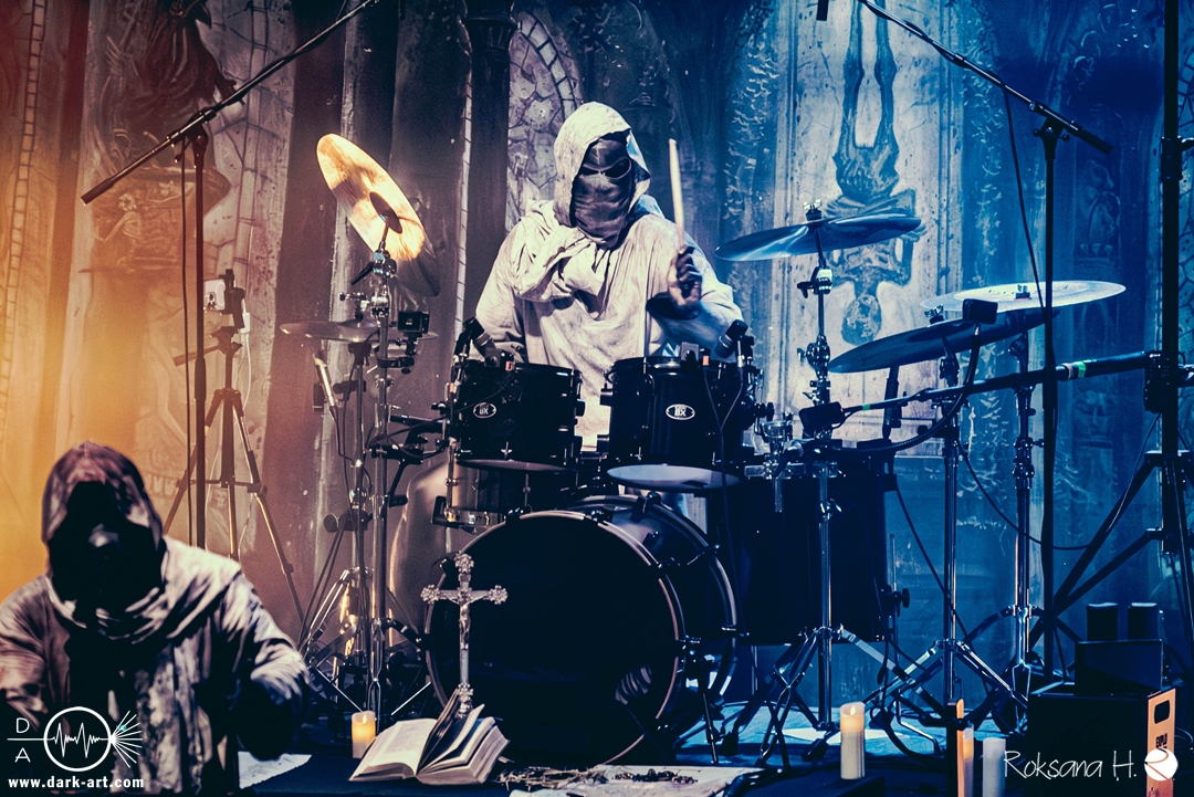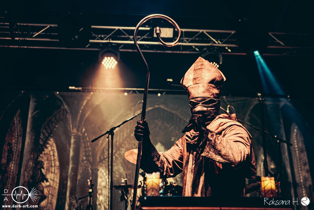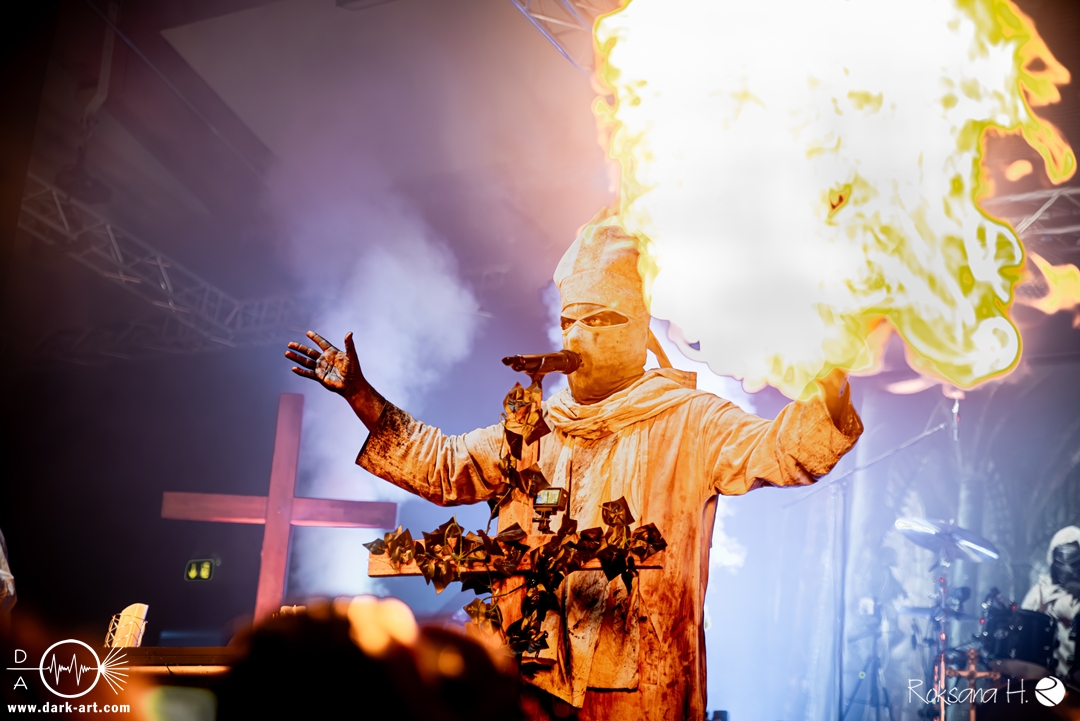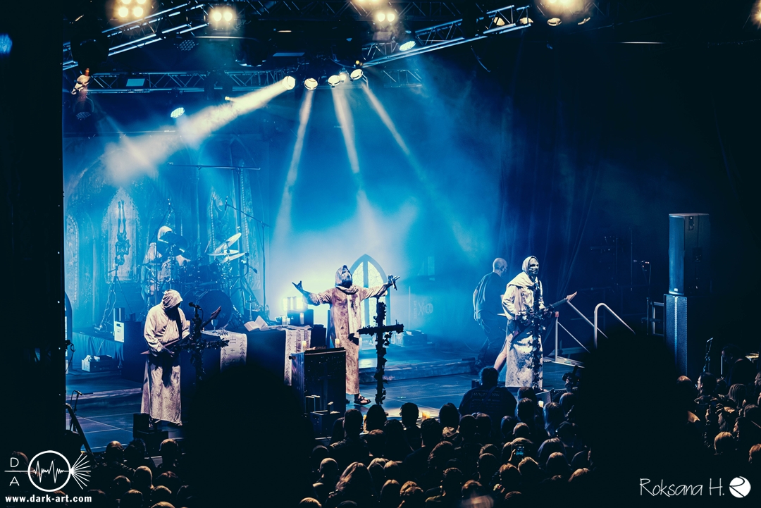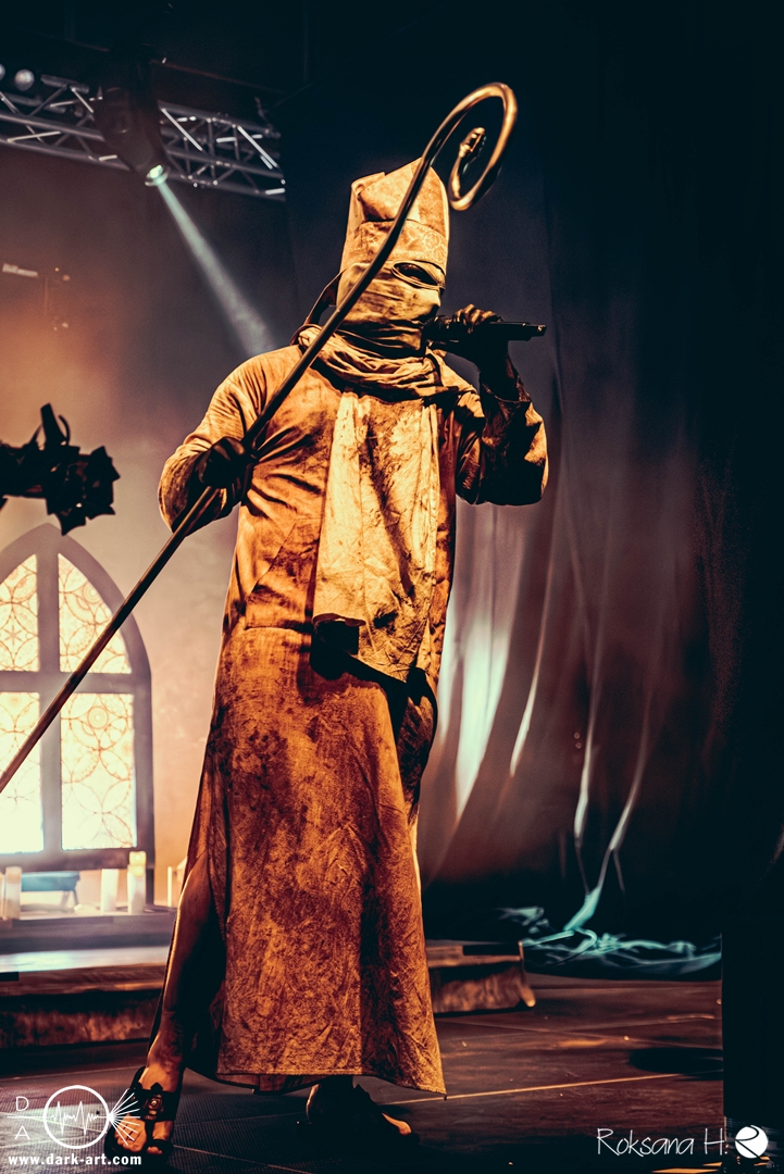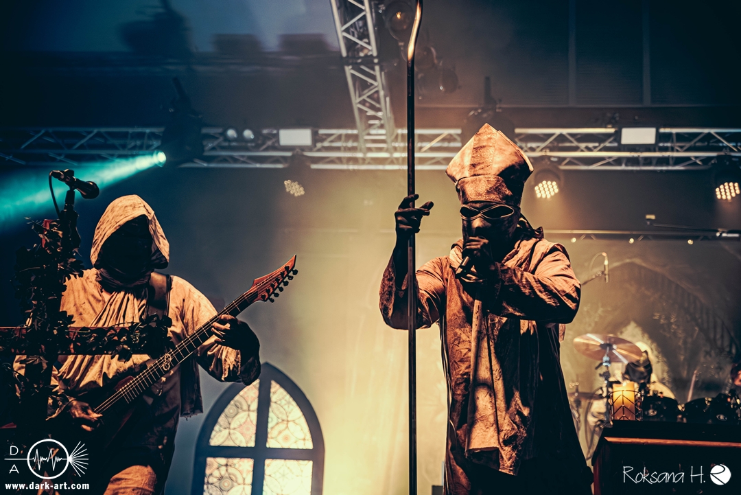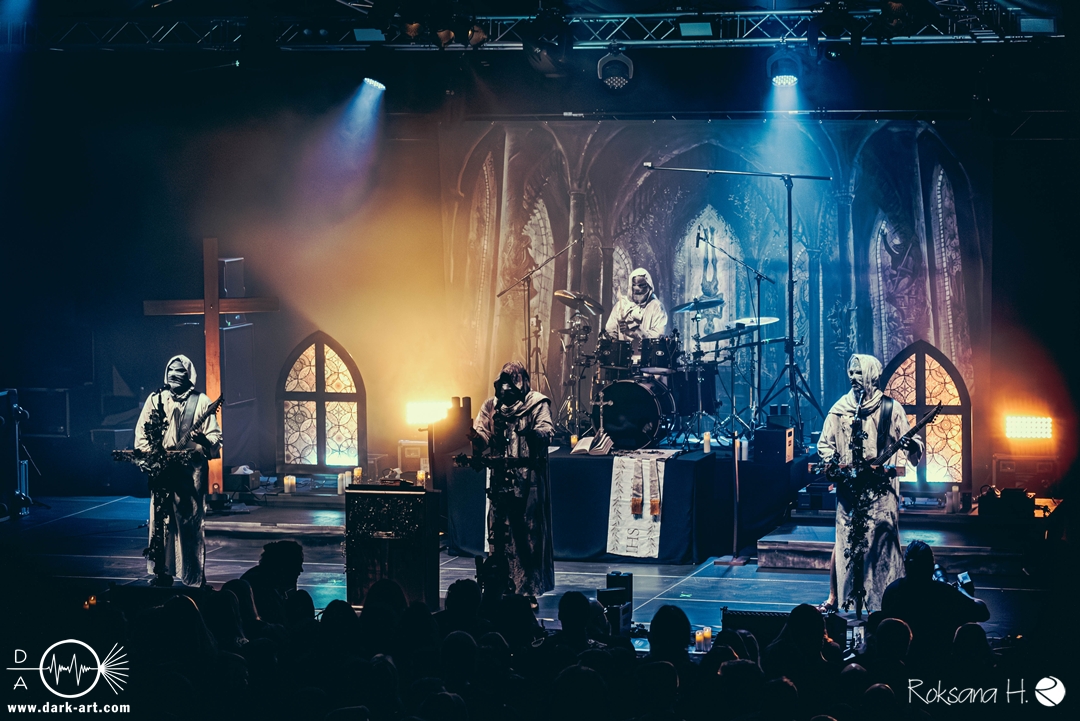 Ob es nun einen Gott gibt, oder, wie der Bandname nahelegt, eben nicht: rein visuell wurden bei Non Est Deus erstmal die ebenso großen wie christlichen Geschütze aufgefahren: Kathedralenbanner als Hintergrund, mehrere Kreuze und Deko nach Art kirchlicher Buntglas-Fenster auf der Bühne, weiße Gewänder (am Sänger samt Mitra und Hütestab), sowie diverse weitere Kirchen-Paraphernalia als Requisiten. Auch im Ablauf der Bühnenshow orientierte man sich an entsprechenden christlichen Ritualen: Es wurde etwa die Predigt aus einer Bibel imitiert und (vor Save Us) die Kommunion an einen Mit-Musiker verteilt, zwischendurch gab es mal ein wenig (angedeutete) Selbst-Geißelung (konsequenterweise bei Flagellation), und am Schluss Glockenläuten. Garniert wurde das Ganze mit auf Rhythmus und Inhalt der Songs abgestimmten Nebel- und Feuerstößen, sowie einer durchaus charismatischen und motivierten Führung durchs „Programm“ durch Noise, dessen teilweise zackige bis grenz-militärische Bewegungen nochmal vergegenwärtigten, dass man den Mann auch von Kanonenfieber kennt. Ähnlich wie dieses Projekt scheint auch Non Est Deus in den letzten Jahren einen ordentlichen Hype zu erfahren: Die Halle war voll und das Publikum begeistert genug, um auch ohne große Motivationsreden von der Bühne mitzugehen, mit zuklatschen, die Hände oder Fäuste zu recken, oder auch mal zu headbangen.
