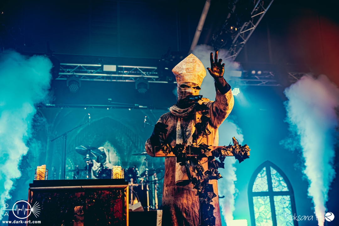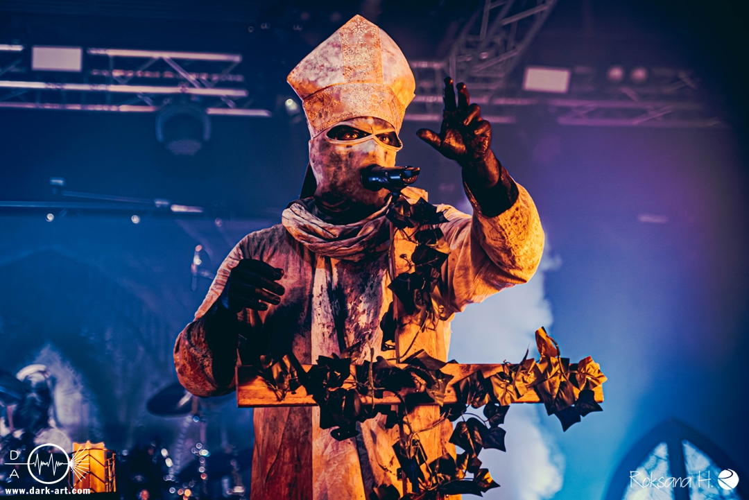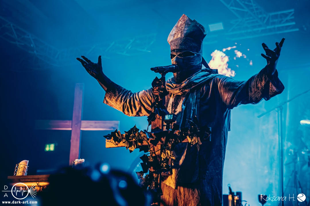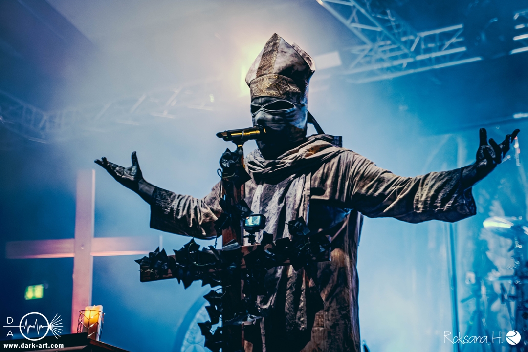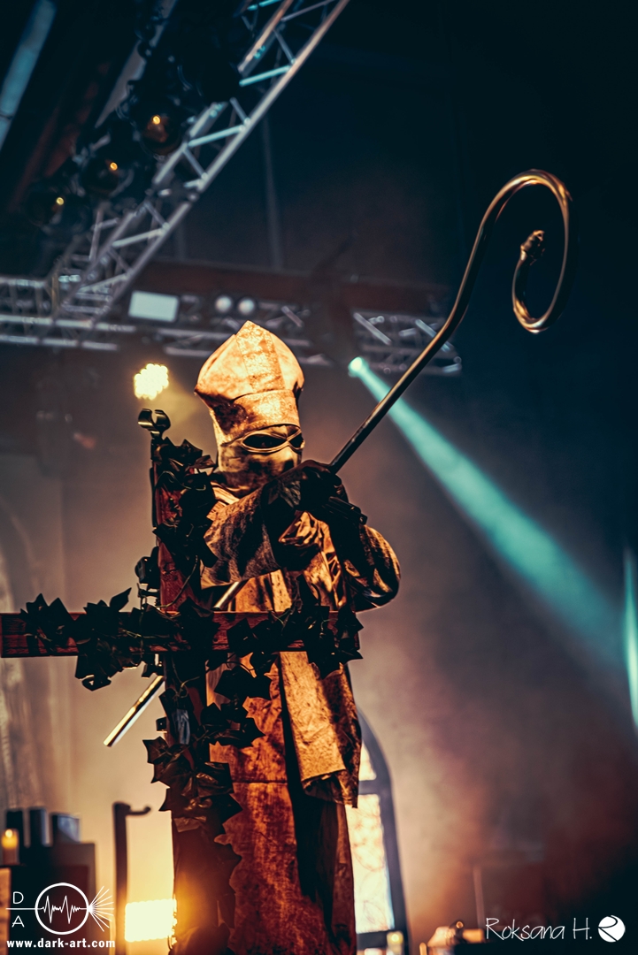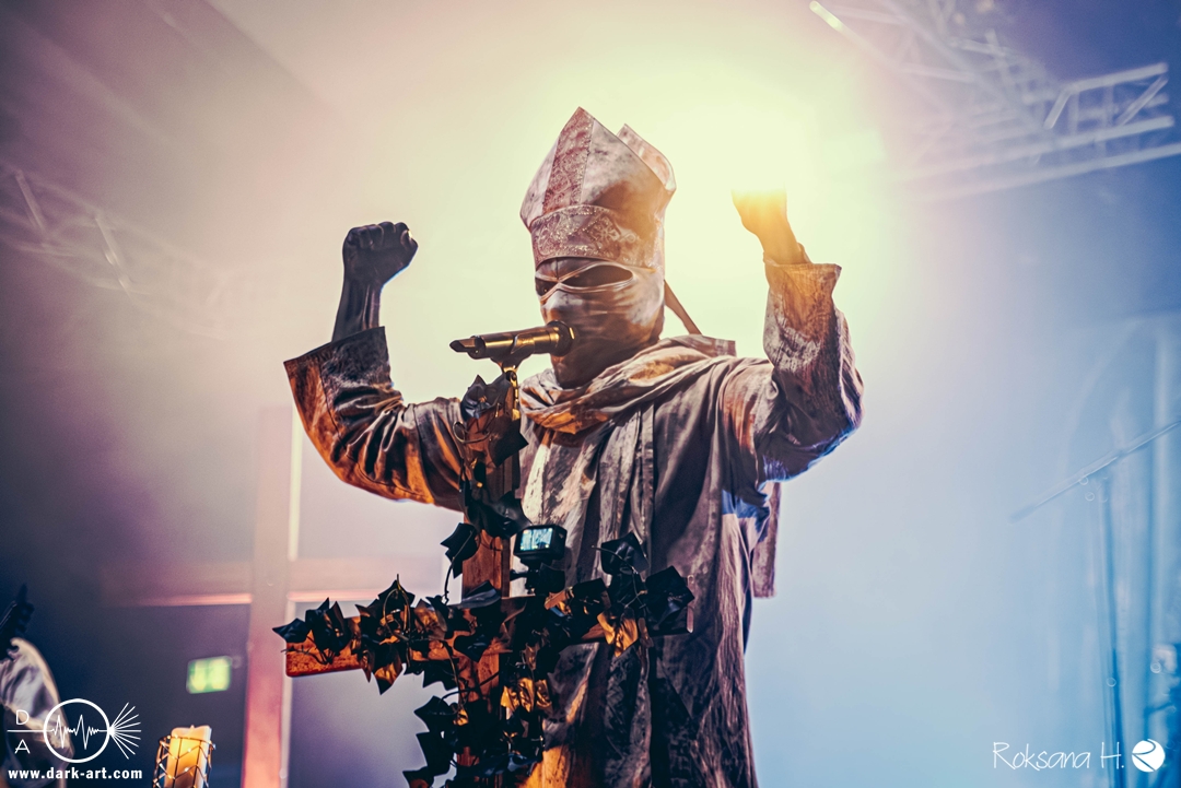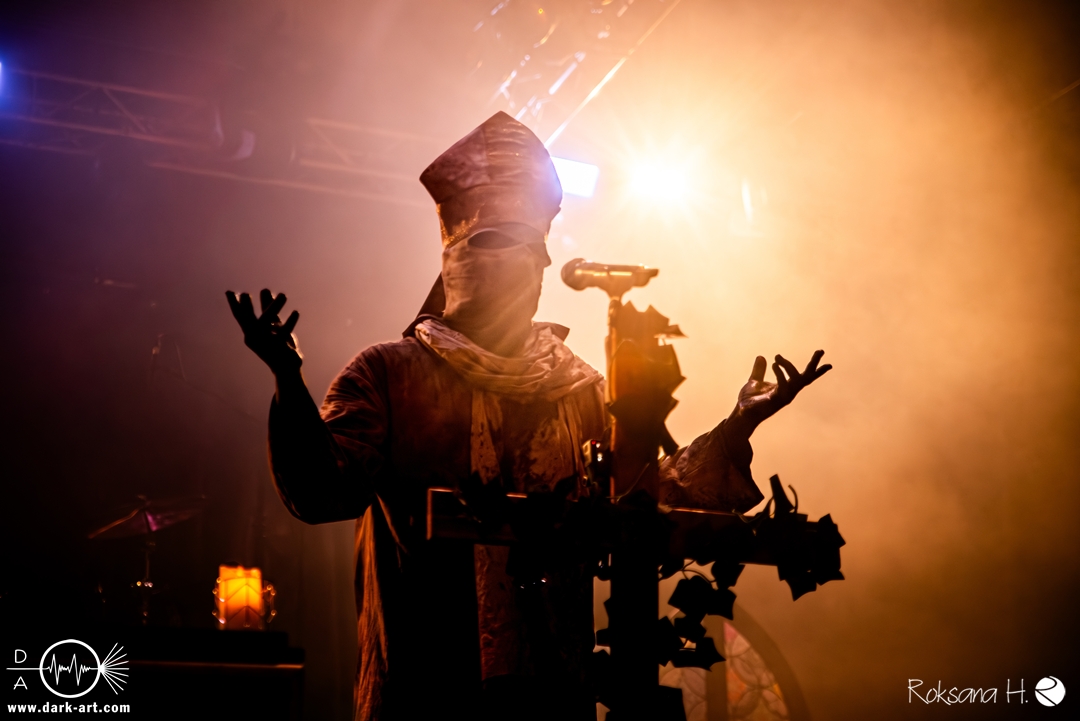 Ob es nun einen Gott gibt, oder, wie der Bandname nahelegt, eben nicht: rein visuell wurden bei Non Est Deus erstmal die ebenso großen wie christlichen Geschütze aufgefahren: Kathedralenbanner als Hintergrund, mehrere Kreuze und Deko nach Art kirchlicher Buntglas-Fenster auf der Bühne, weiße Gewänder (am Sänger samt Mitra und Hütestab), sowie diverse weitere Kirchen-Paraphernalia als Requisiten. Auch im Ablauf der Bühnenshow orientierte man sich an entsprechenden christlichen Ritualen: Es wurde etwa die Predigt aus einer Bibel imitiert und (vor Save Us) die Kommunion an einen Mit-Musiker verteilt, zwischendurch gab es mal ein wenig (angedeutete) Selbst-Geißelung (konsequenterweise bei Flagellation), und am Schluss Glockenläuten. Garniert wurde das Ganze mit auf Rhythmus und Inhalt der Songs abgestimmten Nebel- und Feuerstößen, sowie einer durchaus charismatischen und motivierten Führung durchs „Programm“ durch Noise, dessen teilweise zackige bis grenz-militärische Bewegungen nochmal vergegenwärtigten, dass man den Mann auch von Kanonenfieber kennt. Ähnlich wie dieses Projekt scheint auch Non Est Deus in den letzten Jahren einen ordentlichen Hype zu erfahren: Die Halle war voll und das Publikum begeistert genug, um auch ohne große Motivationsreden von der Bühne mitzugehen, mit zuklatschen, die Hände oder Fäuste zu recken, oder auch mal zu headbangen.