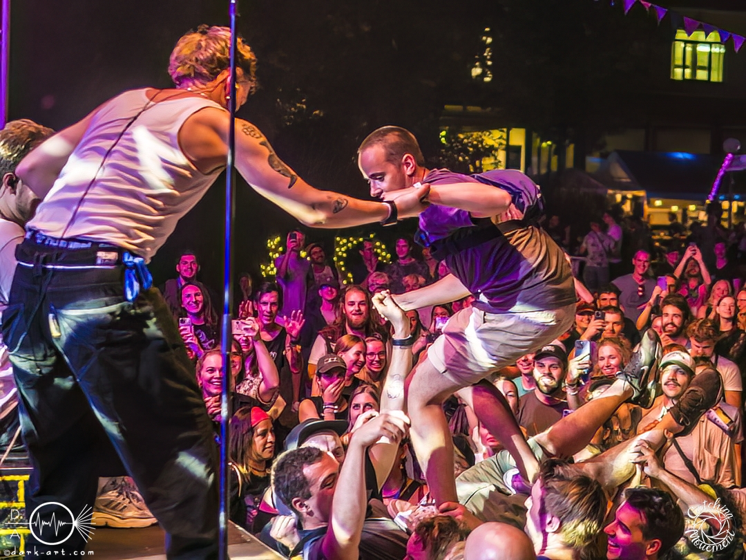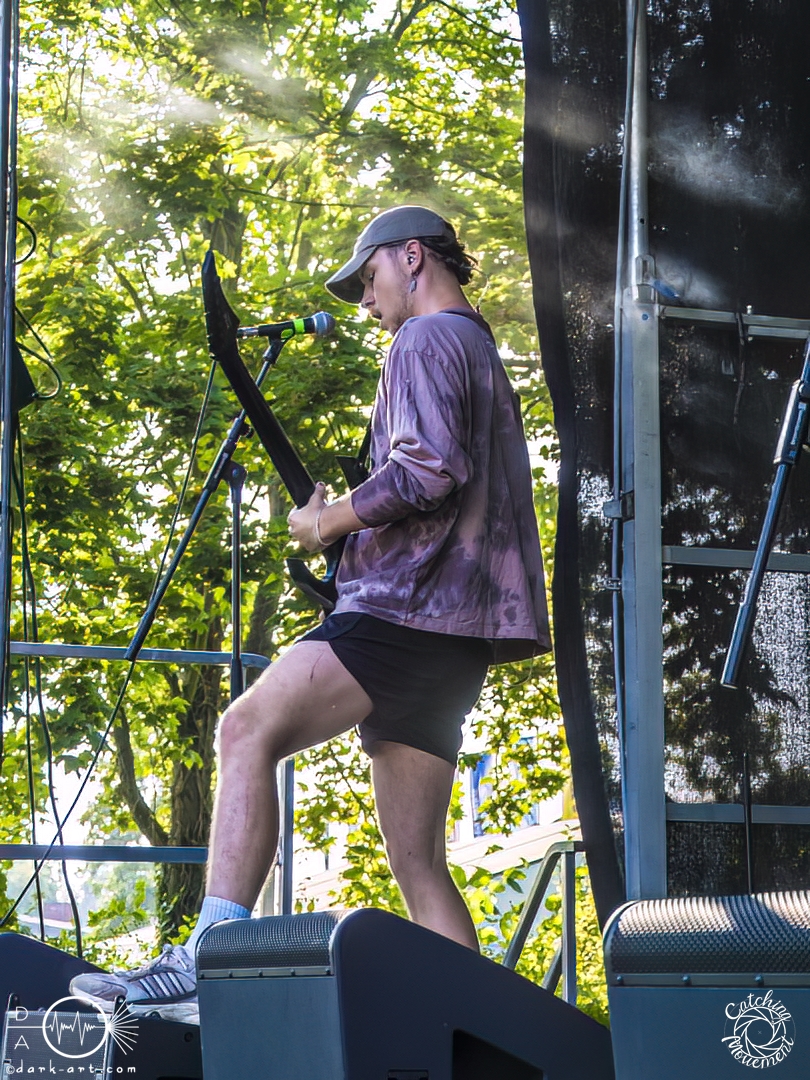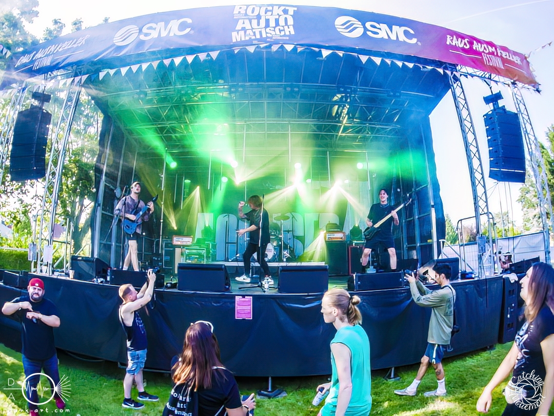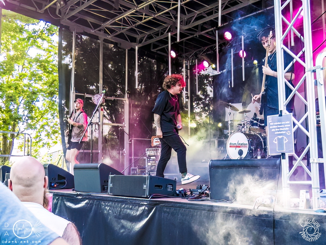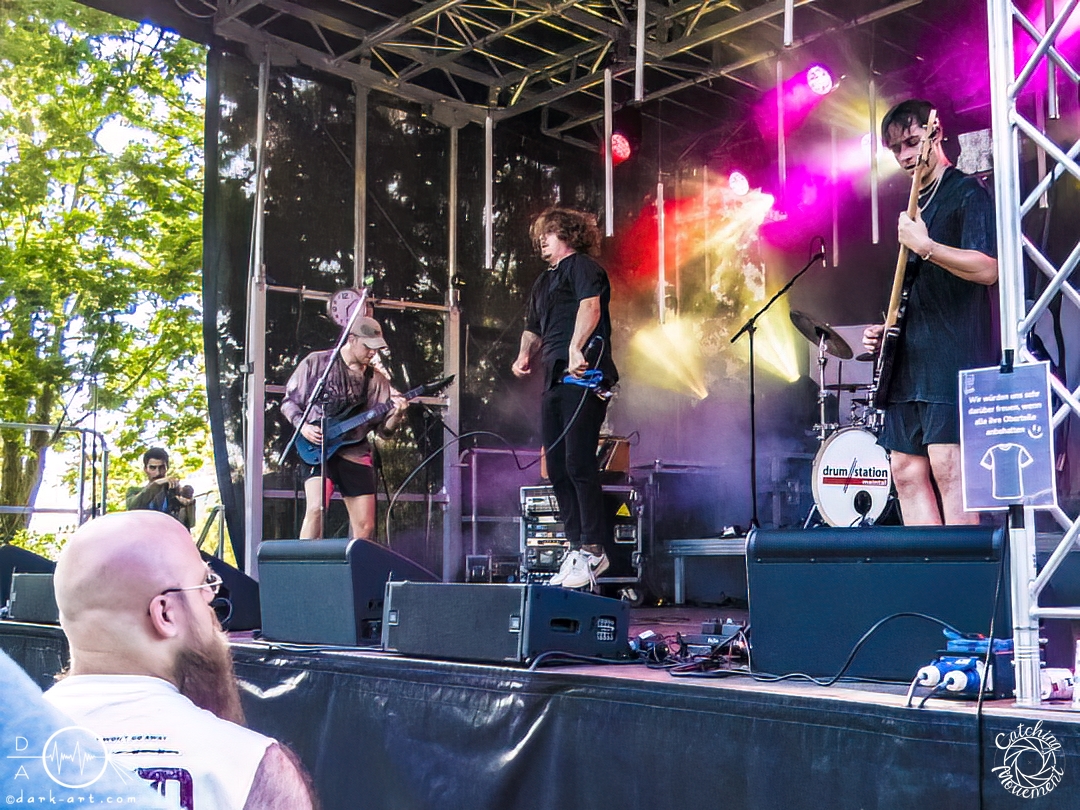 Lief bisher alles glatt, gab es nun zum ersten Mal technische Probleme beim Umbau vor dem Auftritt der Lokalmatadoren Watch me Rise. Mit etwas Verzögerung kamen sie dann aber auf die Bühne und legten direkt los. Auch verzichteten sie auf lange Ansprachen und ließen die Musik sprechen. Bis auf bei Wrong Way. Das Lied widmeten sie Carla und Ellen, eigentlich fester Bestandteil der RAK Crew und selbst Musikerinnen, welche aber seit einem Jahr, nach einer Covid Erkrankung, an ME/CFS erkrankt sind und die meiste Zeit ans Bett gefesselt sind. Ganz große Aktion. Insgesamt lieferten sie auf jeden Fall wieder ab, inklusive Bad in der Menge.
