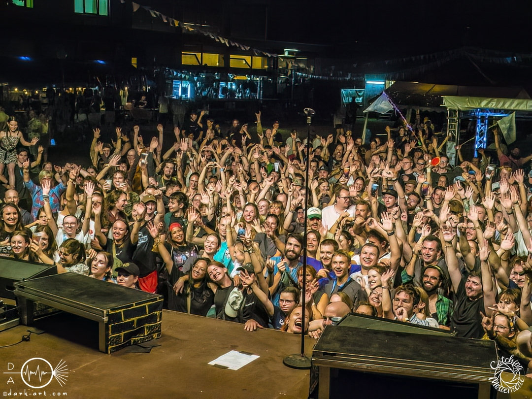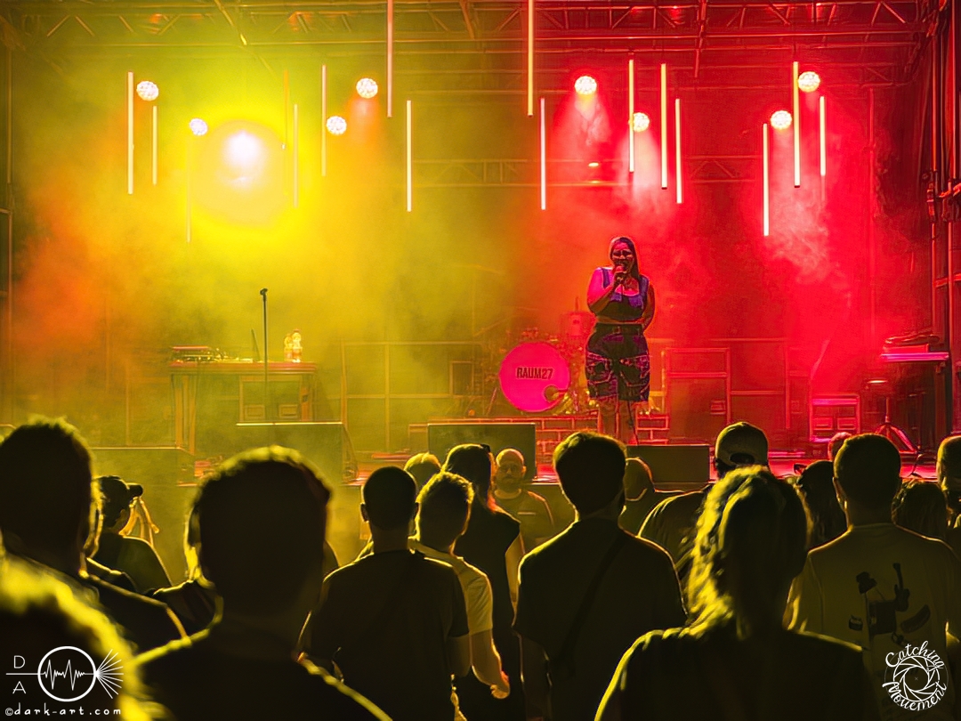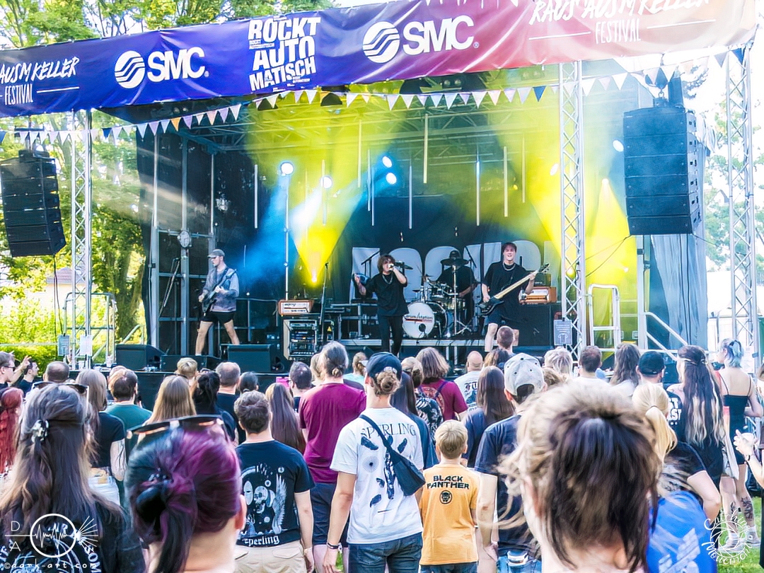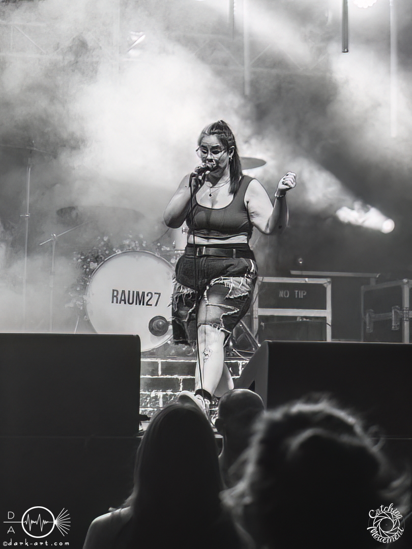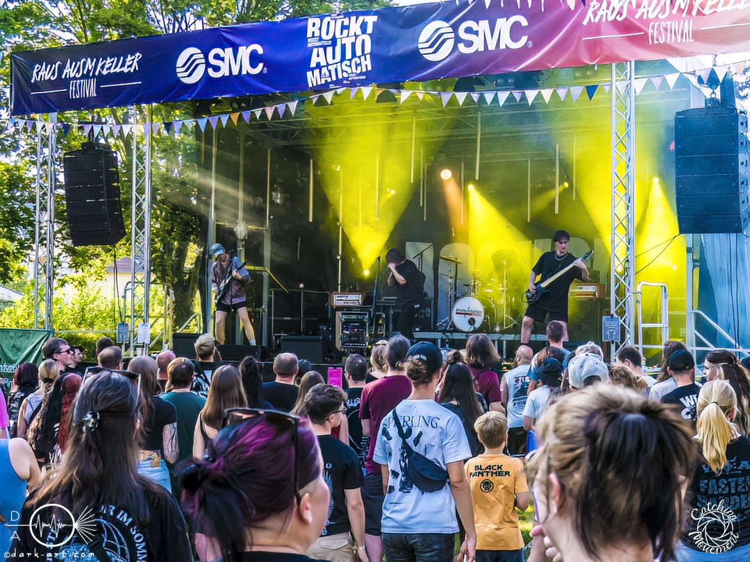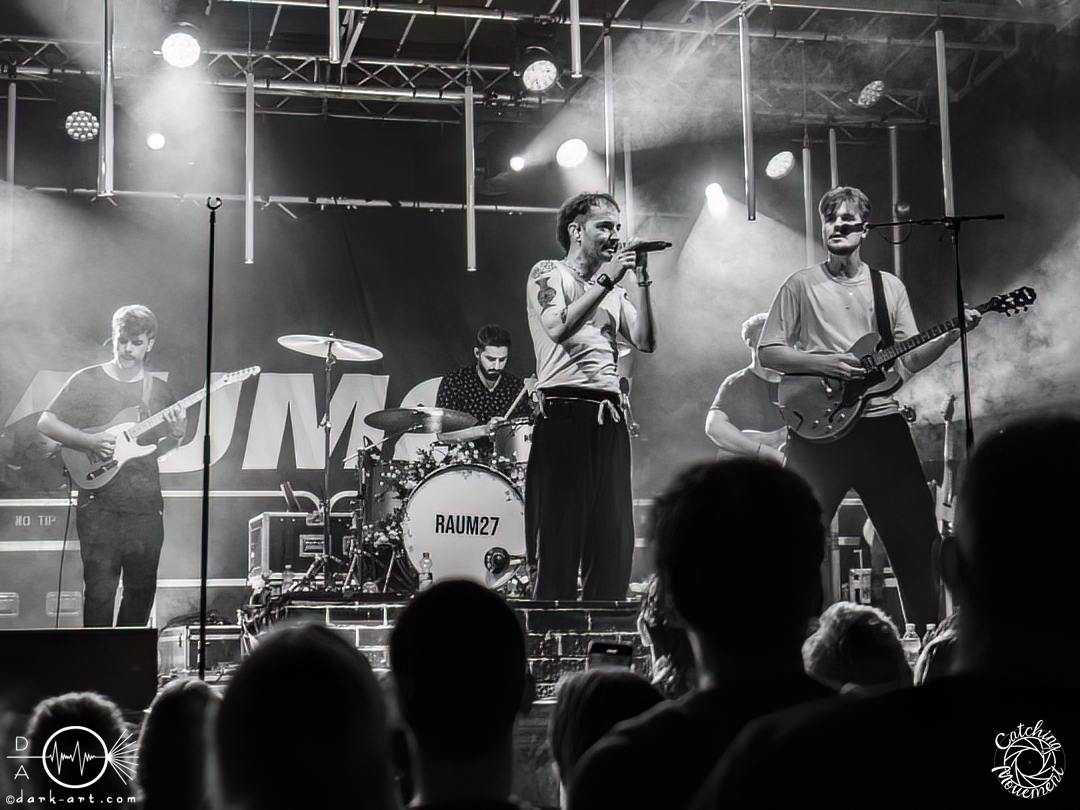 Wie vor zwei Jahren durfte Raum27 den Tag abschließen. Diesmal allerdings als Headliner und somit deutlich mehr Spielzeit. Diese wussten sie zu nutzen und man merkte ihnen nicht an, dass sie am selben Tag schon auf dem Rock am Beckenrand ein Gig gespielt haben und danach eine ca. dreistündige Autofahrt auf sich genommen haben, um auf beiden Festivals spielen zu können. Das selbe dachten sich auch zwei Fans, welche dasselbe Spiel mitmachten und von Tristan mit den freudigen Worten „Ich weiß ja nicht, was mit euch los ist, aber die zwei hier waren auch beim Rock am Beckenrand“ begrüßt wurden. Zumindest der Auftritt auf dem Raus ausm Keller hat sich gelohnt. Viel Action, Sprünge von Tristan, Herzschmerz, viel Humor und wichtige, aber korrekte Aussagen zeichneten den Auftritt aus. Ein Highlight kam allerdings aus den Zuschauern, als ein Crowdsurfer auf einem menschlichen Surfbrett zur Bühne surfte und Tristan und die Band damit so überraschte, dass sie das laufende Lied unterbrachen. Alles in allem war es ein würdiger Abschluss des Tages, welcher dann endgültig mit einem Festival Crowdphoto, sowie der ersten Band Ankündigung in Form von Kind Kaputt abgeschlossen wurde.
