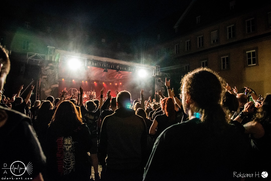 Pünktlich war es dann soweit. Dornenreich, eine Band, welche die Gemüter scheidet, betraten die Bühne. Schon seit nunmehr über 20 Jahren begeistern sie ihre Fans mit einer Mischung aus Black- und Dark Metal Songs, in denen auch immer wieder gesprochene Passagen vorkommen. Das genau diese Mischung nicht bei jedem ankommt, war vorherzusehen. Einge Besucher trafen sich in den Räumlichkeiten des Kilianeums, trotzdem befanden sich doch noch ein Großteil der Zuhörer draußen im Innenhof, denn Dornenreich lieferten einfach wieder ab. Mit Spielfreude, die ihnen anzusehen war, begeisterten sie die anwesenden Gäste und bewiesen mal wieder, dass sie defintiv auch Headliner tauglich sind. Und damit ging dann auch dieser Festivaltag zu Ende und entließ viele glückliche Menschen, die nach zwei Jahren froh waren, wieder im Kilianeum das Skaldenfest zelebrieren zu dürfen.