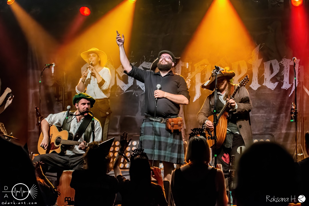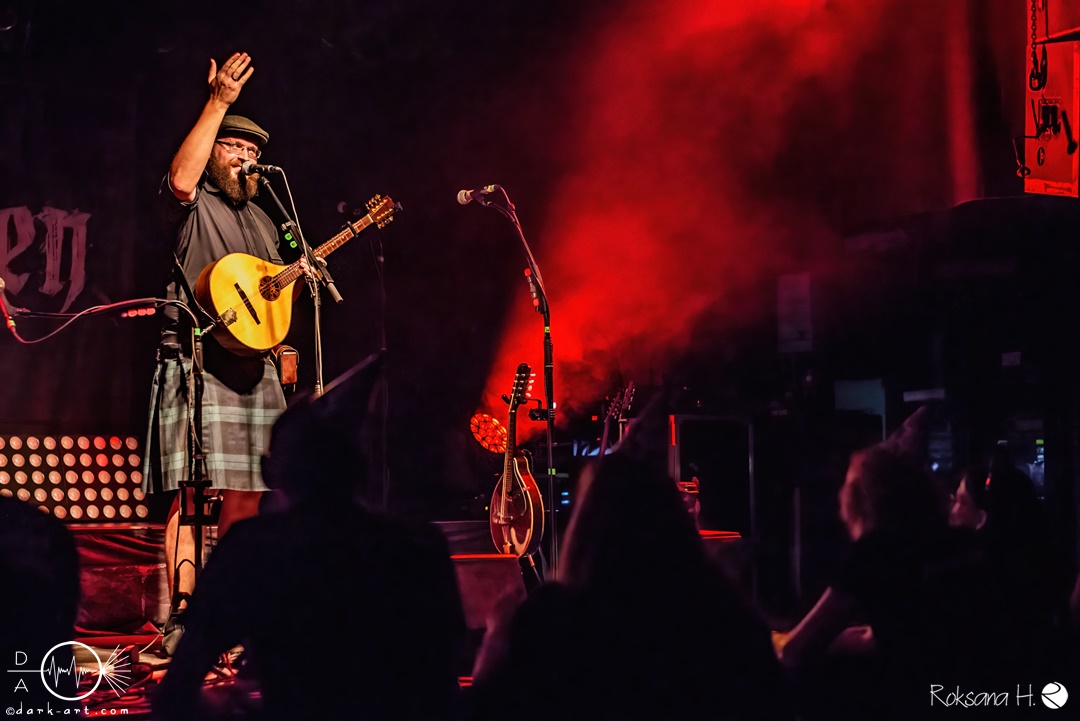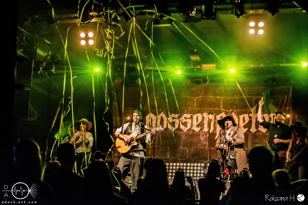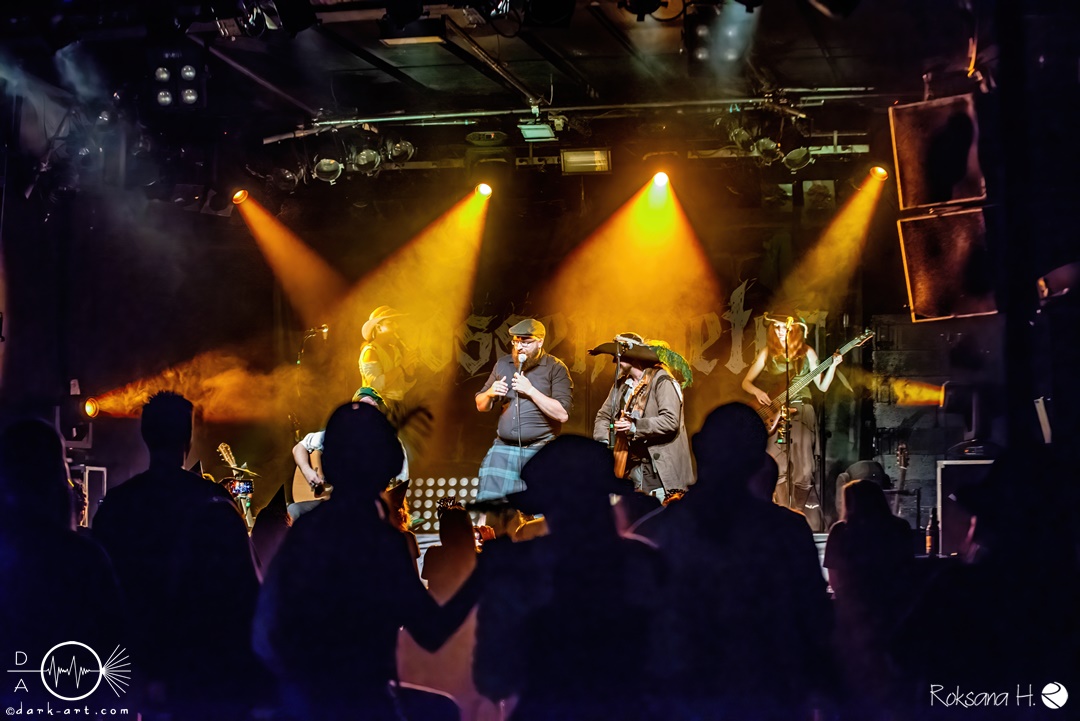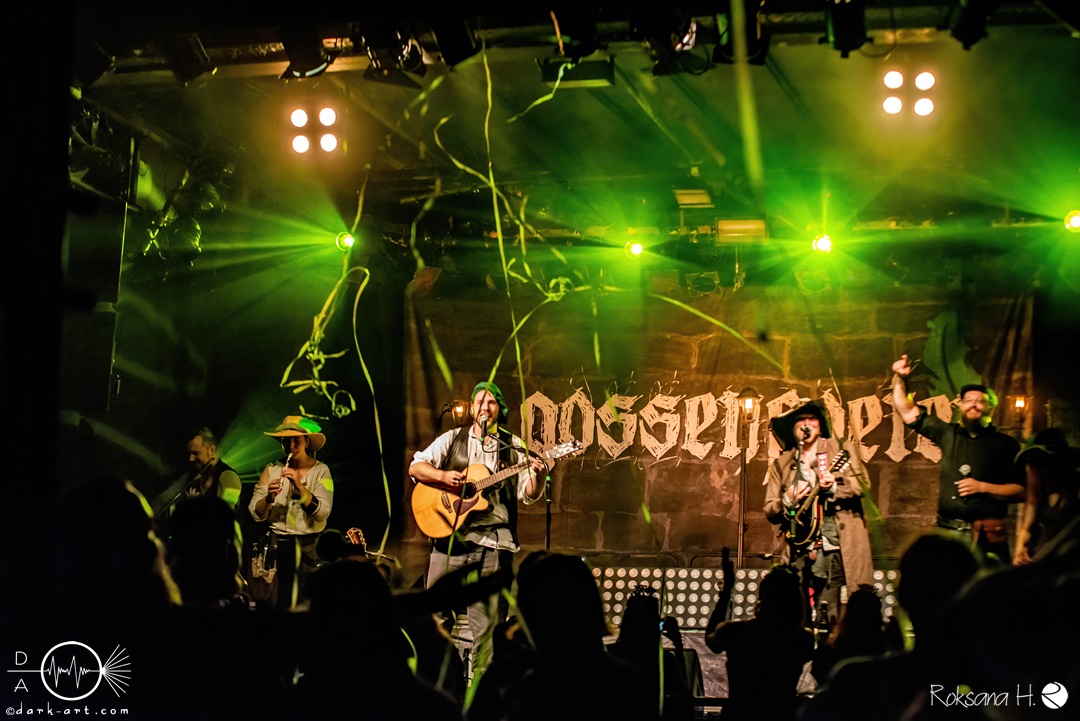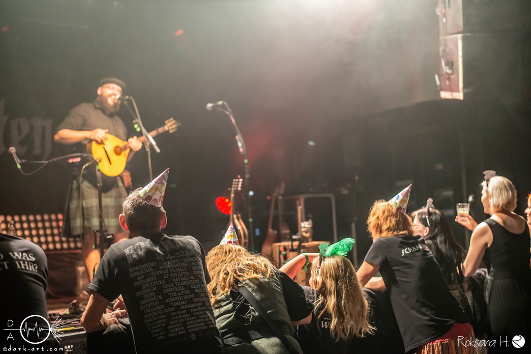 Unter lautem Klatschen betraten die Gossenpoeten zügig die Bühne. Zuerst gab es ein Geburtstagsständchen vom Publikum. Dann legten sie auch schon mit Wir sind Gossenpoeten los. Die begeisterten Zuschauer waren von Anfang an bei der Sache. Schon waren fleißige Ruderer am Boden. Bei ihrem Programm des Abends fingen die Gossenpoeten mit dem ältesten Material an und arbeiteten sich chronologisch zu den neuesten durch. Bei den Ansagen zwischendurch erzählte Darian der Dichter, dass sie bereits jedes Bandjubiläum im Hirsch zelebrierten. Auch forderte er Applaus für die Techniker im Hintergrund. Das Publikum kam der Forderung sehr gerne nach. Beim Trinklied holten sie nochmal den Modest Boozer auf die Bühne. Doch damit nicht genug, bei Geiger kam ein weiterer Überraschungsgast auf die Bühne, Matze von Tir nan Og.