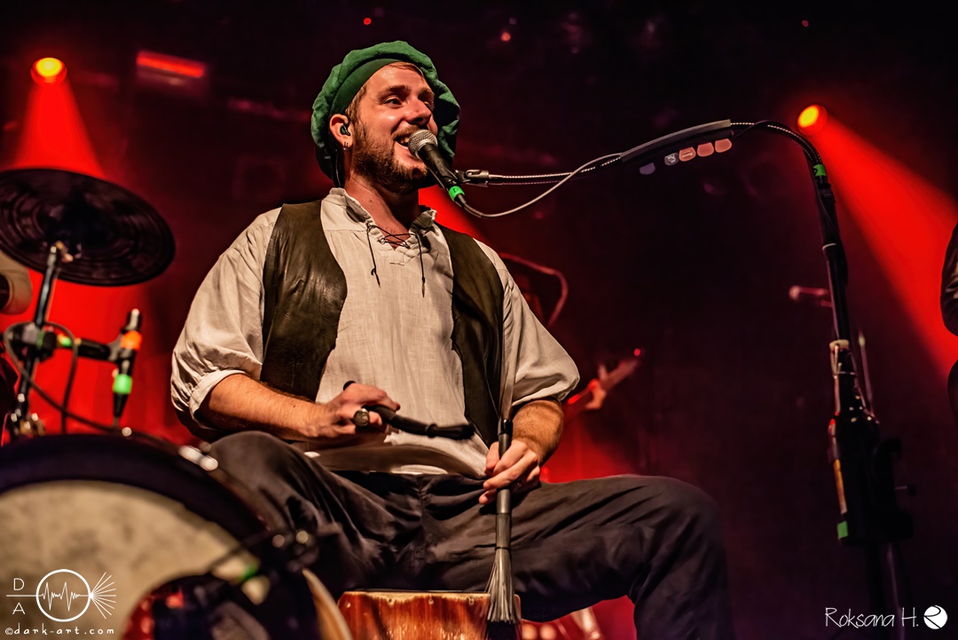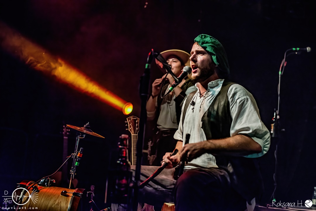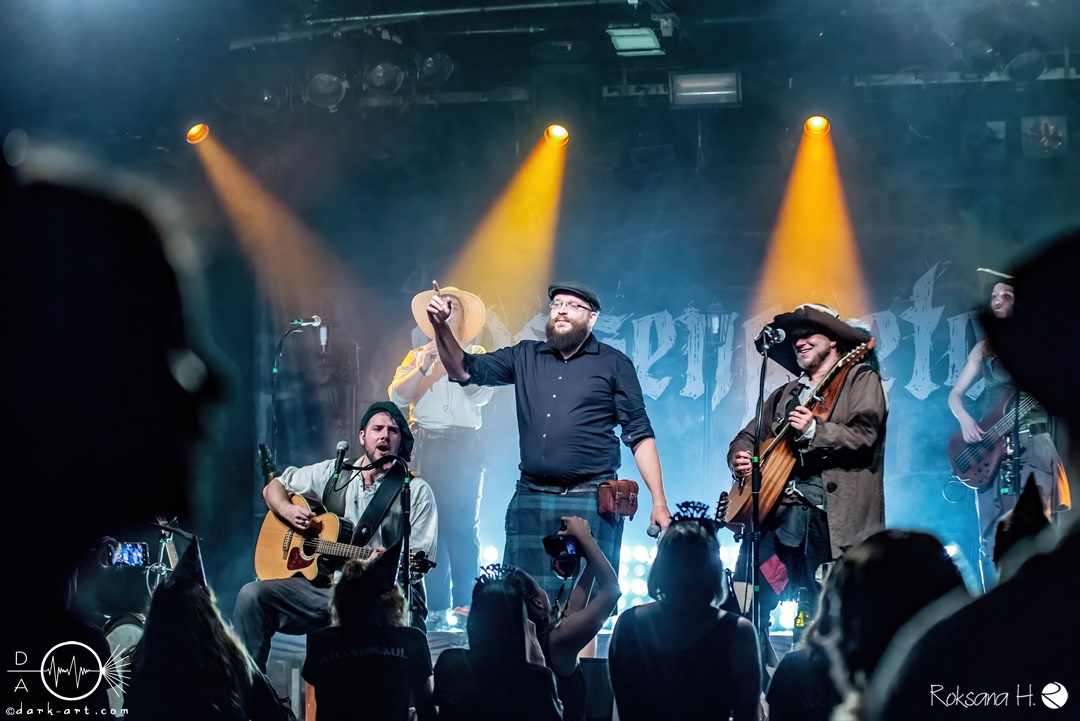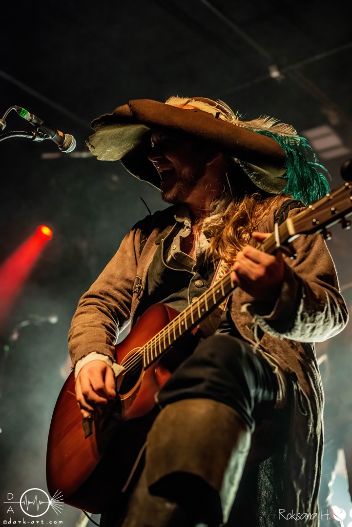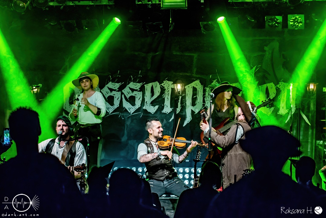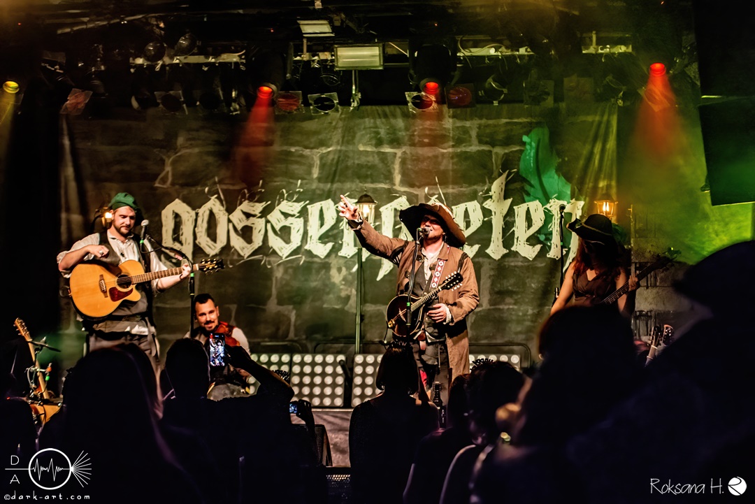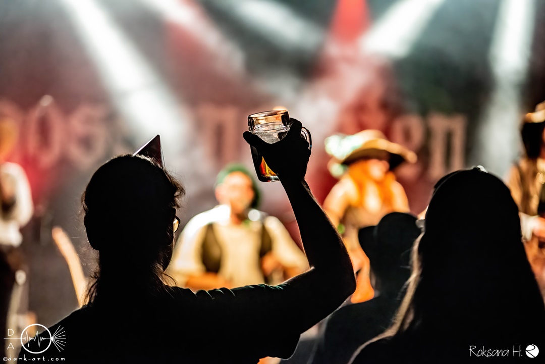 Unter lautem Klatschen betraten die Gossenpoeten zügig die Bühne. Zuerst gab es ein Geburtstagsständchen vom Publikum. Dann legten sie auch schon mit Wir sind Gossenpoeten los. Die begeisterten Zuschauer waren von Anfang an bei der Sache. Schon waren fleißige Ruderer am Boden. Bei ihrem Programm des Abends fingen die Gossenpoeten mit dem ältesten Material an und arbeiteten sich chronologisch zu den neuesten durch. Bei den Ansagen zwischendurch erzählte Darian der Dichter, dass sie bereits jedes Bandjubiläum im Hirsch zelebrierten. Auch forderte er Applaus für die Techniker im Hintergrund. Das Publikum kam der Forderung sehr gerne nach. Beim Trinklied holten sie nochmal den Modest Boozer auf die Bühne. Doch damit nicht genug, bei Geiger kam ein weiterer Überraschungsgast auf die Bühne, Matze von Tir nan Og.