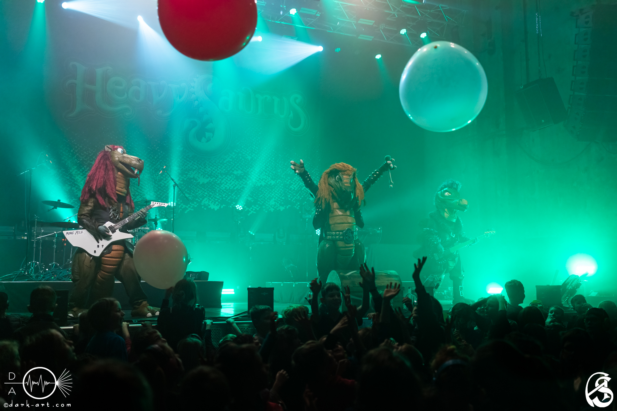 Die musikalische Ausbildung der Jüngsten ging in die nächste Runde, mit Gesangsunterricht. So sollte lautstark Lalala gesungen werden, um sich auf das nächste Lied einzustimmen. Es folgt eine eigene Version von So ein schöner Tag von Tim Toupet mit den Namen Heavysaurus Tag. Gut, ist eigentlich ein Ballermann Hit, aber dank der E-Gitarre und die Drums konnte ich gerade so ein Auge zu drücken. In der Halle herrschte Puristen-freie-Zone und niemand wollte einen Spielverderber in Kutte sein. Die Kinder bekamen zu dem Lied auch große Ballons zum Spielen und bald waren die Erwachsene beschäftigt die Ballons wiederholt zu den Jüngsten zu schubsen. Die nächste Ansage hatte wieder einen pädagogischen Anstrich, immerhin ging es Toleranz. Egal, ob groß, klein, Mensch oder Dino (oder Drache) alle in der Halle waren Dino-Metal-Fans und das verbindet halt. Dies war der Auftakt zum Abschluss des Konzertes mit dem Lied Dino Metalheads. Nach einem Gruppenfoto, samt (etwas unpädagogischen) Ameisenscheiße-Ruf, verließen die Dinos die Bühne.