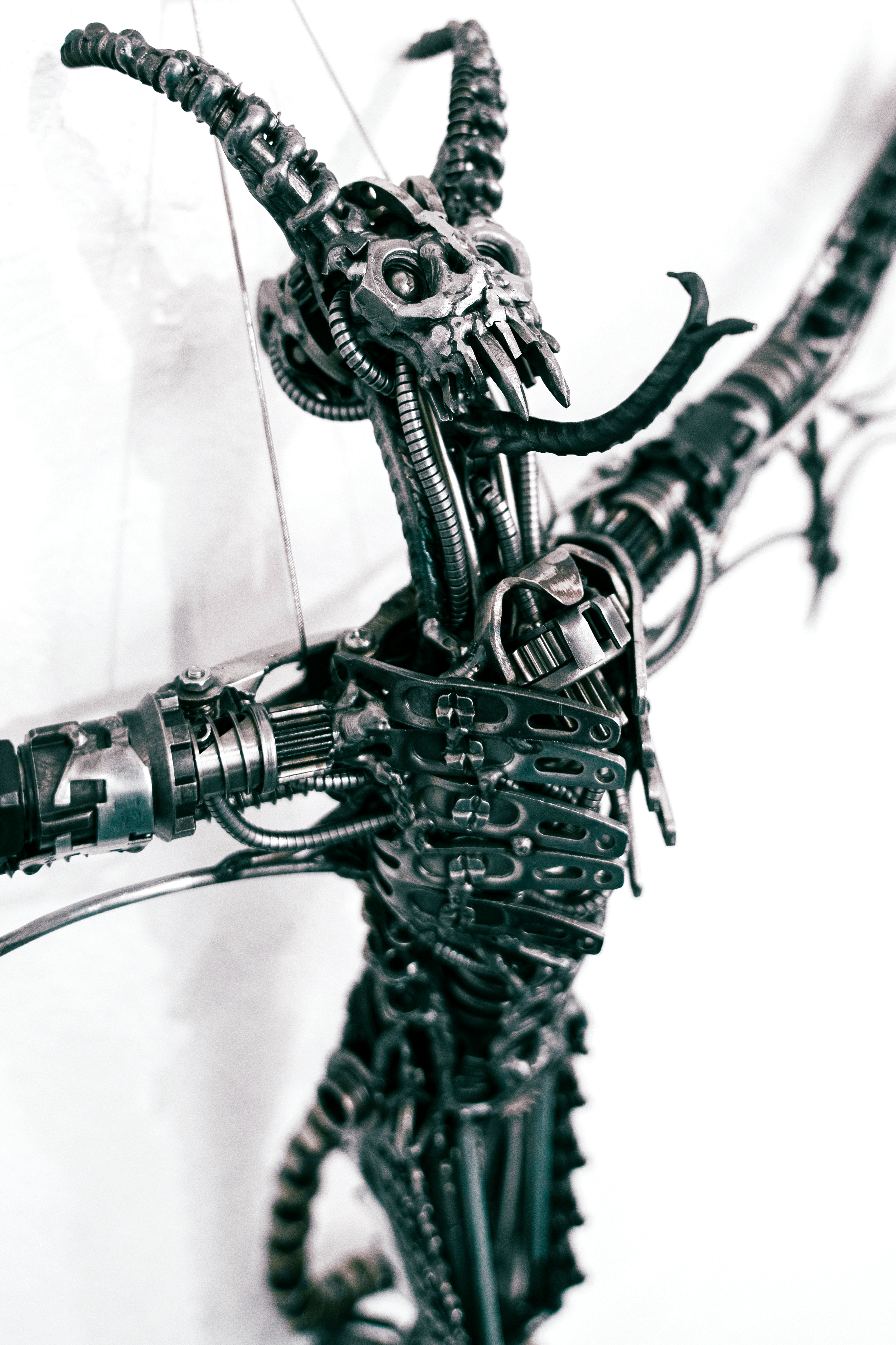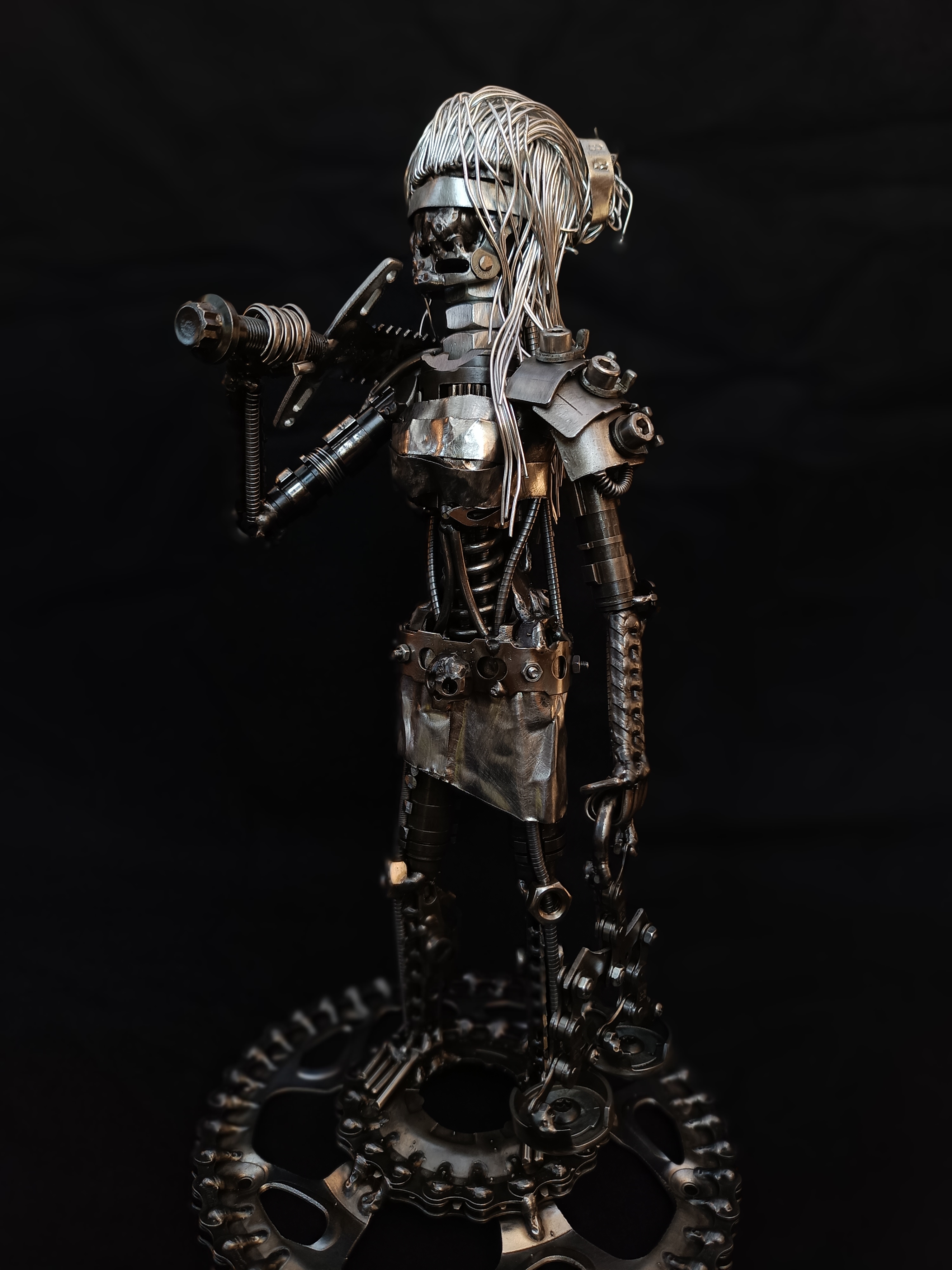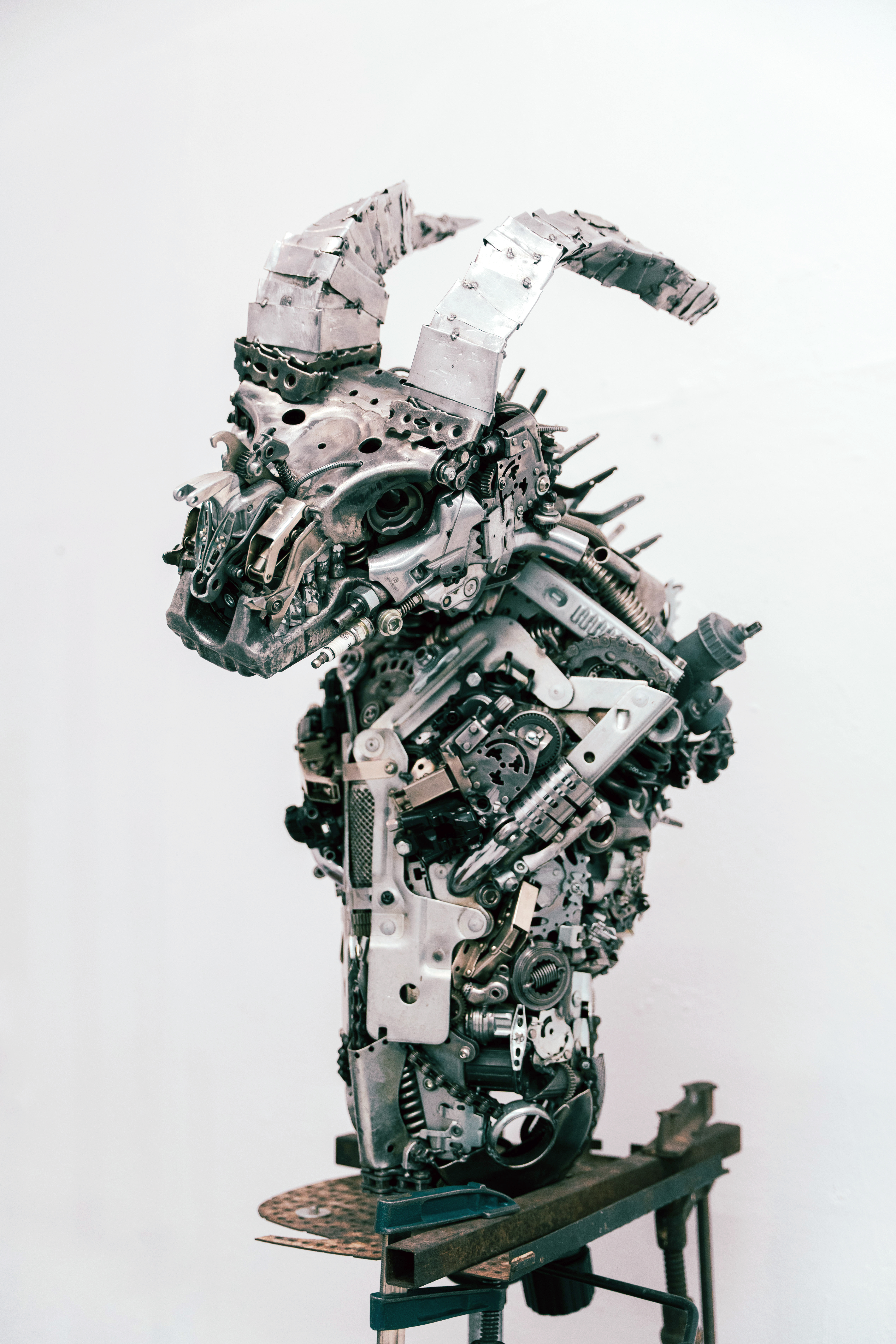 Wie bereits erwähnt, weiß ich nicht direkt wo ich meine Ideen hernehme. Oft hab ich aber eine Art Gefühl, einen Ausdruck, eine Geste, eine Ausstrahlung o. ä., die ich versuche in eine Skulptur einfließen zu lassen. Es kommt vor, dass ich in eine meiner dutzend Schrottkisten schaue und direkt ein Gesicht sehe, das mich anschaut. Ein bisschen Inspiration kommt natürlich auch durch Medien wie z.B. Horror, Sci-fi, Fantasy-Filme/-Bücher/-Serien. Außerdem durch Musik. Manche Melodien und Rhythmen geben oft einen kreativen Impuls.