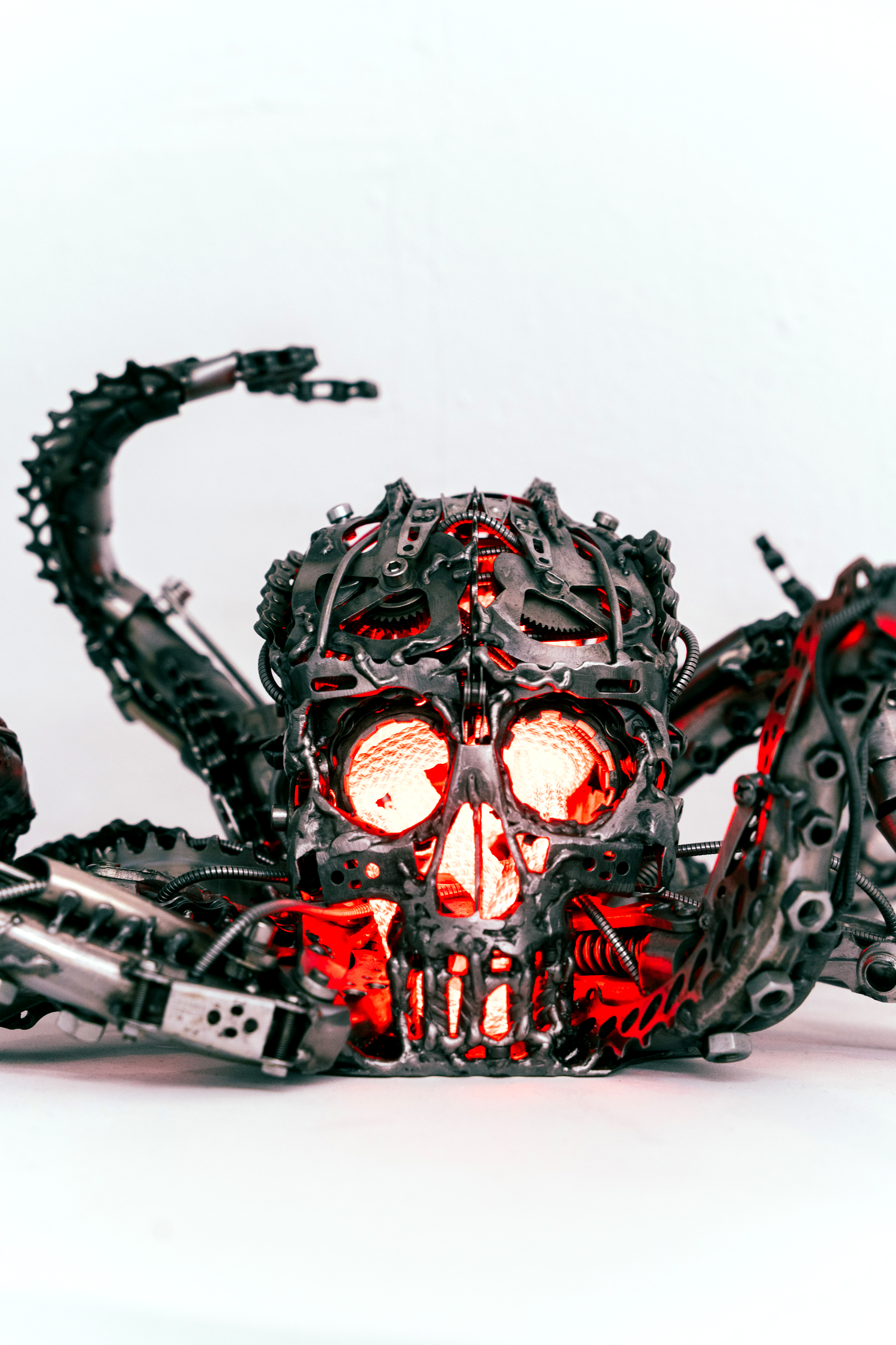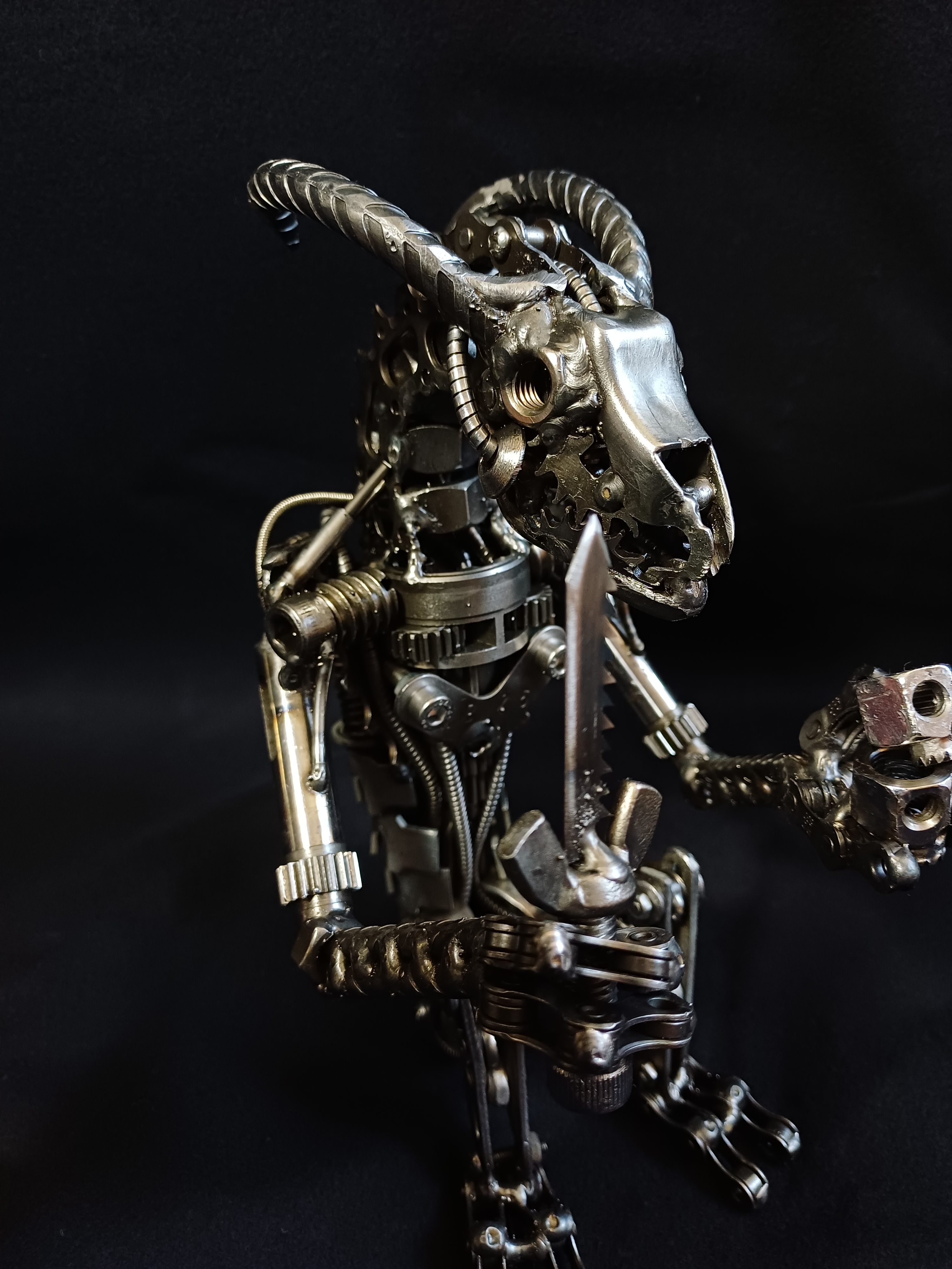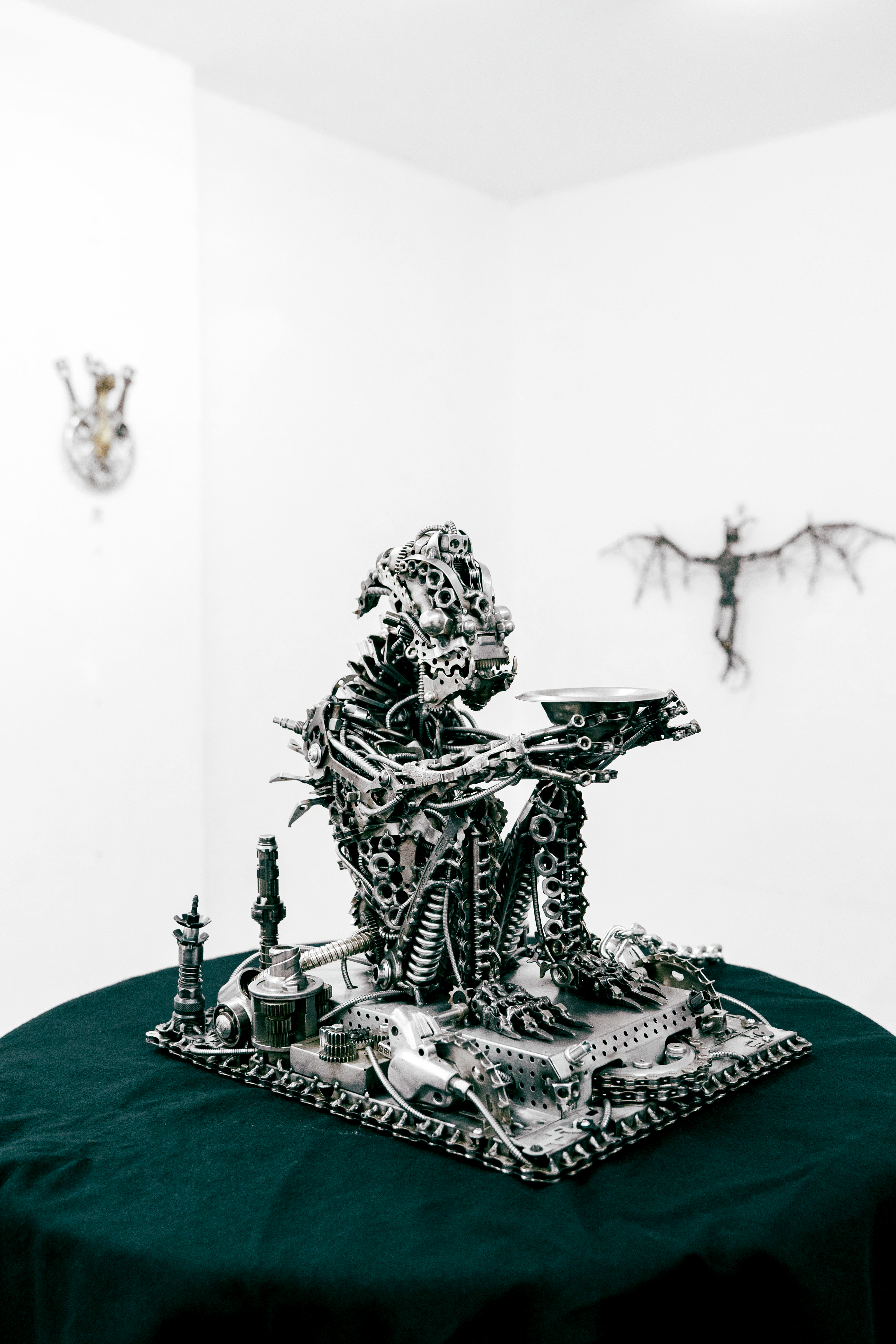 Wie bereits erwähnt, weiß ich nicht direkt wo ich meine Ideen hernehme. Oft hab ich aber eine Art Gefühl, einen Ausdruck, eine Geste, eine Ausstrahlung o. ä., die ich versuche in eine Skulptur einfließen zu lassen. Es kommt vor, dass ich in eine meiner dutzend Schrottkisten schaue und direkt ein Gesicht sehe, das mich anschaut. Ein bisschen Inspiration kommt natürlich auch durch Medien wie z.B. Horror, Sci-fi, Fantasy-Filme/-Bücher/-Serien. Außerdem durch Musik. Manche Melodien und Rhythmen geben oft einen kreativen Impuls.