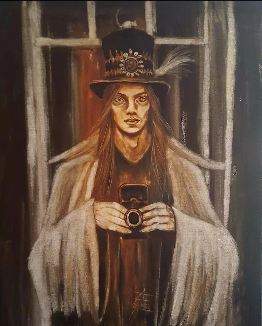 Inspiration ist mein roter Faden. Ich folge ihm, bedingungslos und meistens auch sofort. Kein Aufschieben auf irgendwann. Wenn es mich inspiriert, halte ich es fest, ist ja im Zeitalter des Handys auch nicht schwer. Wenn mich in einer Ausstellung, in einem Film, auf der Straße oder im persönlichen Umfeld jemand oder etwas inspiriert, dann setze ich es früher oder später in einem Bild um. Einmal hat mir mein Sohn am Frühstückstisch, er war etwa 12 Jahre alt, von seinem Alptraum erzählt. Er beschrieb ihn ganz genau und ich sagte zu ihm, diesen Traum werde ich malen. Was ich auch tat und er freute sich. Ich habe gerade für meine “Dark Art” Bilder oft nur eine vage Vorstellung, eine Phantasie oder eine Erzählung. Dann male ich erstmal die ganze Leinwand schwarz mit wasserlöslicher Ölfarbe und dann setzte ich mit einem nassen Lappen Lichter und komponiere das Bild, je nachdem, was mir so erscheint. Das würde ich eher als unterbewussten, magischen Realismus bezeichnen.