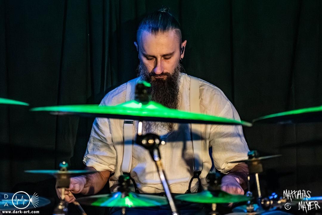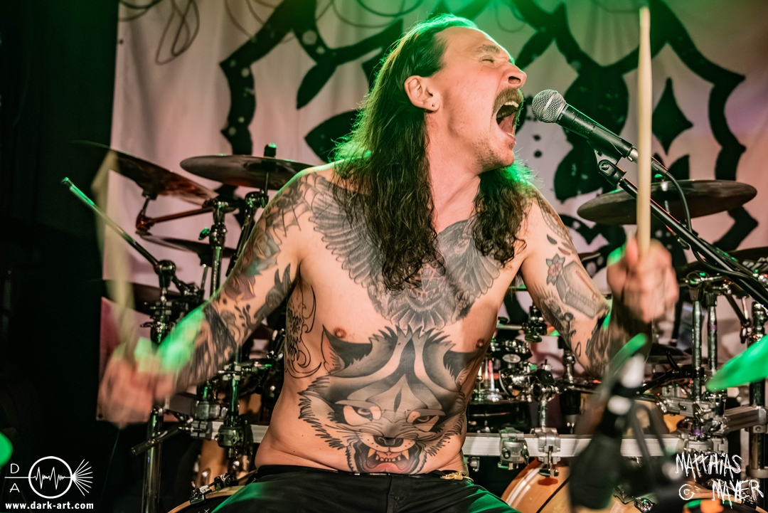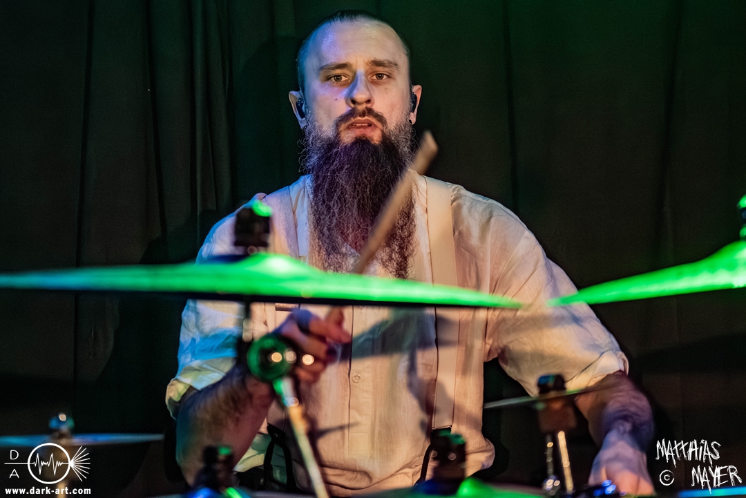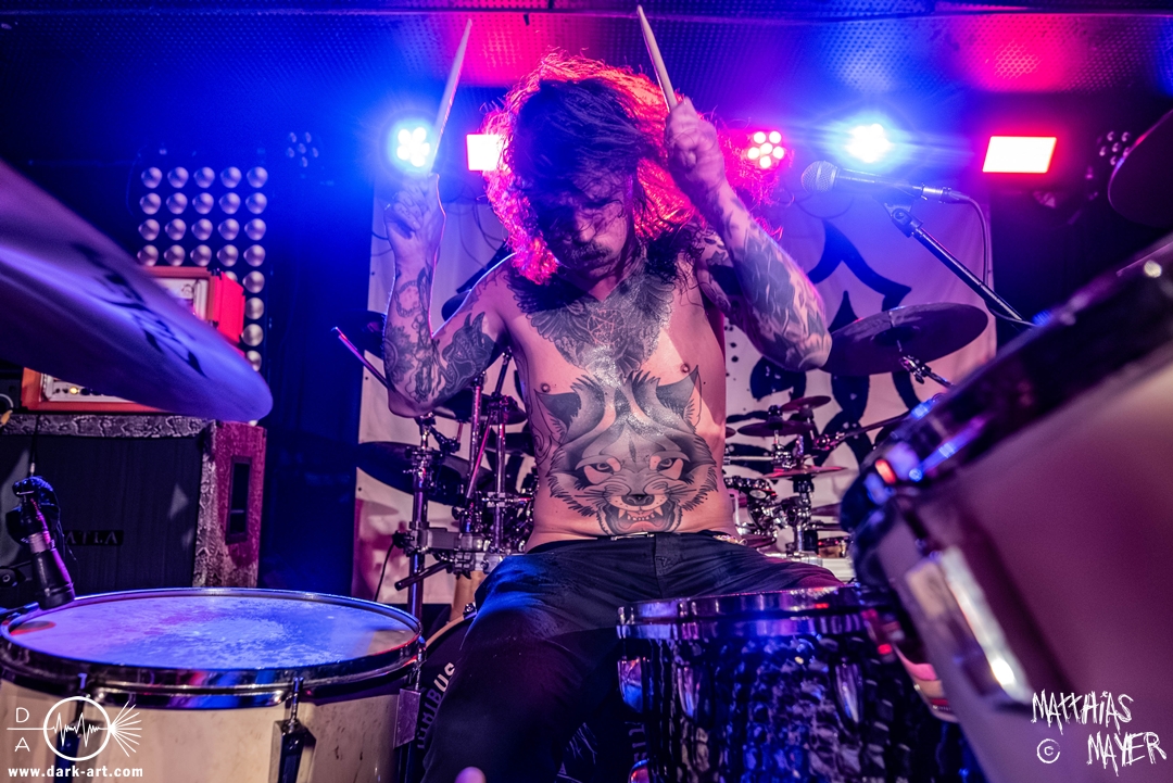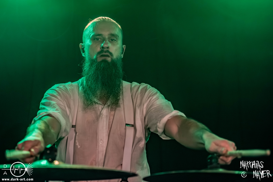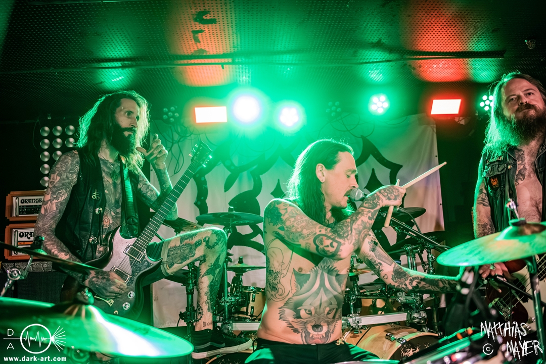 Schon bevor Katla die Show begann, zeigte sich ein ungewöhnlicher Bühnenaufbau, denn vorne stand zentral ein zweites Schlagzeug, denn Rasmus Bang übernimmt sowohl den Leadgesang als auch das Schlagzeug. Im Verlauf von sechs Songs präsentiere das Trio aus Dänemark einen sehr starken drückenden Sound, der gut beim Publikum ankam. Neben Musik mit klarer Message gab es aber auch eine klare politische Kante in den Ansagen, in denen sich die Band wiederholt gegen Krieg und Tyrannei stellte. Nach der Absage im letzten Jahr freute sich die Band besonders, nun zum dritten Mal zusammen auf Tour gehen zu können, und für den Song Dead Lover wurden sie an diesem Abend auch von Oleksa von 1914 an der zweiten Gitarre unterstützt. Die Musiker freuten sich auch, zurück im Nachtleben zu sein und dass einige Besucher sie schon auf früherer Tour mit Crypta gesehen hatten. Das Set endete mit dem Song Dragonlord, der, wie die Band feststellen musste, in Deutschland für einige ungewollte humorvolle Momente sorgte. Zu Beginn des Songs kippte Rasmus auch noch sein Bier über die Felle, von denen es beim Spielen hochspritzte.