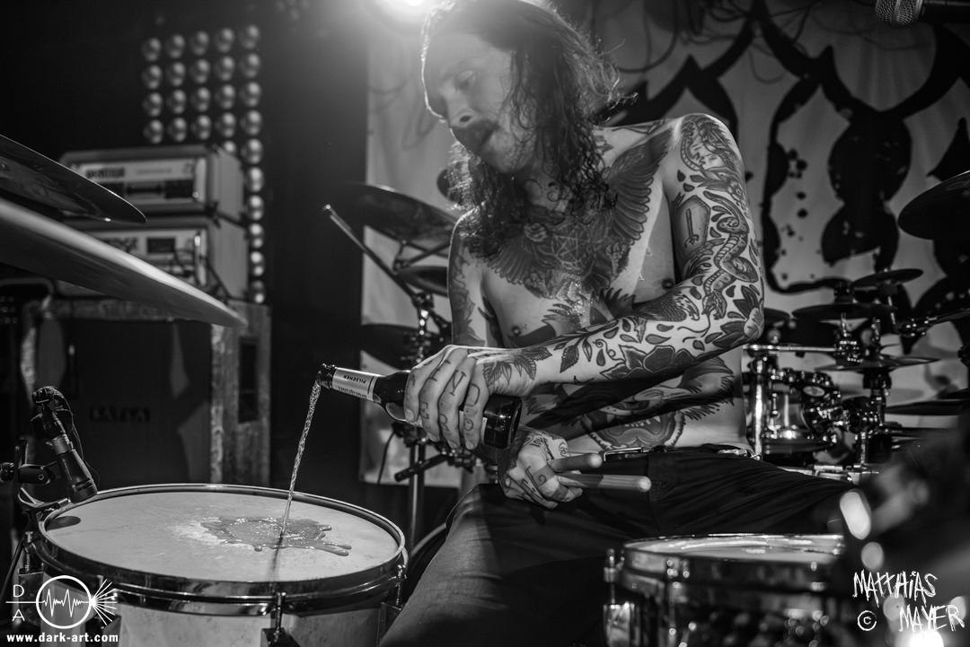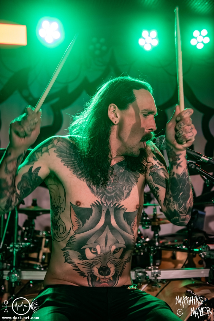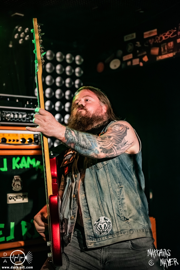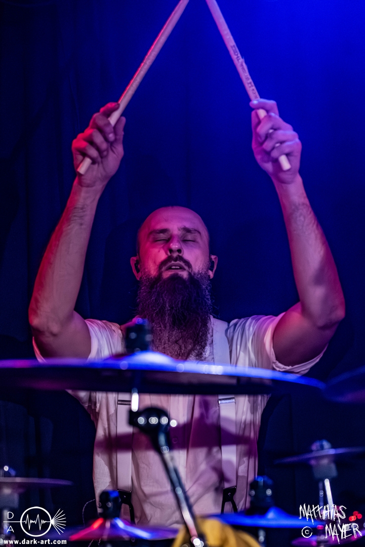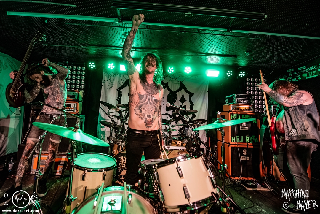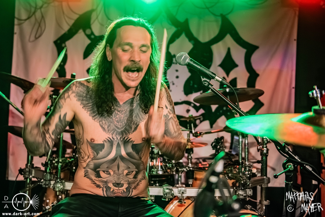 Schon bevor Katla die Show begann, zeigte sich ein ungewöhnlicher Bühnenaufbau, denn vorne stand zentral ein zweites Schlagzeug, denn Rasmus Bang übernimmt sowohl den Leadgesang als auch das Schlagzeug. Im Verlauf von sechs Songs präsentiere das Trio aus Dänemark einen sehr starken drückenden Sound, der gut beim Publikum ankam. Neben Musik mit klarer Message gab es aber auch eine klare politische Kante in den Ansagen, in denen sich die Band wiederholt gegen Krieg und Tyrannei stellte. Nach der Absage im letzten Jahr freute sich die Band besonders, nun zum dritten Mal zusammen auf Tour gehen zu können, und für den Song Dead Lover wurden sie an diesem Abend auch von Oleksa von 1914 an der zweiten Gitarre unterstützt. Die Musiker freuten sich auch, zurück im Nachtleben zu sein und dass einige Besucher sie schon auf früherer Tour mit Crypta gesehen hatten. Das Set endete mit dem Song Dragonlord, der, wie die Band feststellen musste, in Deutschland für einige ungewollte humorvolle Momente sorgte. Zu Beginn des Songs kippte Rasmus auch noch sein Bier über die Felle, von denen es beim Spielen hochspritzte.