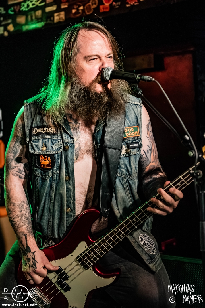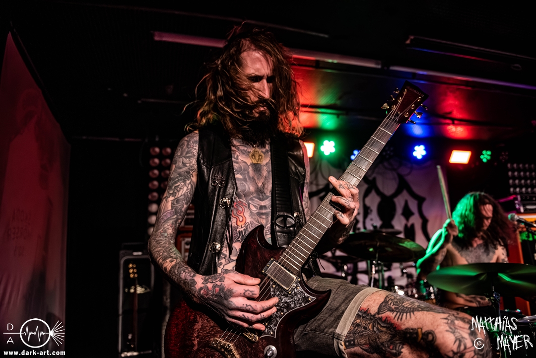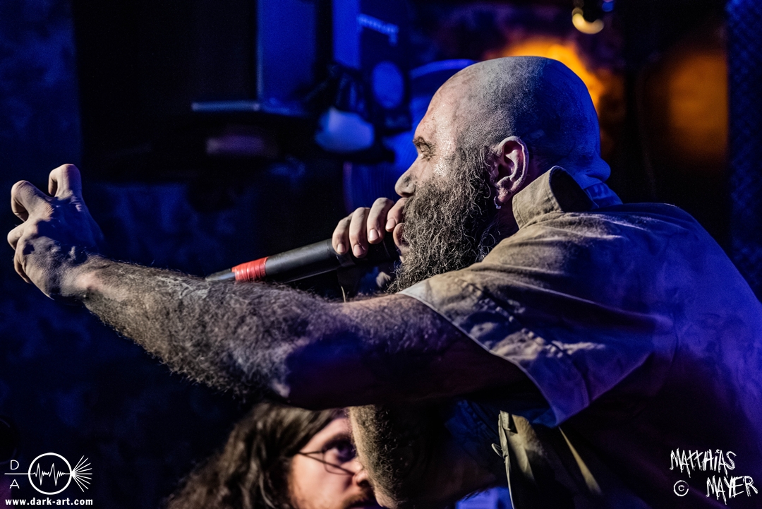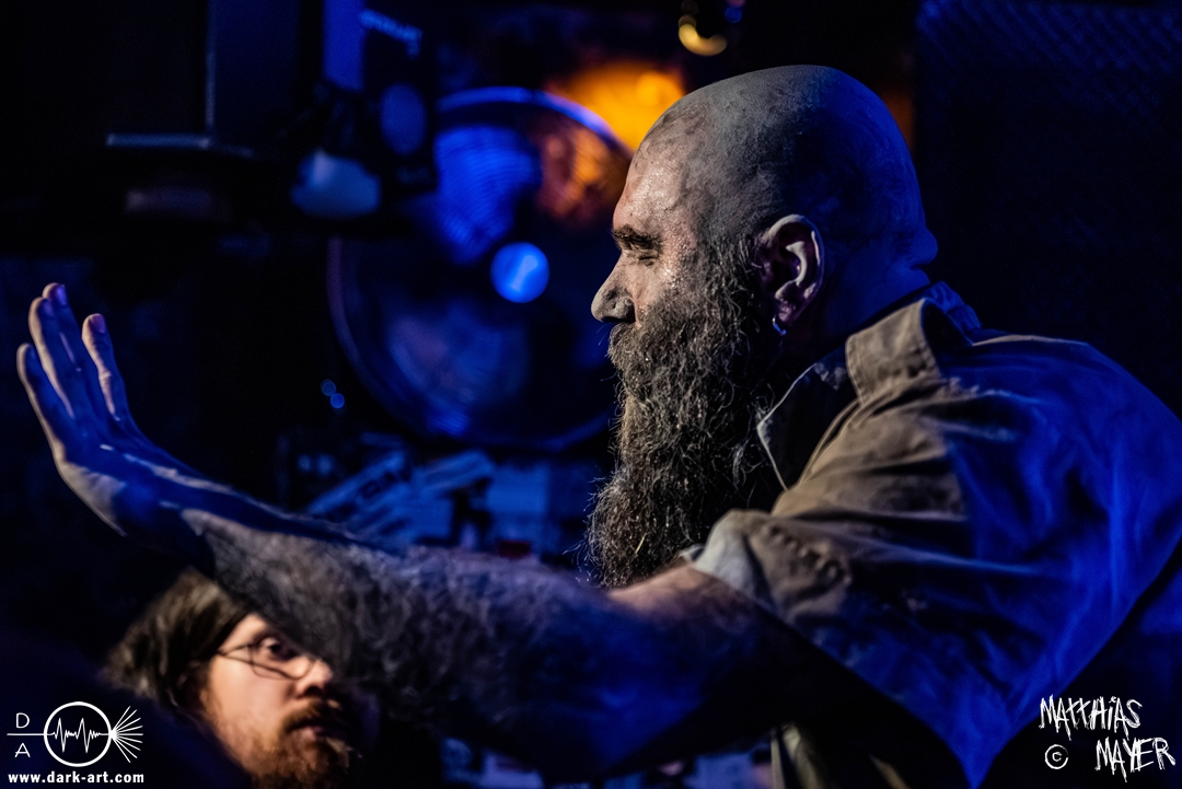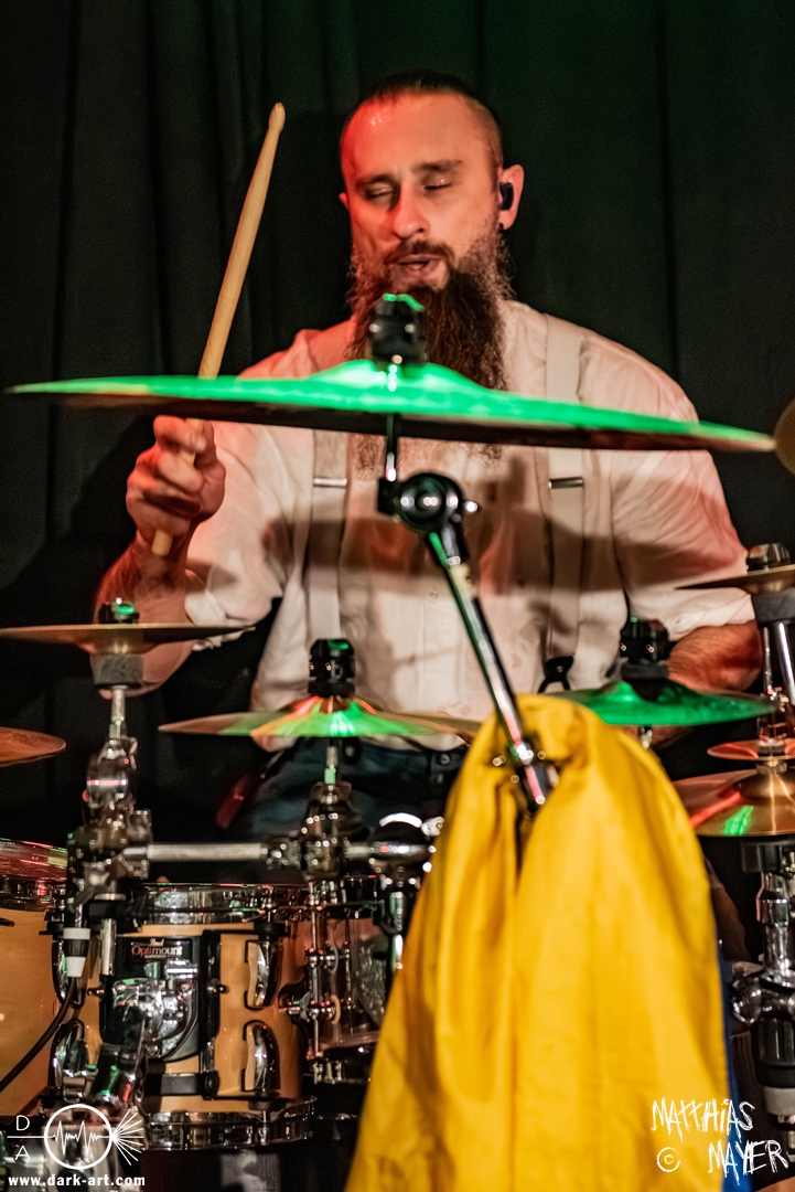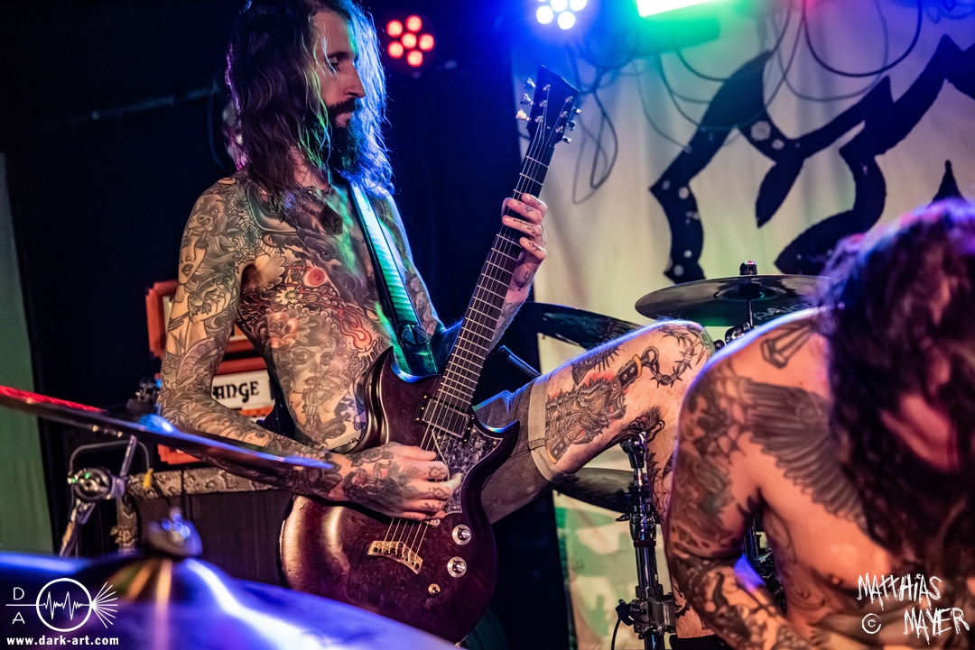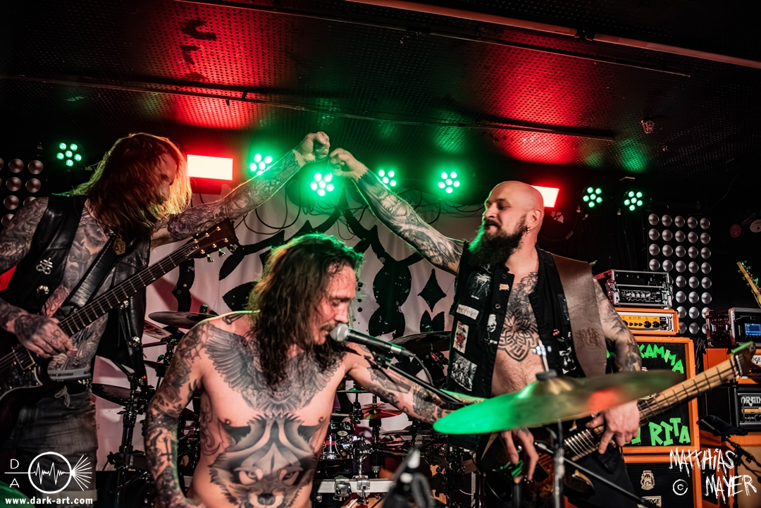 Schon bevor Katla die Show begann, zeigte sich ein ungewöhnlicher Bühnenaufbau, denn vorne stand zentral ein zweites Schlagzeug, denn Rasmus Bang übernimmt sowohl den Leadgesang als auch das Schlagzeug. Im Verlauf von sechs Songs präsentiere das Trio aus Dänemark einen sehr starken drückenden Sound, der gut beim Publikum ankam. Neben Musik mit klarer Message gab es aber auch eine klare politische Kante in den Ansagen, in denen sich die Band wiederholt gegen Krieg und Tyrannei stellte. Nach der Absage im letzten Jahr freute sich die Band besonders, nun zum dritten Mal zusammen auf Tour gehen zu können, und für den Song Dead Lover wurden sie an diesem Abend auch von Oleksa von 1914 an der zweiten Gitarre unterstützt. Die Musiker freuten sich auch, zurück im Nachtleben zu sein und dass einige Besucher sie schon auf früherer Tour mit Crypta gesehen hatten. Das Set endete mit dem Song Dragonlord, der, wie die Band feststellen musste, in Deutschland für einige ungewollte humorvolle Momente sorgte. Zu Beginn des Songs kippte Rasmus auch noch sein Bier über die Felle, von denen es beim Spielen hochspritzte.