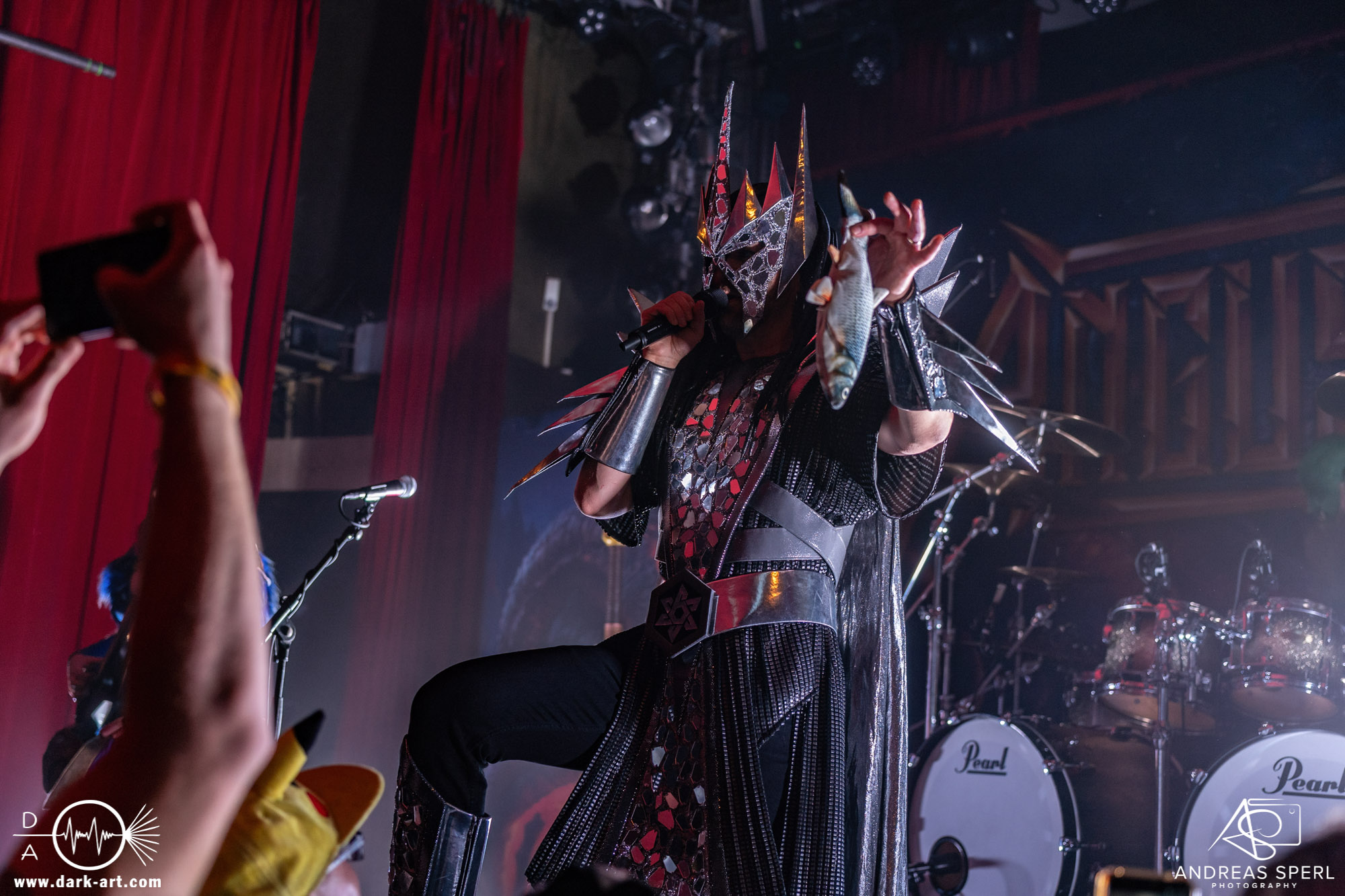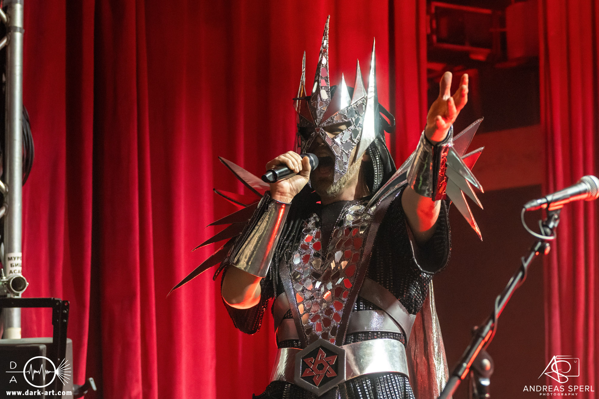 Auch zwischen den Songs blieb es unterhaltsam. Nach Sixcalibur wurde noch einmal auf das aktuelle Album verwiesen, selbstverständlich inklusive Hinweis auf den Merchstand. Mit Just a Fool Will Play Tricks on Angus McSix wurde die Story um Täuschung und Verrat weitergesponnen, bevor bei Techno Men das Publikum erneut gefragt war. Gesang wie Höhlenmenschen oder Fußballfans, „uoh uoh uoh“, wurde verlangt und das klappte verständlicherweise schon beim ersten Versuch.