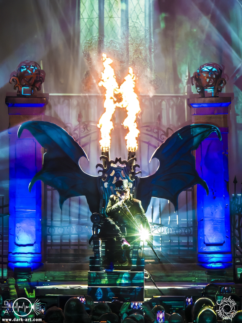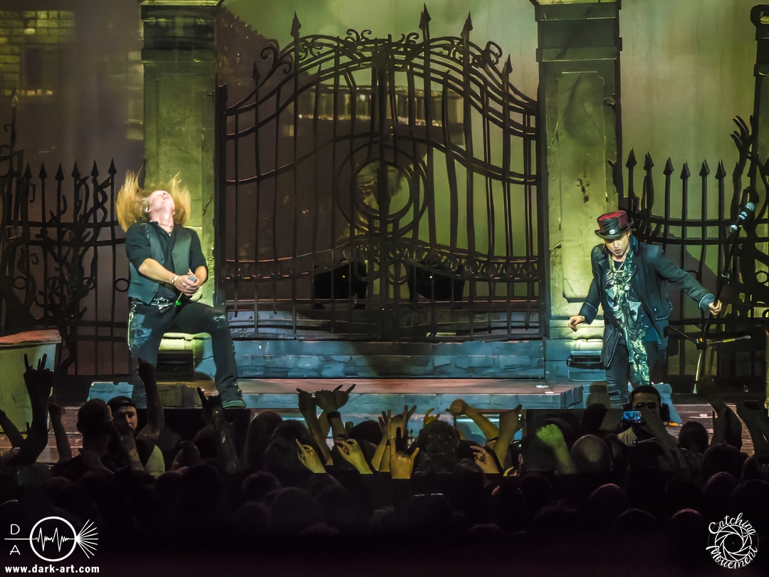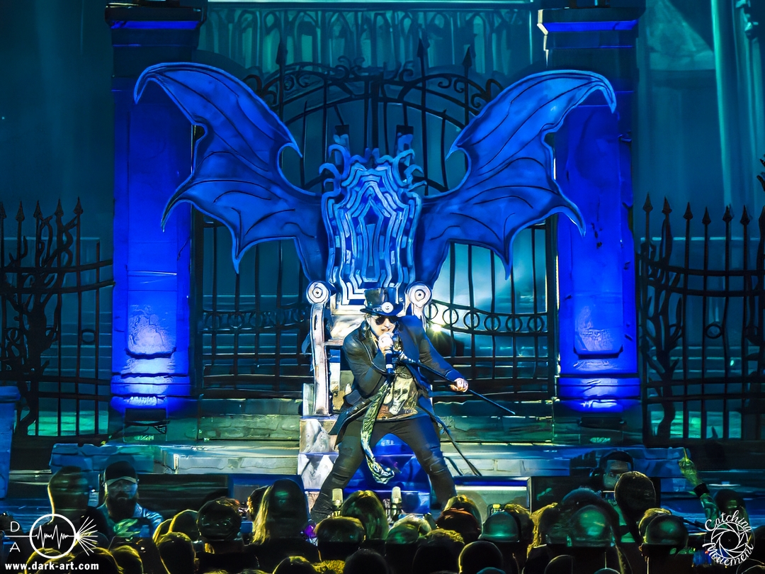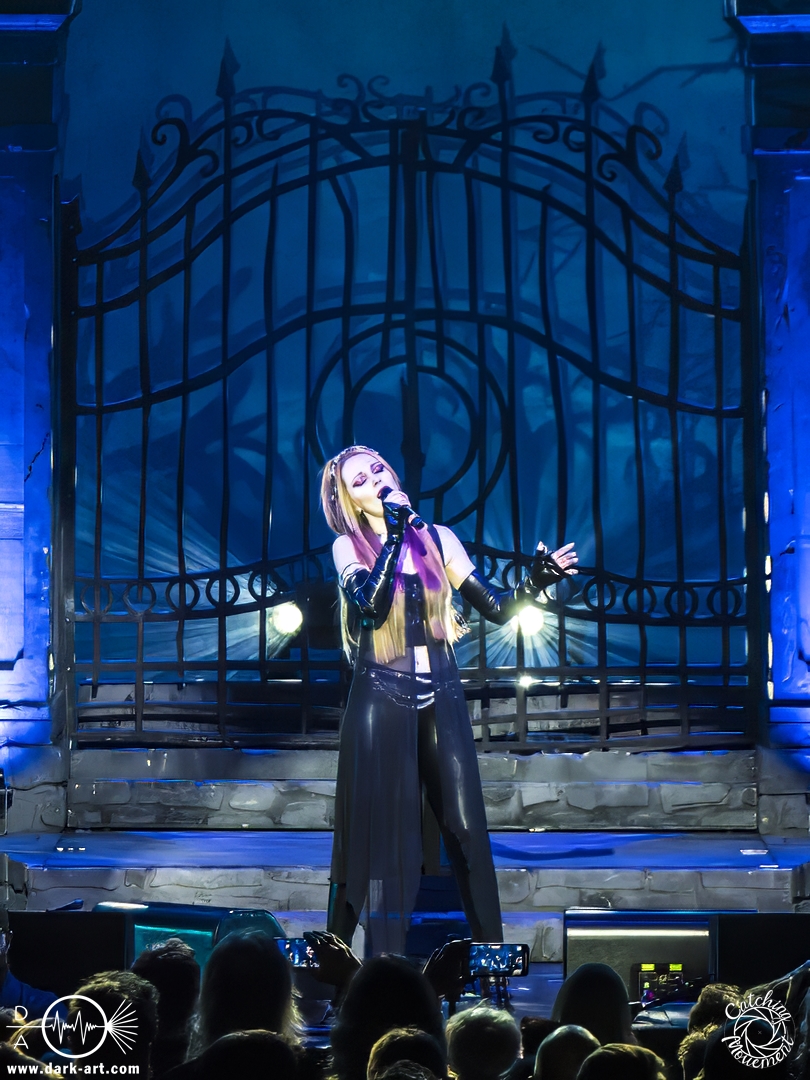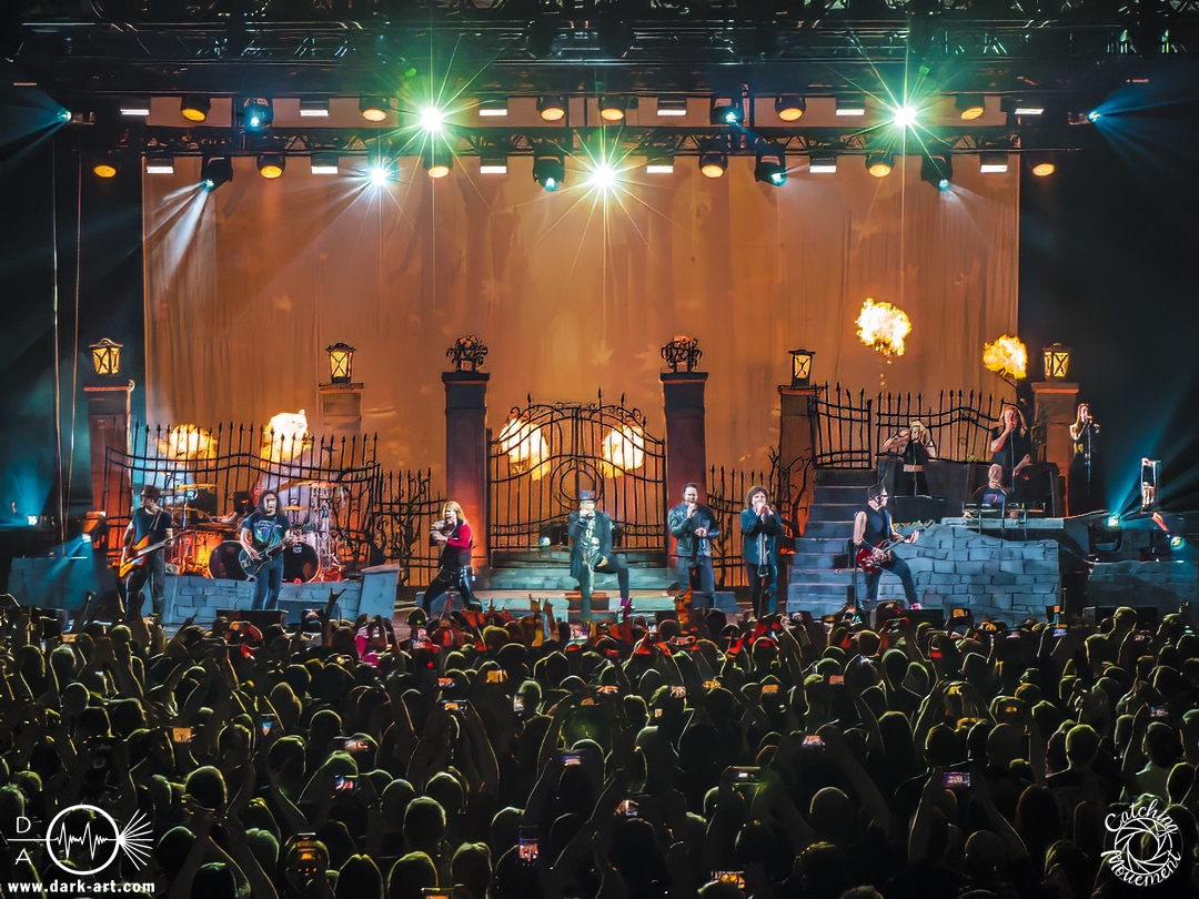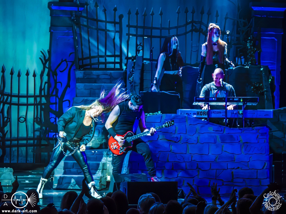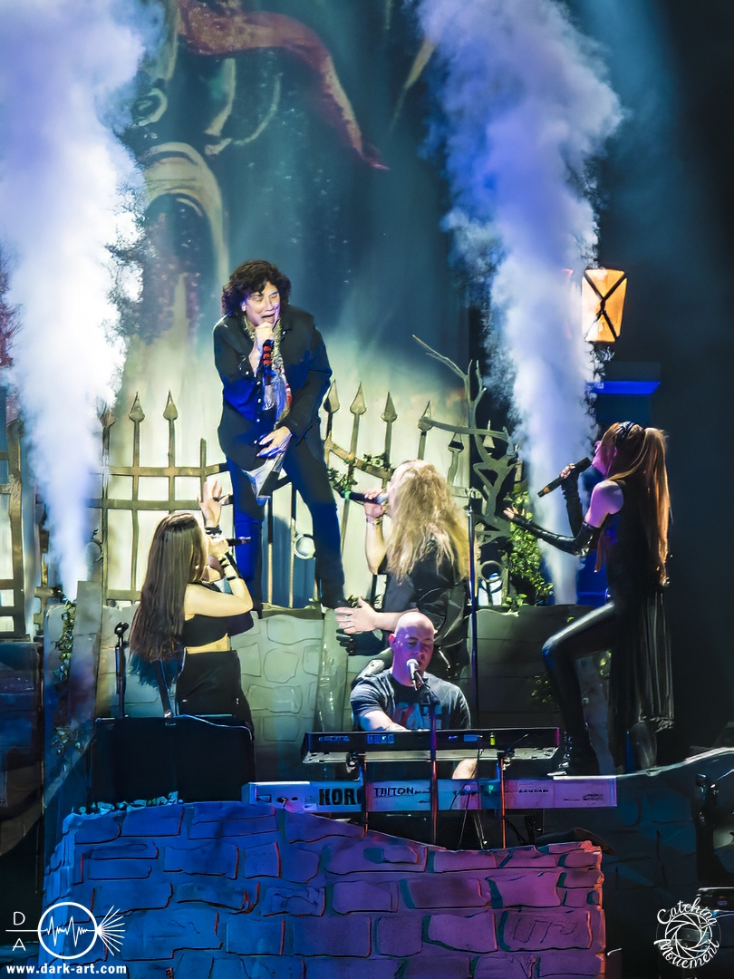 Wir schrieben den Abend des 5. April 2025. Avantasia hatte beschlossen, die Jahrhunderthalle in Frankfurt zu erobern. Und da es nicht zum Konzept einer Metal Opera gepasst hätte, natürlich ohne Vorband, was aber zweieinhalb Stunden später, nach der Show in der fast ausverkauften Jahrhunderthalle, niemanden störte. Als um viertel vor 8 mit einem lauten Knall der Vorhang fiel, wurden die Fans von einem Friedhof begrüßt und die Show begann. Eingeleitet durch das Lied, welches zu der Zeit in den Rock-Radios hoch und runtergespielt wurde: Creepshow, welches auch das erste Lied vom neuen Album ist. Die Fans wurden gleich mitgerissen und Tobias und die anderen Musiker zeigten, was sie drauf hatten. Gleich beim zweiten Lied, Reach Out for the Light, trat Adrienne Cowan, zuvor auf einer Erhöhung hinter dem Keyboarder positioniert, in den Vordergrund, um ihre Backing Vocals durch Lead Vocals zu ersetzen. Dabei ließ sie jeden vergessen, dass das Lied ursprünglich für Michael Kiske von Helloween geschrieben wurde und stahl sogar Tobias die Show. Dieser war sich dabei aber nicht zu schade, um für die anwesenden Fotografen zu posen. Sobald Adrienne ihren Platz wieder eingenommen hatte, betrat schon der nächste Hochkaräter die Bühne, um neben Tobias zu brillieren: Tommy Karevik von Kamelot. Passend zu The Witch natürlich mit Kapuze, um dem Lied auch visuell den passenden Touch zu geben. Und auch er zeigte, was er konnte. Man konnte zu dem Zeitpunkt schon merken, dass die Show bereits ein paar Konzerte hinter sich hatte und einfach perfekt eingespielt war. Danach war für die Fotografen im Graben Schluss; etwas, was Tobias freudig kommentierte, bevor er den nächsten Leadsänger an seine Seite holte. Wie zuvor Adrienne, kam auch Herbie Langhans von der Erhöhung runter, um gemeinsam mit Tobias das nächste Lied zu singen, namentlich Devil in the Belfry. Bis einschließlich Let the Storm Descend Upon You gaben sich die Sänger und Adrienne quasi die Klinke in die Hand, es folgten noch Ronnie Atkins der Pretty Maids0, Eric Martin von der mittlerweile aufgelösten Band Mr. Big und Kenny Leckremo von H.E.A.T. Eric Martin durfte auch die Legende Klaus Meine bei Dying for an Angel vertreten. Damit war auch bereits die Hälfte der Show erreicht; zumindest, was die Anzahl der Lieder anging. Bis dahin herrschte bereits eine grandiose Stimmung und die Künstler zeigten alle ihr Können. Aber auch die LED-Leinwand im Hintergrund trug zur Atmosphäre bei, indem passendes Bildmaterial zu den entsprechenden Songs gezeigt wurde.
