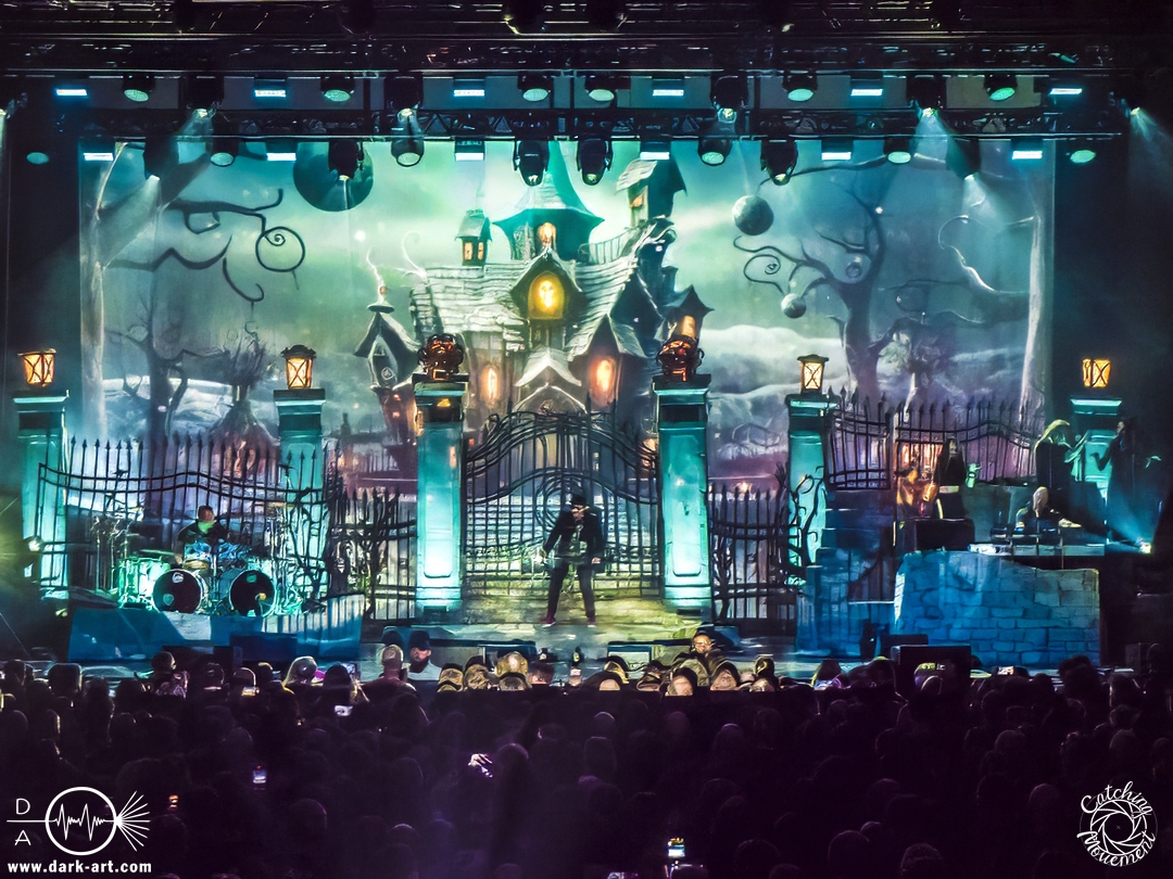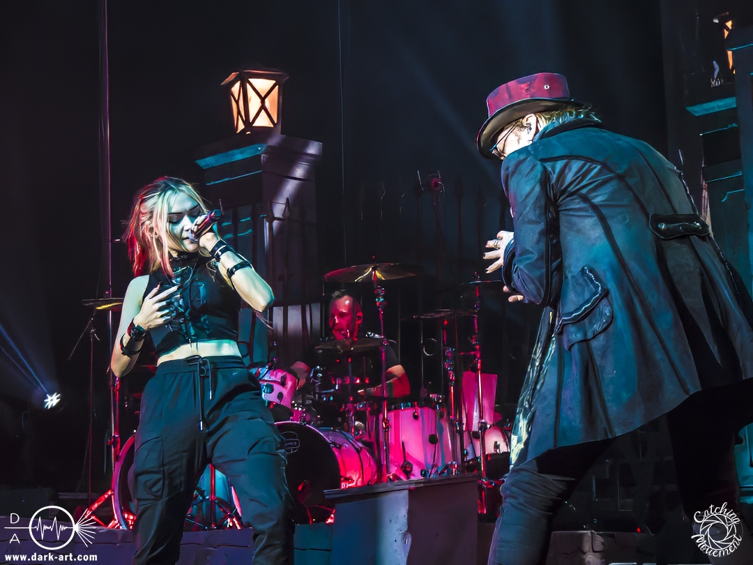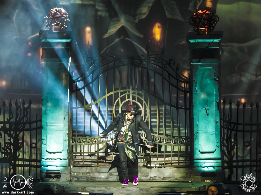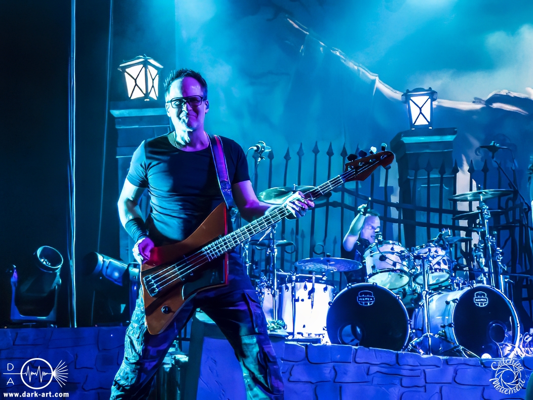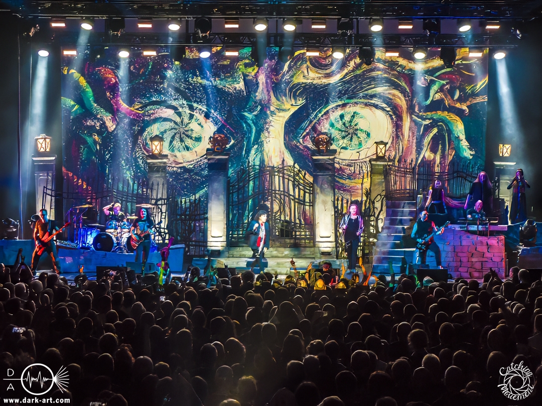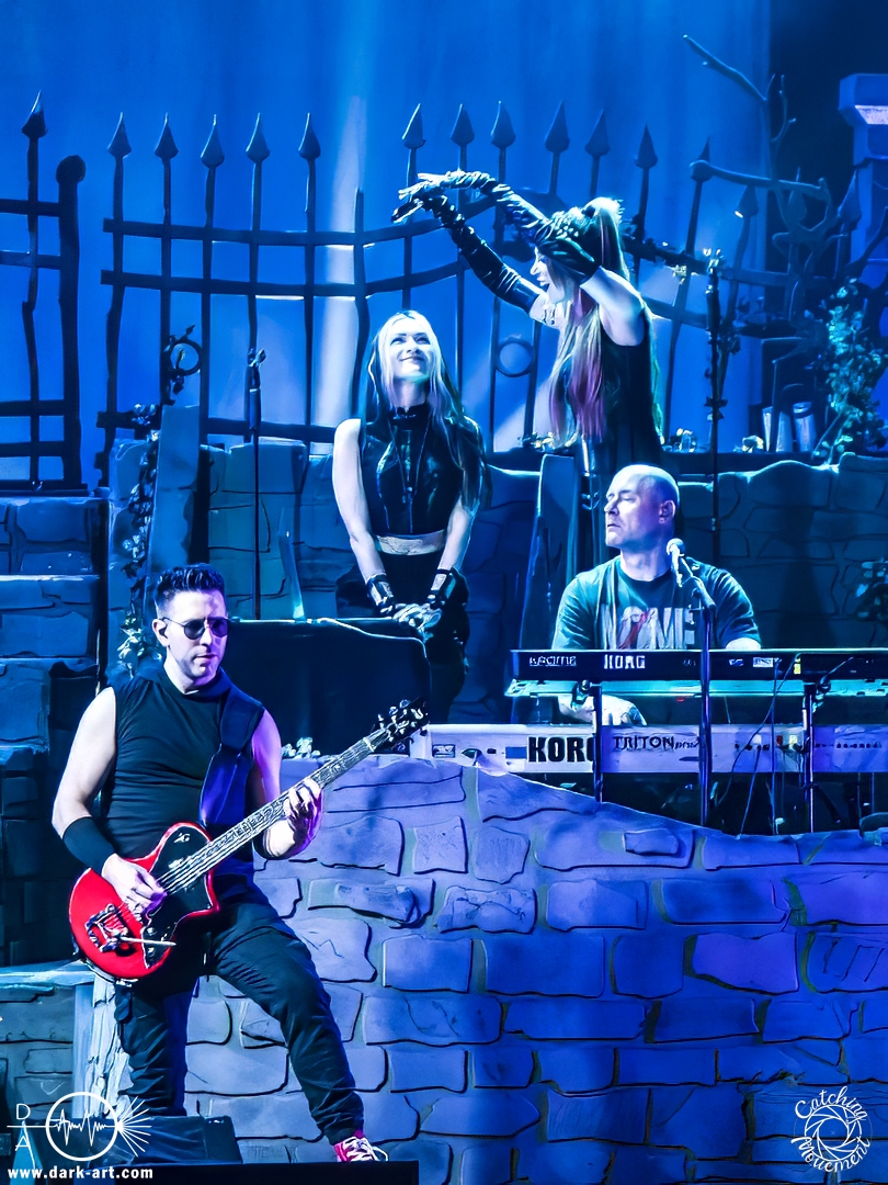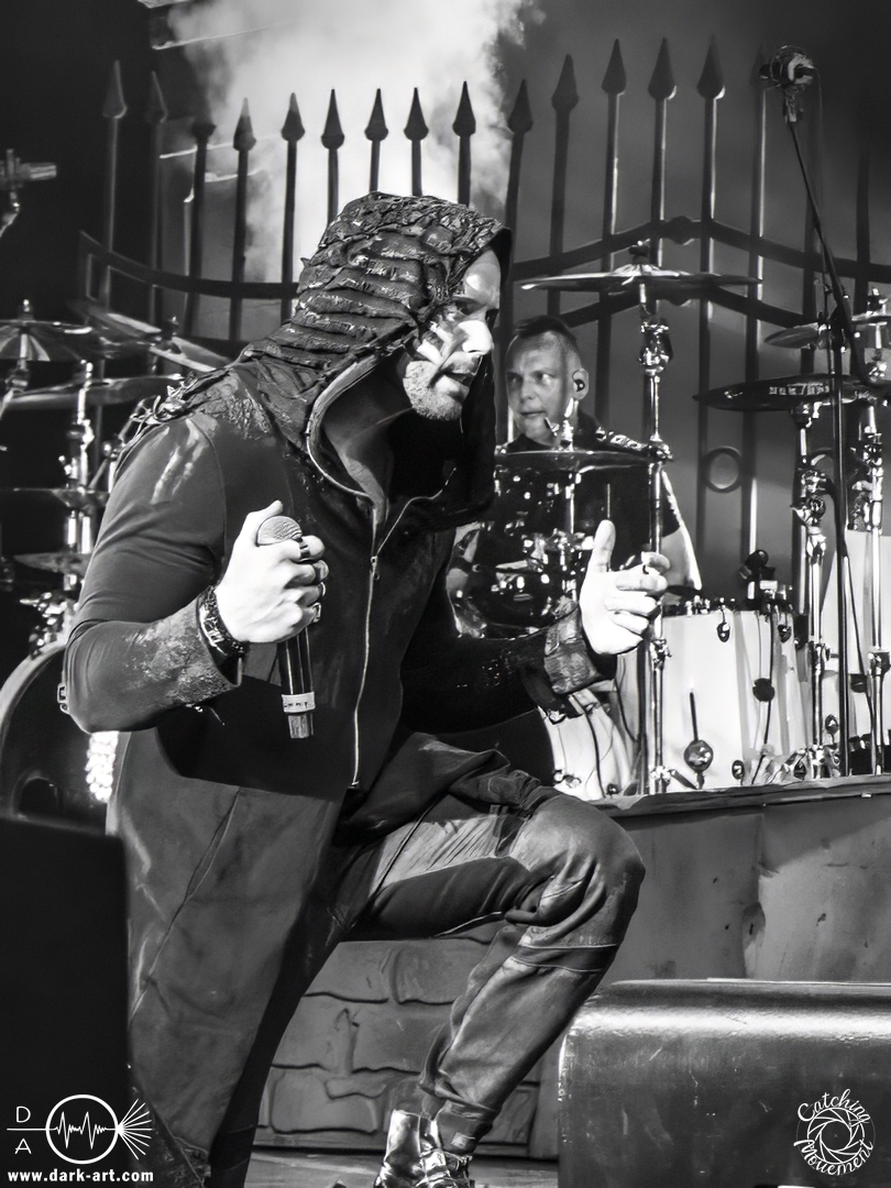 Wir schrieben den Abend des 5. April 2025. Avantasia hatte beschlossen, die Jahrhunderthalle in Frankfurt zu erobern. Und da es nicht zum Konzept einer Metal Opera gepasst hätte, natürlich ohne Vorband, was aber zweieinhalb Stunden später, nach der Show in der fast ausverkauften Jahrhunderthalle, niemanden störte. Als um viertel vor 8 mit einem lauten Knall der Vorhang fiel, wurden die Fans von einem Friedhof begrüßt und die Show begann. Eingeleitet durch das Lied, welches zu der Zeit in den Rock-Radios hoch und runtergespielt wurde: Creepshow, welches auch das erste Lied vom neuen Album ist. Die Fans wurden gleich mitgerissen und Tobias und die anderen Musiker zeigten, was sie drauf hatten. Gleich beim zweiten Lied, Reach Out for the Light, trat Adrienne Cowan, zuvor auf einer Erhöhung hinter dem Keyboarder positioniert, in den Vordergrund, um ihre Backing Vocals durch Lead Vocals zu ersetzen. Dabei ließ sie jeden vergessen, dass das Lied ursprünglich für Michael Kiske von Helloween geschrieben wurde und stahl sogar Tobias die Show. Dieser war sich dabei aber nicht zu schade, um für die anwesenden Fotografen zu posen. Sobald Adrienne ihren Platz wieder eingenommen hatte, betrat schon der nächste Hochkaräter die Bühne, um neben Tobias zu brillieren: Tommy Karevik von Kamelot. Passend zu The Witch natürlich mit Kapuze, um dem Lied auch visuell den passenden Touch zu geben. Und auch er zeigte, was er konnte. Man konnte zu dem Zeitpunkt schon merken, dass die Show bereits ein paar Konzerte hinter sich hatte und einfach perfekt eingespielt war. Danach war für die Fotografen im Graben Schluss; etwas, was Tobias freudig kommentierte, bevor er den nächsten Leadsänger an seine Seite holte. Wie zuvor Adrienne, kam auch Herbie Langhans von der Erhöhung runter, um gemeinsam mit Tobias das nächste Lied zu singen, namentlich Devil in the Belfry. Bis einschließlich Let the Storm Descend Upon You gaben sich die Sänger und Adrienne quasi die Klinke in die Hand, es folgten noch Ronnie Atkins der Pretty Maids0, Eric Martin von der mittlerweile aufgelösten Band Mr. Big und Kenny Leckremo von H.E.A.T. Eric Martin durfte auch die Legende Klaus Meine bei Dying for an Angel vertreten. Damit war auch bereits die Hälfte der Show erreicht; zumindest, was die Anzahl der Lieder anging. Bis dahin herrschte bereits eine grandiose Stimmung und die Künstler zeigten alle ihr Können. Aber auch die LED-Leinwand im Hintergrund trug zur Atmosphäre bei, indem passendes Bildmaterial zu den entsprechenden Songs gezeigt wurde.