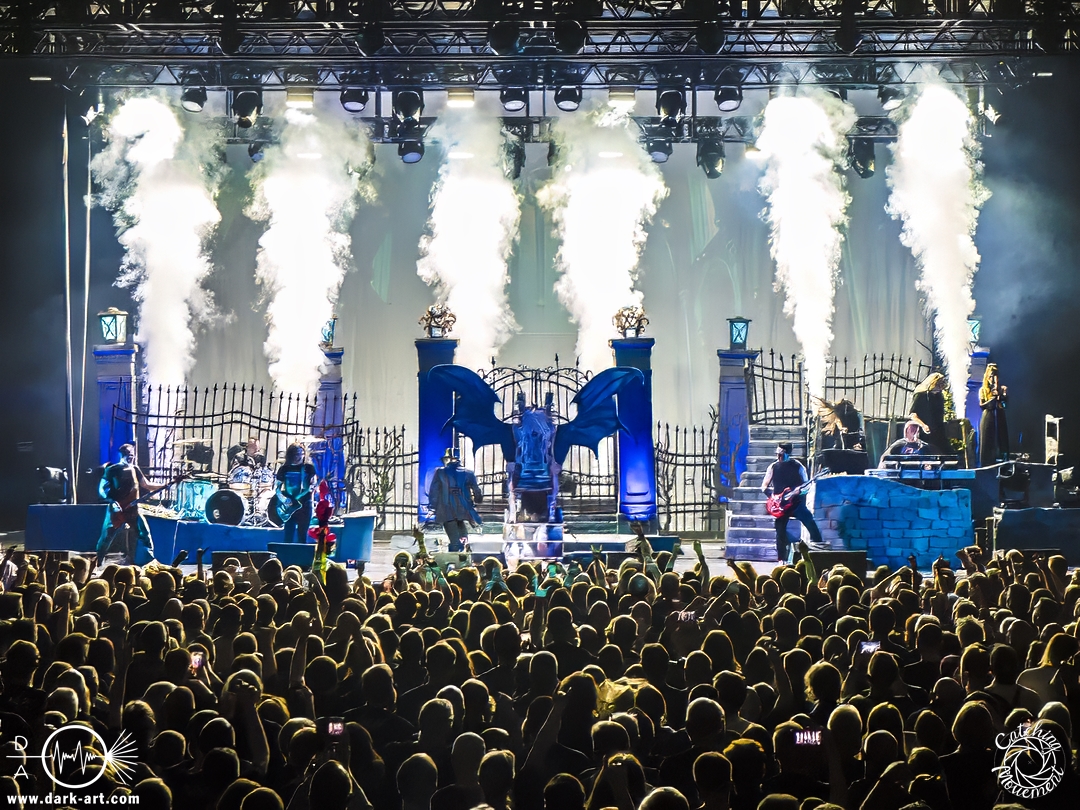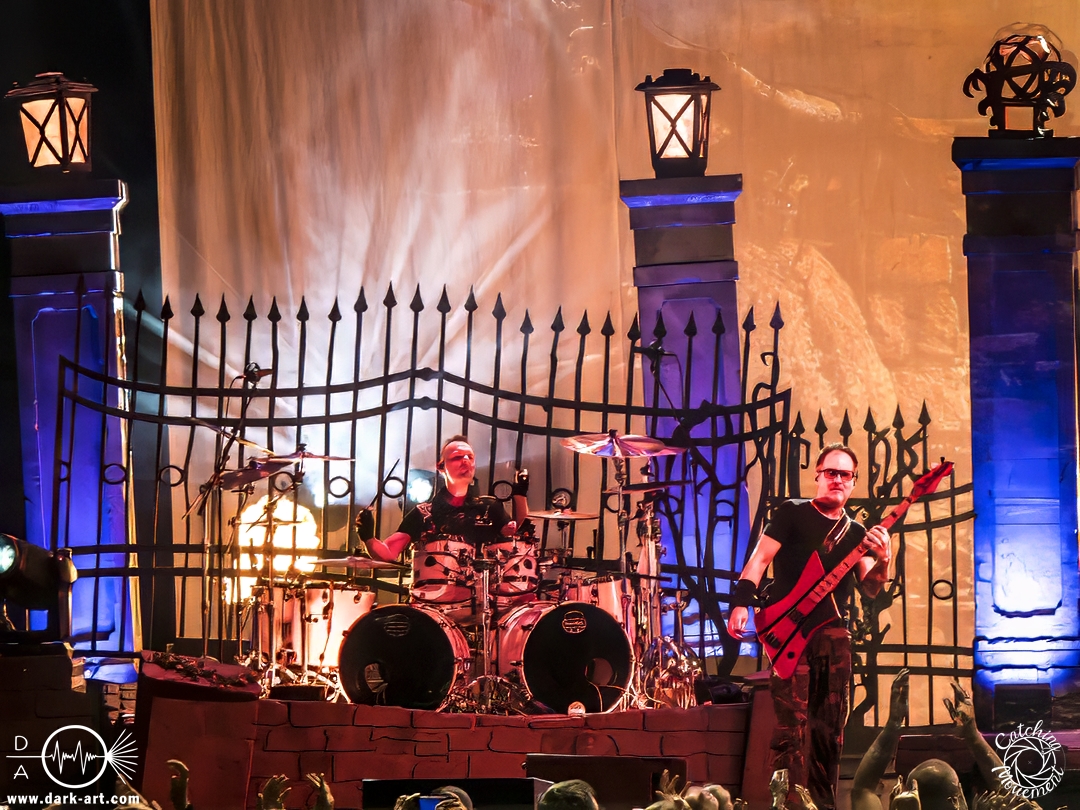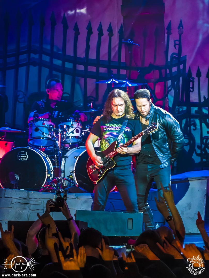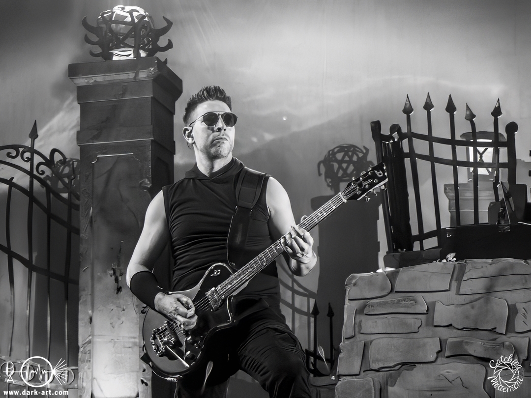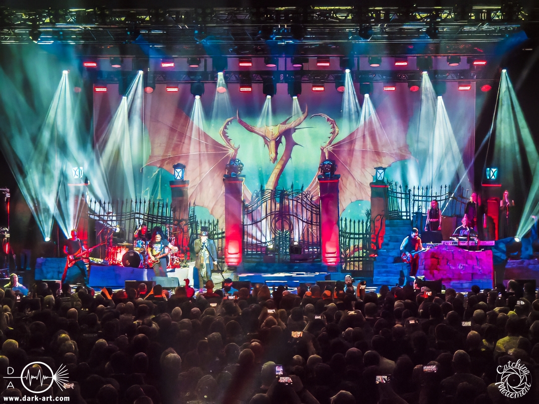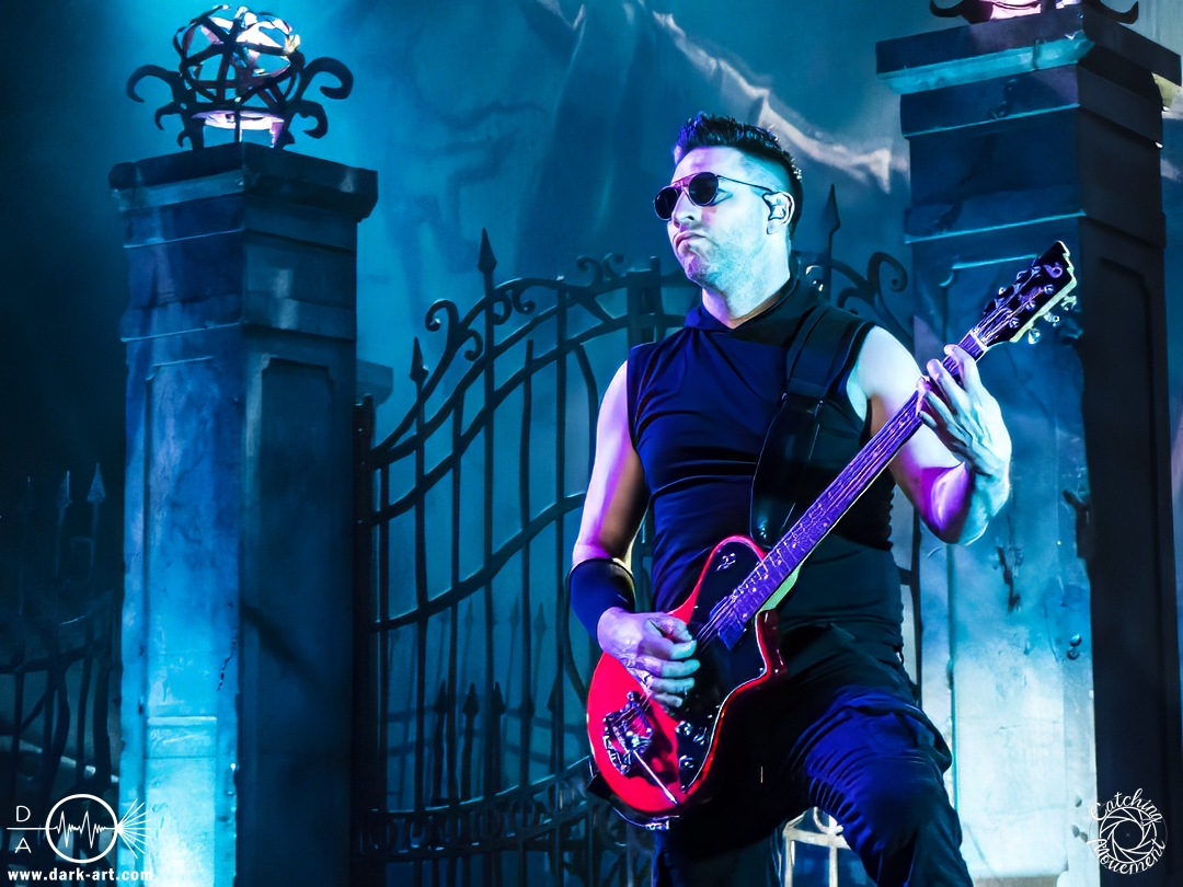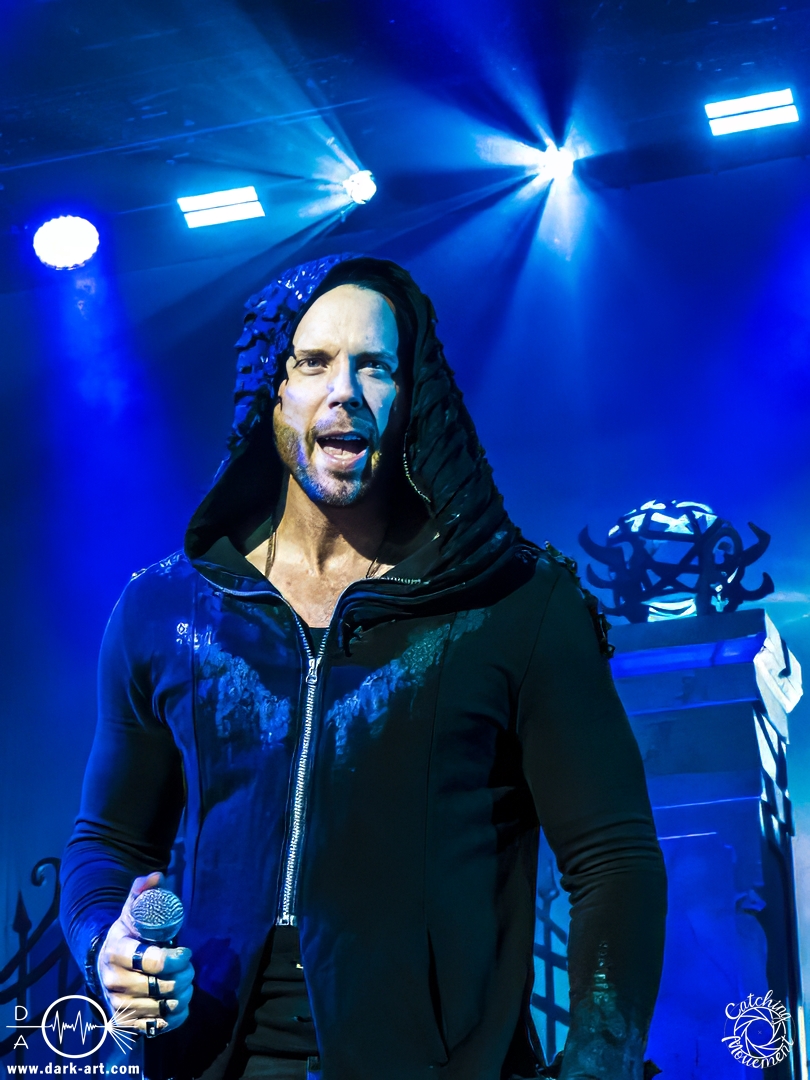 Wir schrieben den Abend des 5. April 2025. Avantasia hatte beschlossen, die Jahrhunderthalle in Frankfurt zu erobern. Und da es nicht zum Konzept einer Metal Opera gepasst hätte, natürlich ohne Vorband, was aber zweieinhalb Stunden später, nach der Show in der fast ausverkauften Jahrhunderthalle, niemanden störte. Als um viertel vor 8 mit einem lauten Knall der Vorhang fiel, wurden die Fans von einem Friedhof begrüßt und die Show begann. Eingeleitet durch das Lied, welches zu der Zeit in den Rock-Radios hoch und runtergespielt wurde: Creepshow, welches auch das erste Lied vom neuen Album ist. Die Fans wurden gleich mitgerissen und Tobias und die anderen Musiker zeigten, was sie drauf hatten. Gleich beim zweiten Lied, Reach Out for the Light, trat Adrienne Cowan, zuvor auf einer Erhöhung hinter dem Keyboarder positioniert, in den Vordergrund, um ihre Backing Vocals durch Lead Vocals zu ersetzen. Dabei ließ sie jeden vergessen, dass das Lied ursprünglich für Michael Kiske von Helloween geschrieben wurde und stahl sogar Tobias die Show. Dieser war sich dabei aber nicht zu schade, um für die anwesenden Fotografen zu posen. Sobald Adrienne ihren Platz wieder eingenommen hatte, betrat schon der nächste Hochkaräter die Bühne, um neben Tobias zu brillieren: Tommy Karevik von Kamelot. Passend zu The Witch natürlich mit Kapuze, um dem Lied auch visuell den passenden Touch zu geben. Und auch er zeigte, was er konnte. Man konnte zu dem Zeitpunkt schon merken, dass die Show bereits ein paar Konzerte hinter sich hatte und einfach perfekt eingespielt war. Danach war für die Fotografen im Graben Schluss; etwas, was Tobias freudig kommentierte, bevor er den nächsten Leadsänger an seine Seite holte. Wie zuvor Adrienne, kam auch Herbie Langhans von der Erhöhung runter, um gemeinsam mit Tobias das nächste Lied zu singen, namentlich Devil in the Belfry. Bis einschließlich Let the Storm Descend Upon You gaben sich die Sänger und Adrienne quasi die Klinke in die Hand, es folgten noch Ronnie Atkins der Pretty Maids0, Eric Martin von der mittlerweile aufgelösten Band Mr. Big und Kenny Leckremo von H.E.A.T. Eric Martin durfte auch die Legende Klaus Meine bei Dying for an Angel vertreten. Damit war auch bereits die Hälfte der Show erreicht; zumindest, was die Anzahl der Lieder anging. Bis dahin herrschte bereits eine grandiose Stimmung und die Künstler zeigten alle ihr Können. Aber auch die LED-Leinwand im Hintergrund trug zur Atmosphäre bei, indem passendes Bildmaterial zu den entsprechenden Songs gezeigt wurde.