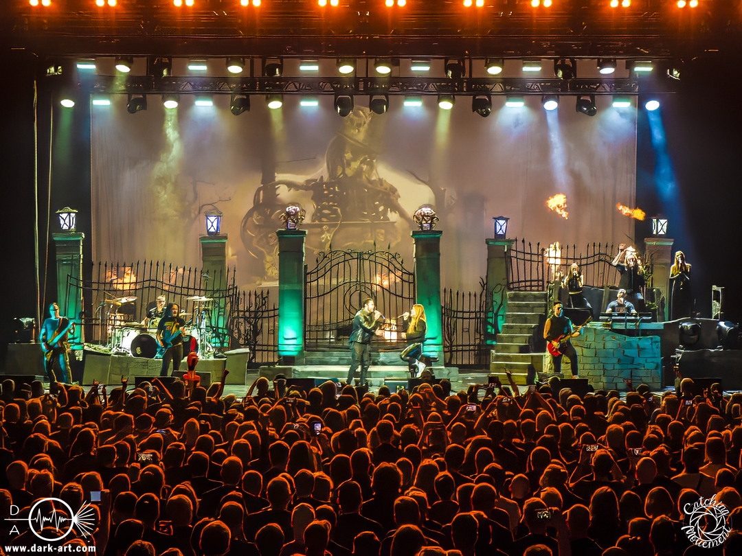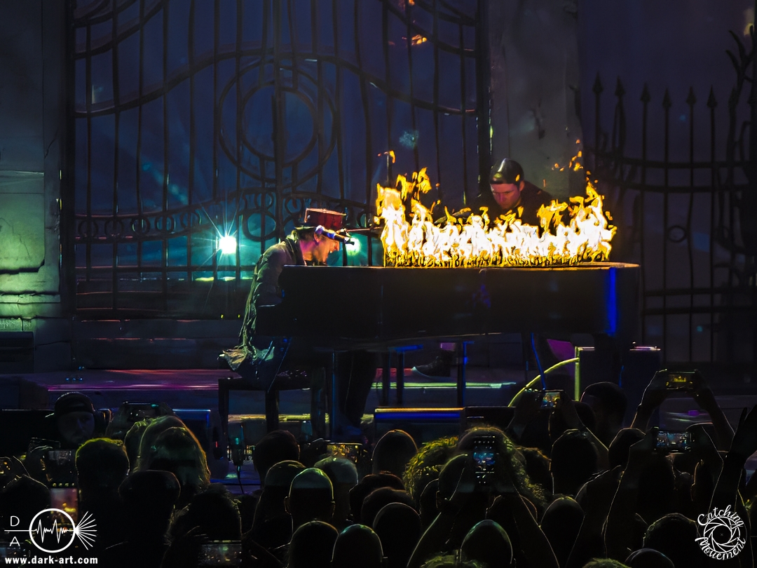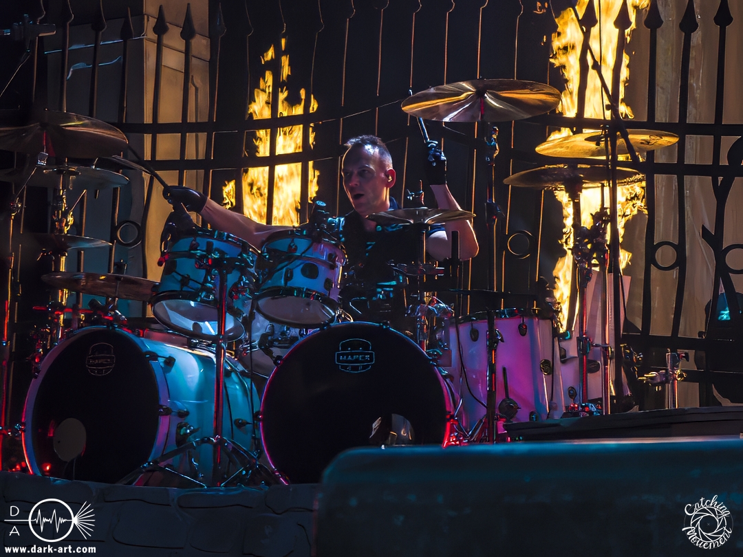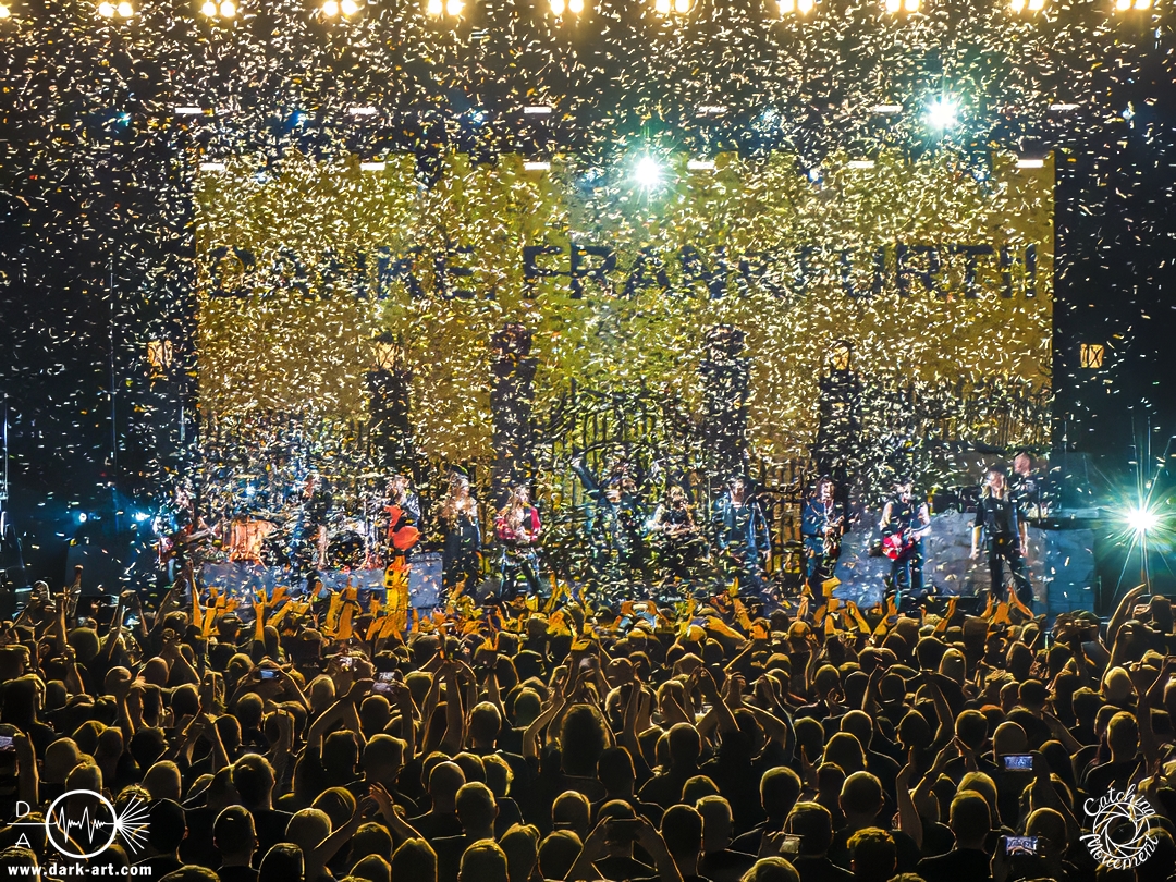 Zu Promised Land verließ dann Tobias die Bühne und überließ sie gänzlich Ronnie und Eric, die mit einer eingespielten Performance zu begeistern wussten. Es war nicht das einzige Lied, bei dem Tobias sich eine kleine Verschnaufpause gönnen konnte; etwas, was man ihm aber, angesichts der Länge der Show und dem, was sie bot, nicht verübeln konnte. Und da es der Show keinen Abbruch tat, wer sollte sich da beschweren? Genau, niemand. Um Sharon den Adel zu vertreten, durfte Chiara Tricarico von Moonlight Haze ihr ganzes Können zeigen. Und das gelang ihr auch meisterhaft. So ging das Feuerwerk weiter, bis mit Death is Just a Feeling das Ende der regulären Show eingeläutet wurde. Bis dahin waren immerhin fast ein Drittel der gespielten Lieder vom neuen Album Here Be Dragons, was die Live-Tauglichkeit der Lieder und des Albums verdeutlichte. Die Zugabenpause könnte man auch als Umbaupause ansehen, da in der Zwischenzeit ein Klavier auf die Bühne gebracht wurde, an welches sich Tobias setzte. Das wäre alles zwar schon sehr gut gewesen, aber um es zu toppen, kamen aus dem Klavier Flammen; passend zu dem gespielten Lied Lucifer. Zum Abschluss wurde es dann auf der großen Bühne der Jahrhunderthalle noch mal fast etwas eng, weil alle Sängerinnen und Sänger gemeinsam Sign of the Cross / The Seven Angels performten, um sich schließlich mit einem riesigen Konfettiregen zu verabschieden. Womit ein Abend, der allen was bot, zu Ende ging und alle geflasht nach Hause gehen durften.