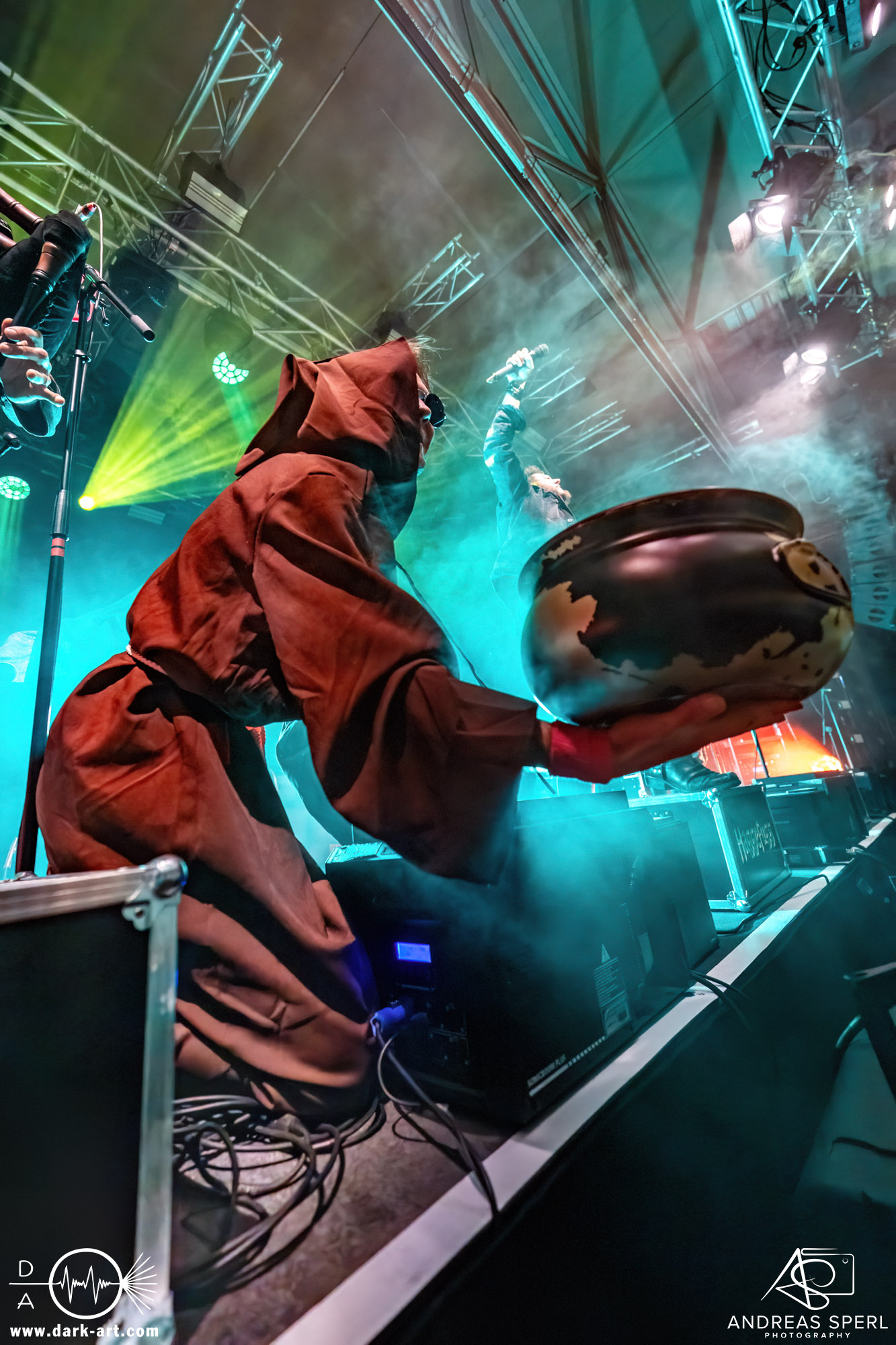 Bei Hexenkessel nahm der Auftritt endgültig Fahrt auf. Zusätzliche Gestalten in braunen Mönchsroben stürmten die Bühne, rührten, tanzten und sorgten mit bewusst inszeniertem Chaos für ein Bild, das perfekt zur Stimmung passte. Kurz darauf folgte Daheim, ein Song, der mit seiner klaren Botschaft genau den Nerv des Abends traf: Gemeinschaft entsteht dort, wo man gemeinsam feiert. Entsprechend laut und geschlossen fiel der Gesang aus dem Publikum aus.