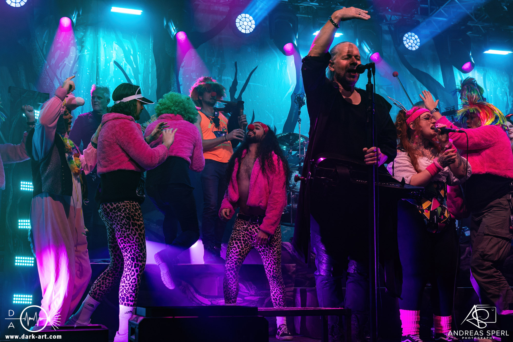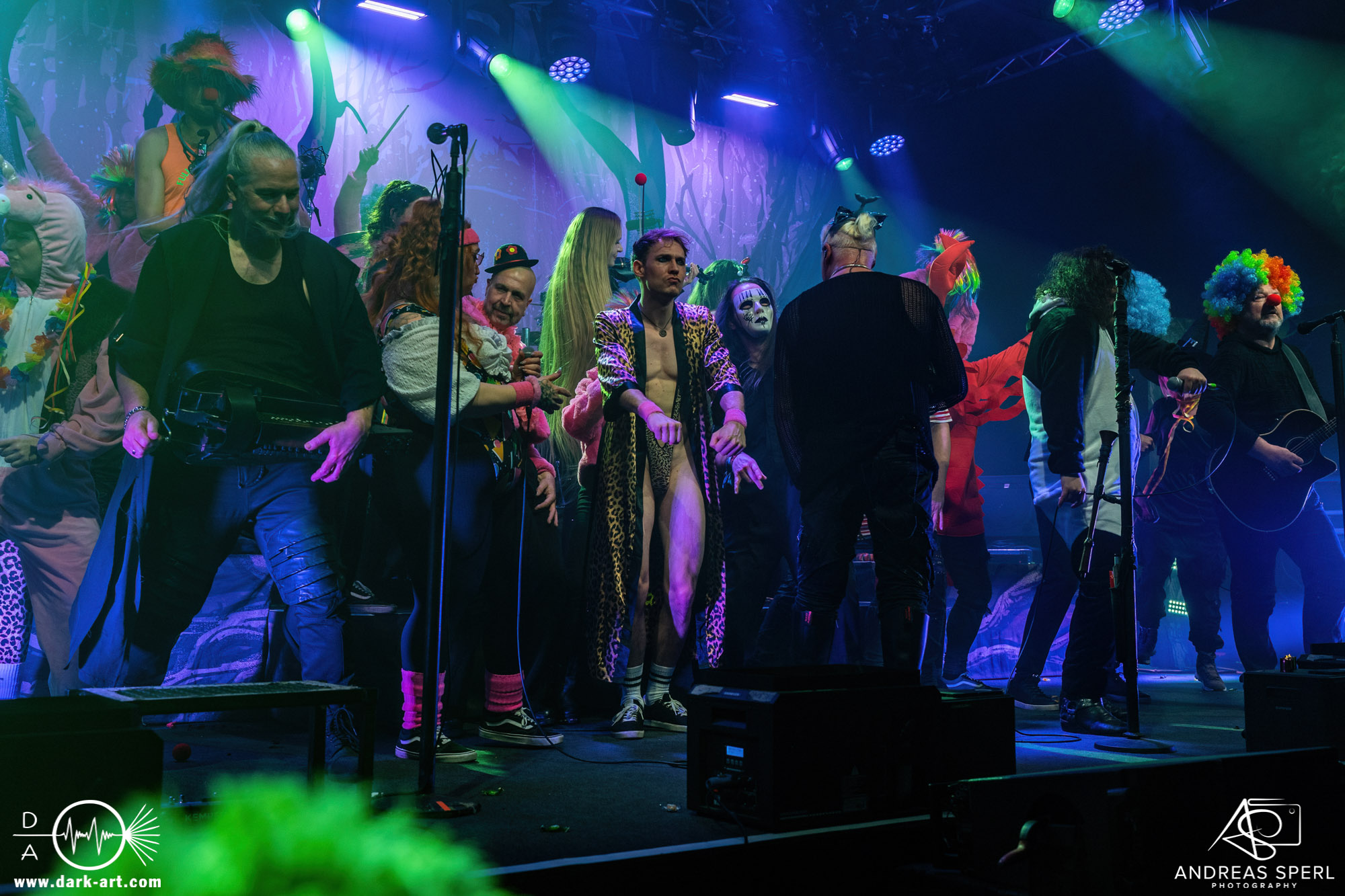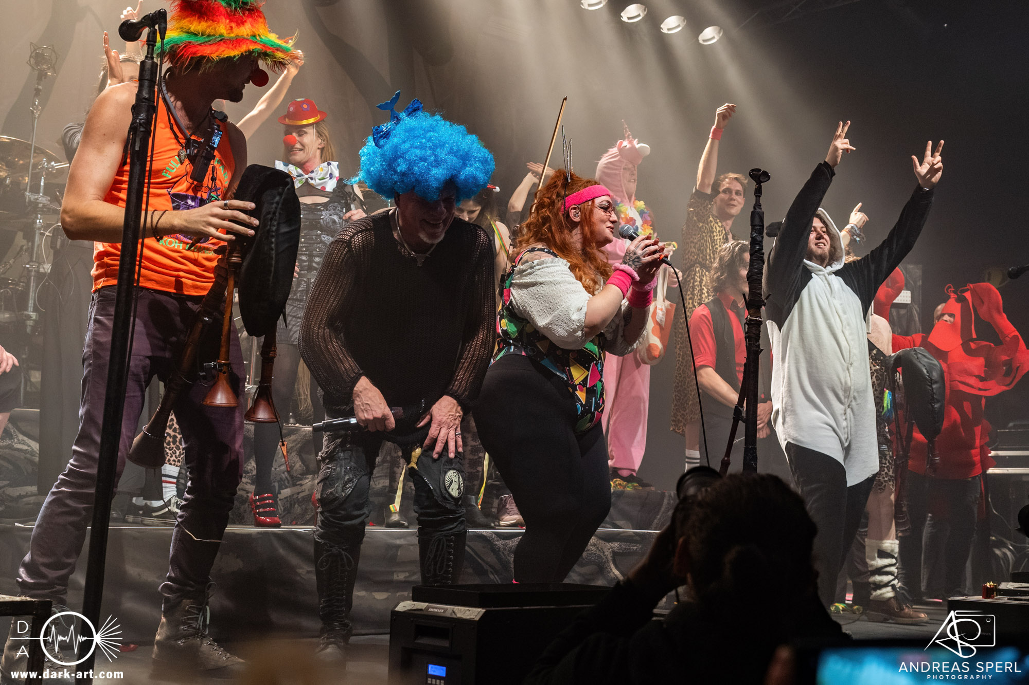 Zu Veitstanz stürmten schließlich auch Haggefugg und Kupfergold die Bühne. Kostümiert, ausgelassen und vollkommen im Moment aufgehend, verwandelten alle Beteiligten die Bühne in ein farbenfrohes Chaos aus Dudelsäcken, Gesang und Tanz. Mitglieder von Subway to Sally und Schandmaul wurden mit Perücken und roten Nasen ausgestattet, Eric Fish wurde mit eine blaue Perücke mit Fischschwanz geschmückt. Ein Bild irgendwo zwischen Wahnsinn, Tradition und purem Spaß. Genau hier zeigte sich, was die Eisheilige Nacht ausmacht: Gemeinschaft statt Distanz, Zusammenhalt statt Starallüren.