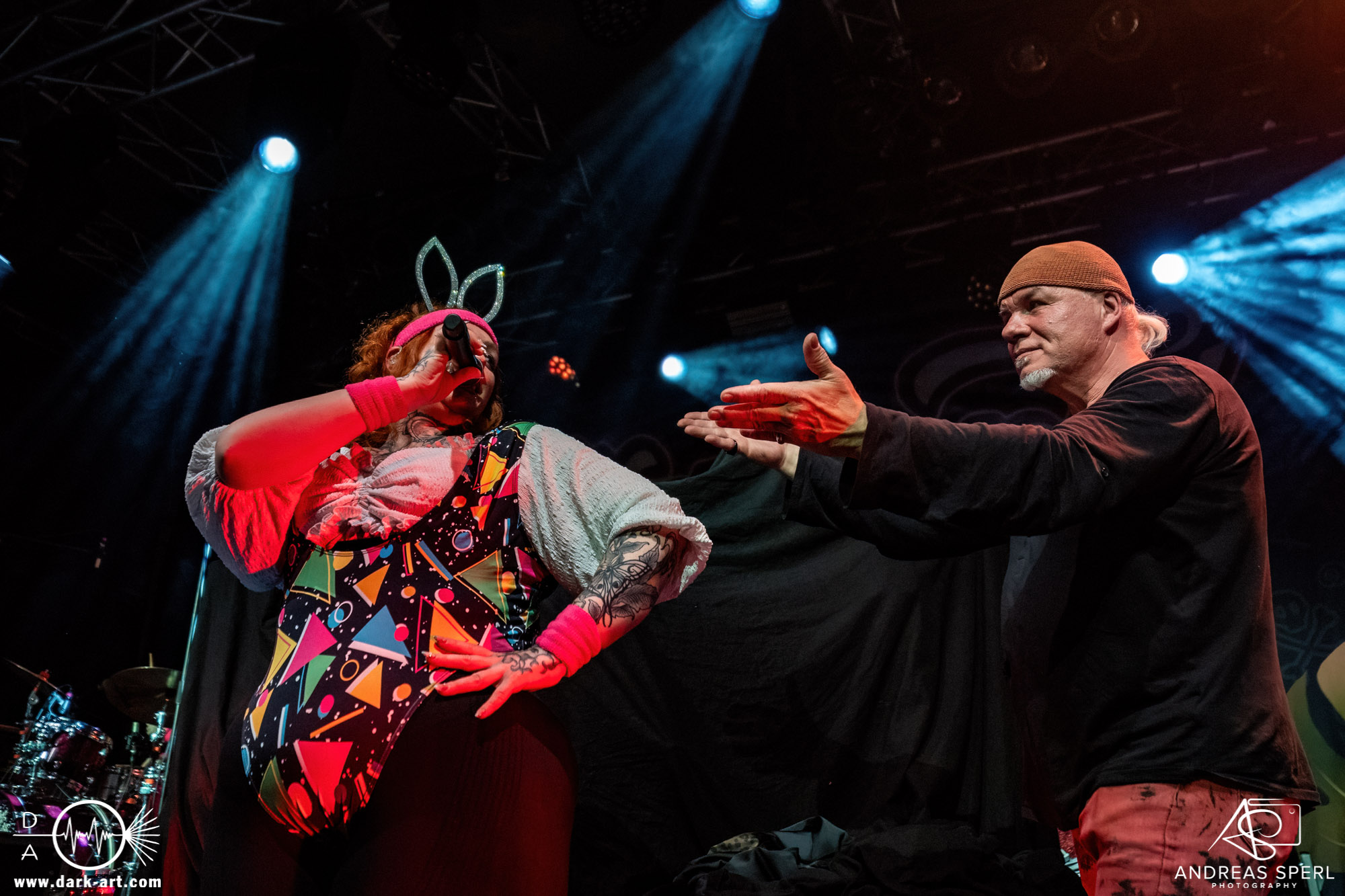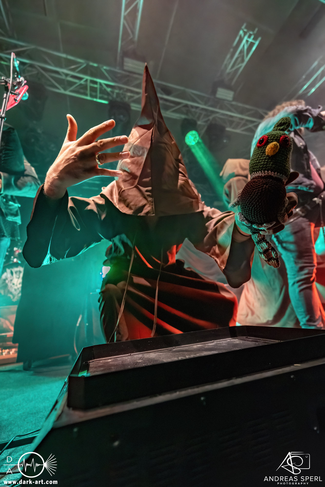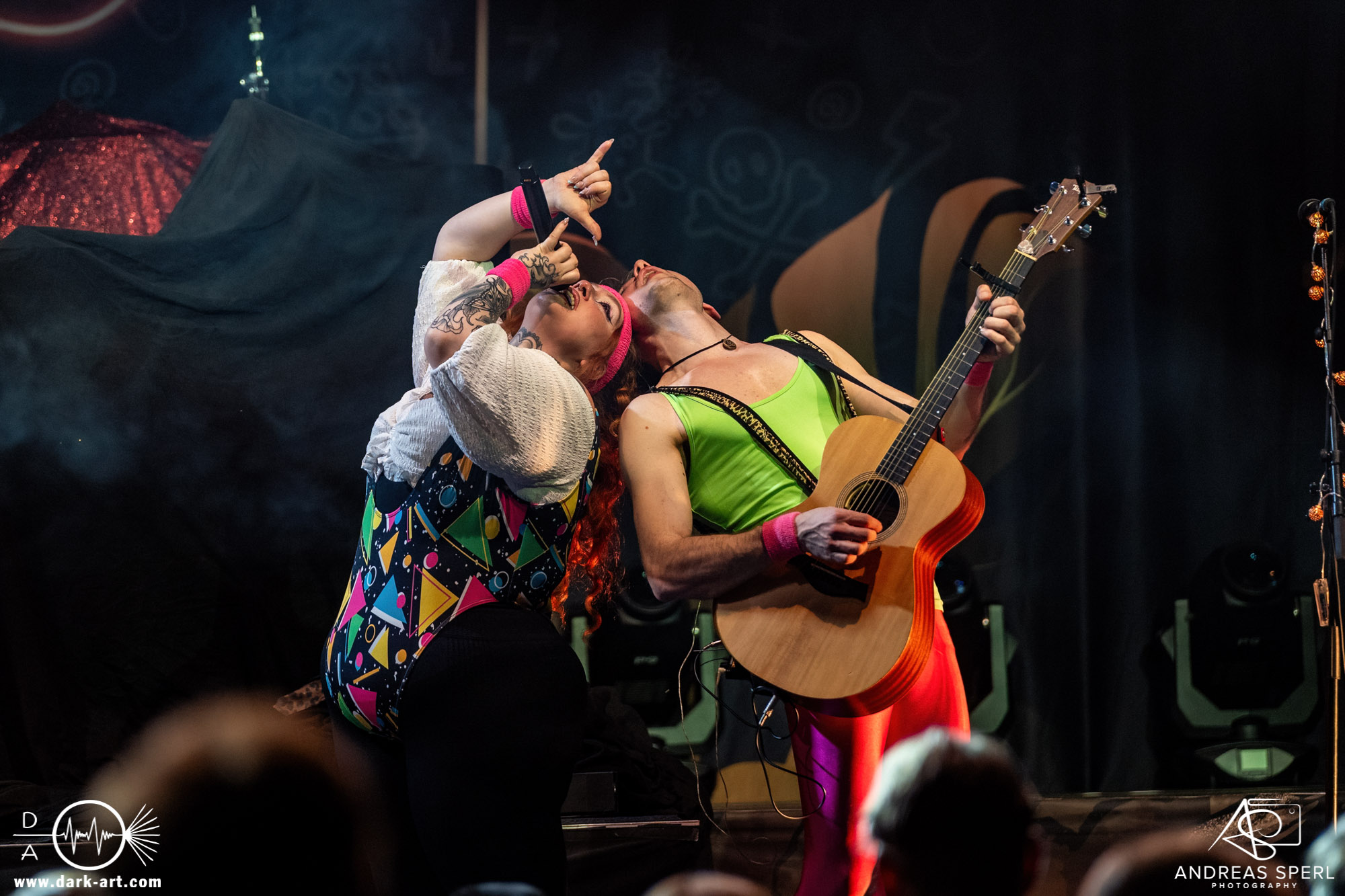 Zu Veitstanz stürmten schließlich auch Haggefugg und Kupfergold die Bühne. Kostümiert, ausgelassen und vollkommen im Moment aufgehend, verwandelten alle Beteiligten die Bühne in ein farbenfrohes Chaos aus Dudelsäcken, Gesang und Tanz. Mitglieder von Subway to Sally und Schandmaul wurden mit Perücken und roten Nasen ausgestattet, Eric Fish wurde mit eine blaue Perücke mit Fischschwanz geschmückt. Ein Bild irgendwo zwischen Wahnsinn, Tradition und purem Spaß. Genau hier zeigte sich, was die Eisheilige Nacht ausmacht: Gemeinschaft statt Distanz, Zusammenhalt statt Starallüren.