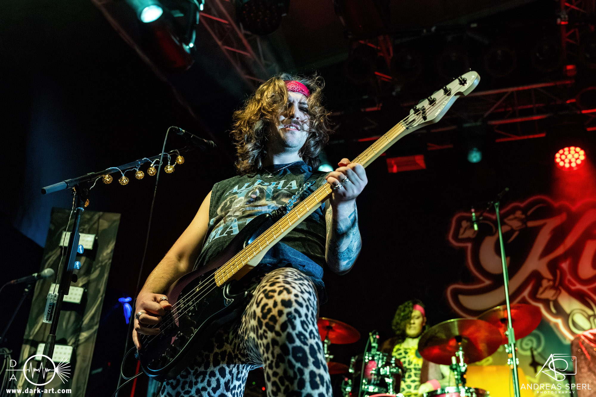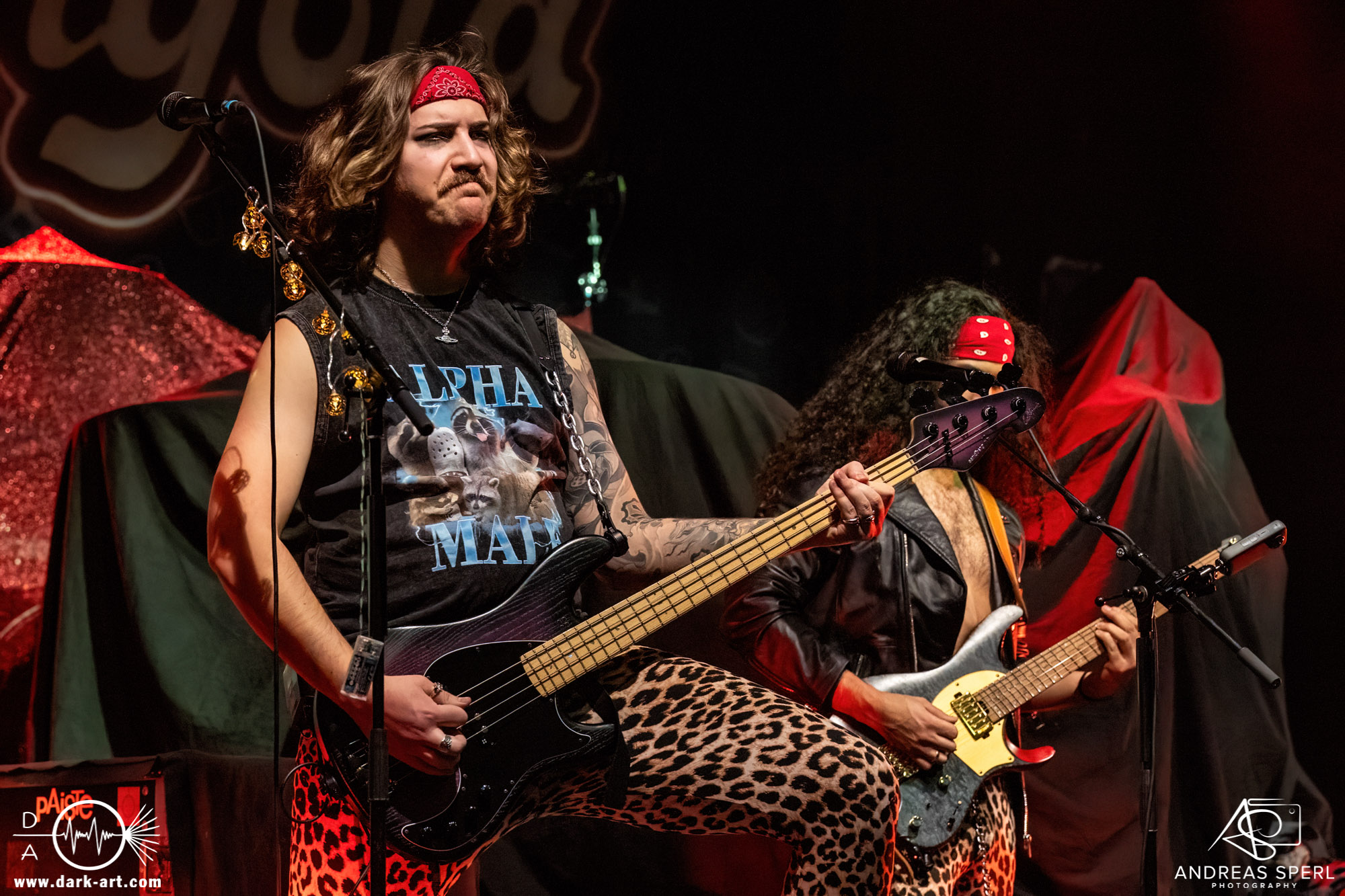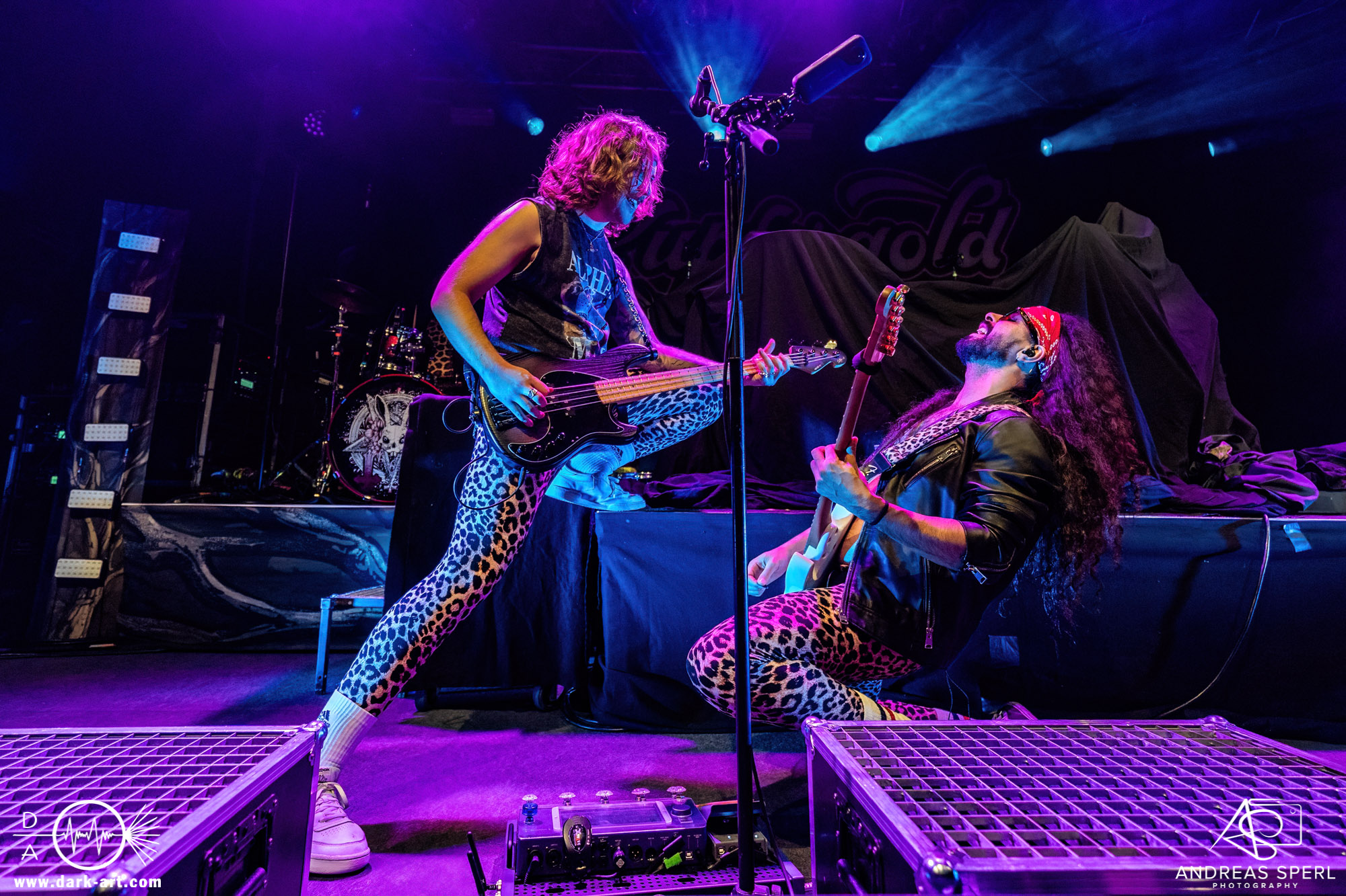 Ungewöhnlich waren bereits die optischen Elemente des Sets. Statt ihrer sonst eher folkigen Erscheinung präsentierte sich die Band in einem Outfit, das eher an eine Glam-Rock-Parodie erinnerte: rosa und Leopardenmuster-Spandex-Leggings, Stirnbänder, Lederjacken und Badeanzüge über der Kleidung. Sängerin Bonnie Banks und Gitarrist Eric betraten die Bühne zunächst sogar in Leopardenmuster-Bademänteln; ein Bild irgendwo zwischen Steel Panther, Karneval und bewusstem Kontrollverlust. Spätestens mit dem Opener Fasan Alarm war die Richtung klar vorgegeben: Kupfergold nahmen kein Blatt vor den Mund und machten aus der Halle kurzerhand einen einzigen, fröhlich eskalierenden Fasanenstall.