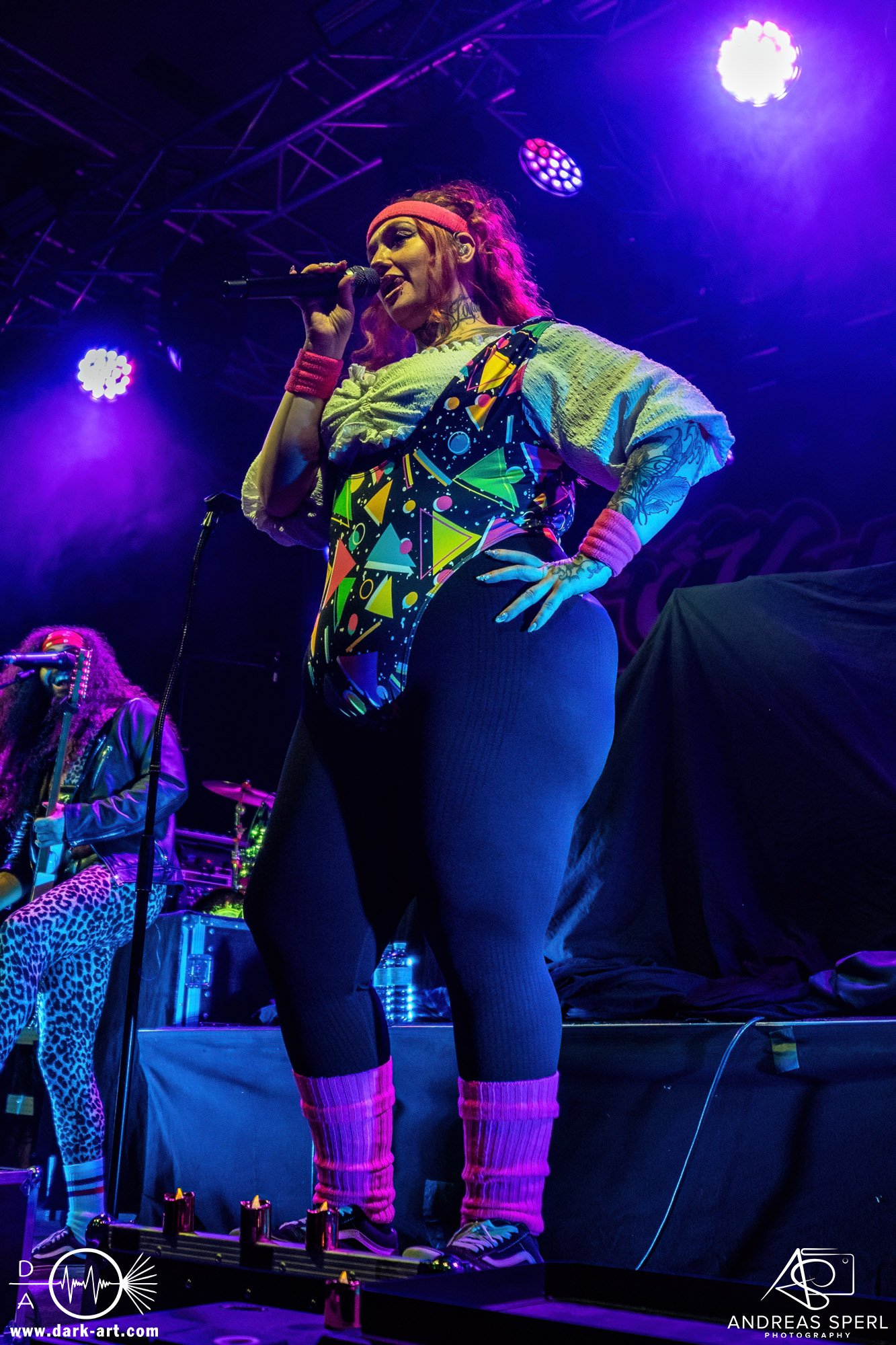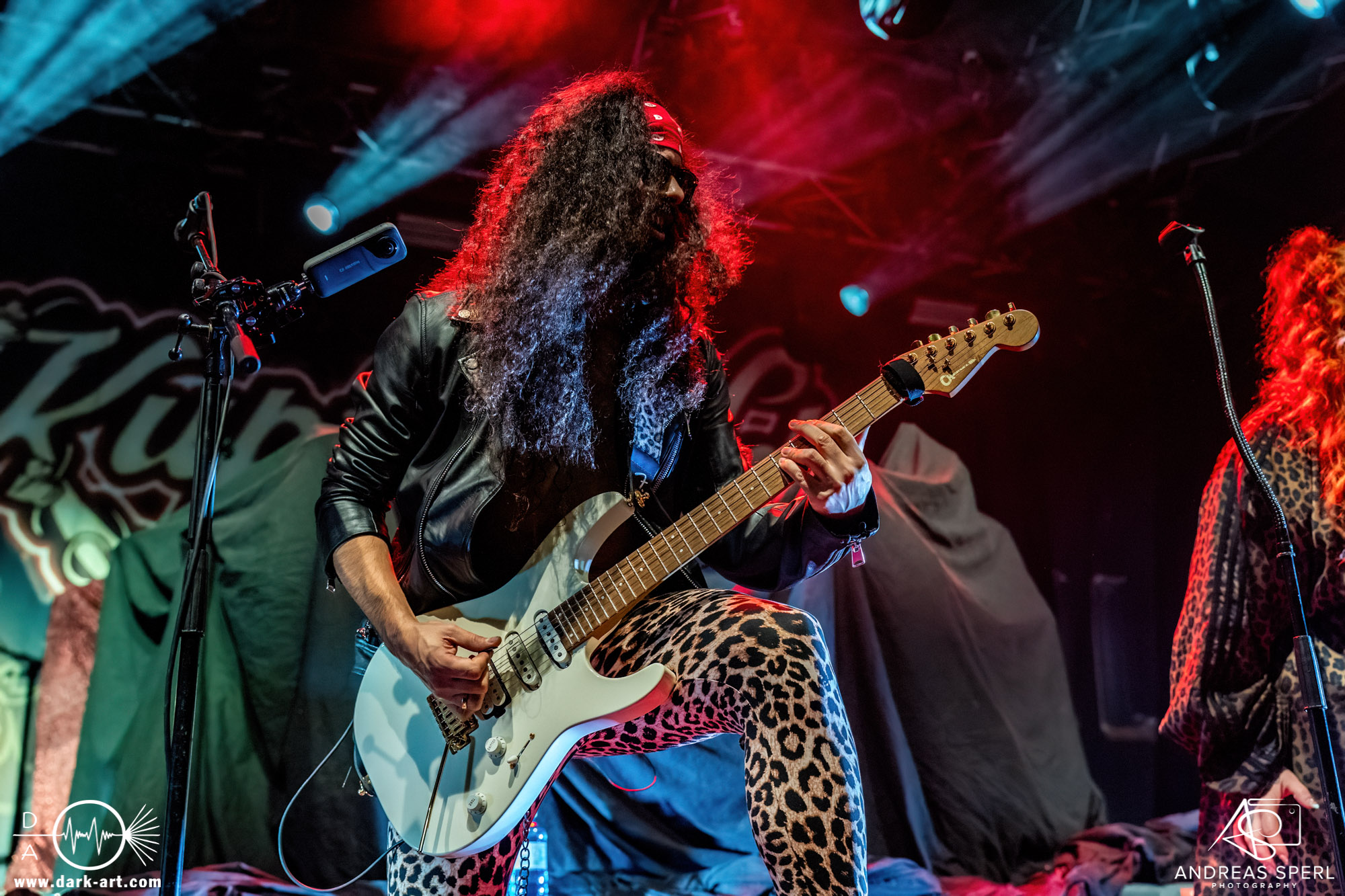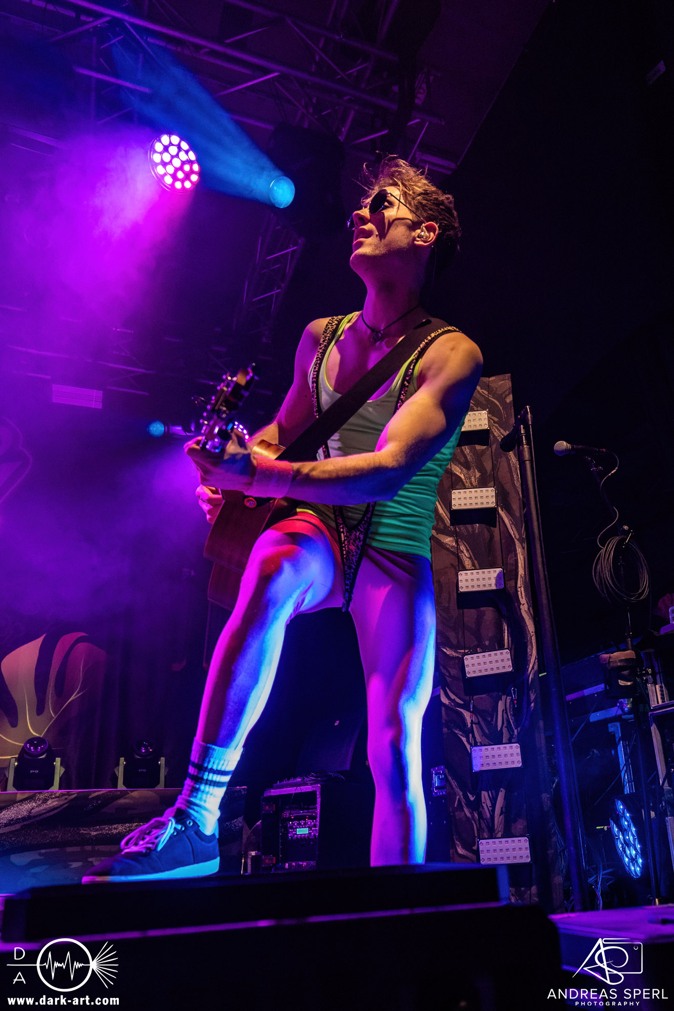Ungewöhnlich waren bereits die optischen Elemente des Sets. Statt ihrer sonst eher folkigen Erscheinung präsentierte sich die Band in einem Outfit, das eher an eine Glam-Rock-Parodie erinnerte: rosa und Leopardenmuster-Spandex-Leggings, Stirnbänder, Lederjacken und Badeanzüge über der Kleidung. Sängerin Bonnie Banks und Gitarrist Eric betraten die Bühne zunächst sogar in Leopardenmuster-Bademänteln; ein Bild irgendwo zwischen Steel Panther, Karneval und bewusstem Kontrollverlust. Spätestens mit dem Opener Fasan Alarm war die Richtung klar vorgegeben: Kupfergold nahmen kein Blatt vor den Mund und machten aus der Halle kurzerhand einen einzigen, fröhlich eskalierenden Fasanenstall.