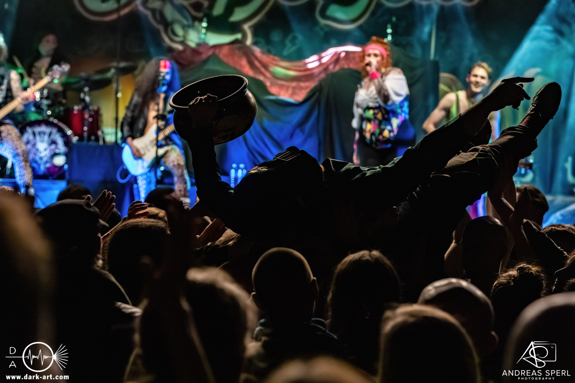 Besondere Bilder entstanden auch bei Tatzelwurm, als aufblasbare Krokodile durch die Menge surften, und bei Bunt und nicht braun, als bunte Riesenbälle über die Köpfe hinweg durch die Halle flogen. Spätestens hier sang, tanzte und feierte wirklich jeder Einzelne.