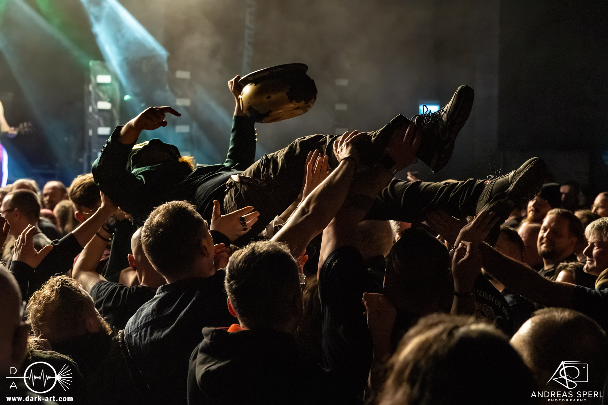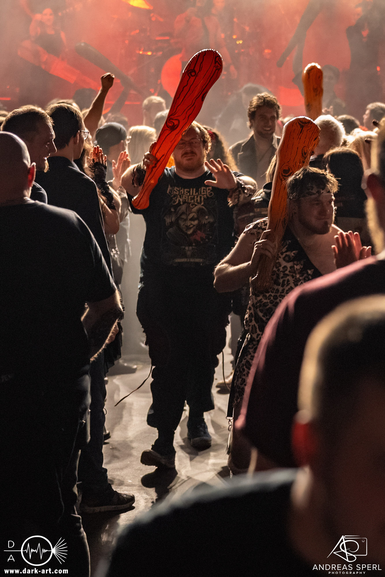 Wie schon so oft machten Schandmaul ihr Publikum zum festen Bestandteil der Show. Ob einfache Klatsch-Einlagen, pantomimische Spiele oder ein eigens einstudierter „Zombie-Tanz“, der dem Publikum in mehreren Stufen beigebracht wurde: erst winken, dann Zeitlupe, schließlich der vollständige Zombie-Walk inklusive einer Bewegung, um dem Nachbarn symbolisch das Herz herauszureißen. Die Halle machte bereitwillig mit und verwandelte sich in eine ausgelassene, mitspielende Gemeinschaft. Vor Der Teufel hat den Schnaps gemacht zog die Band noch einen augenzwinkernden Vergleich zum letzten Konzert in Bremen, genug, um die Stimmung weiter anzuheizen.
