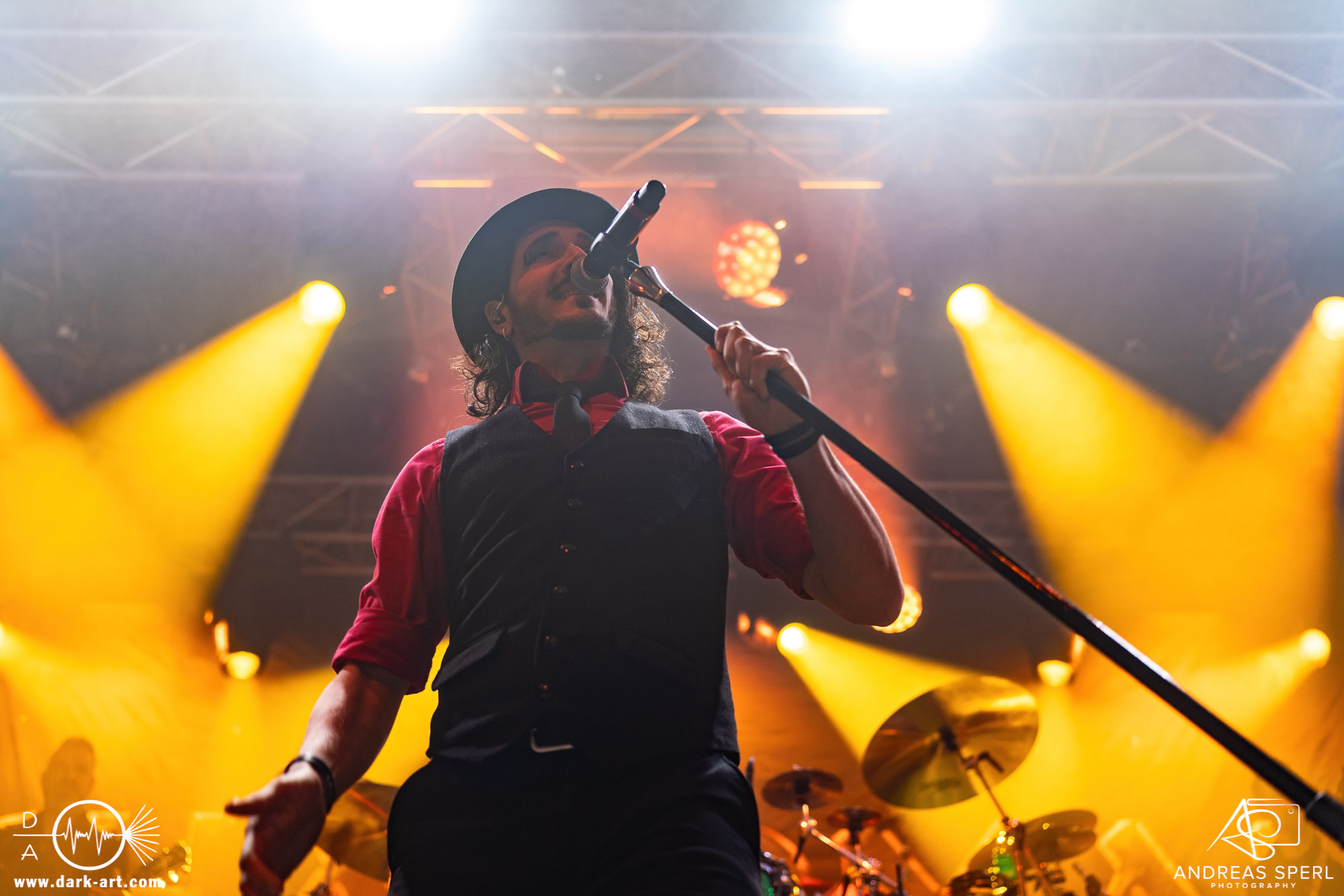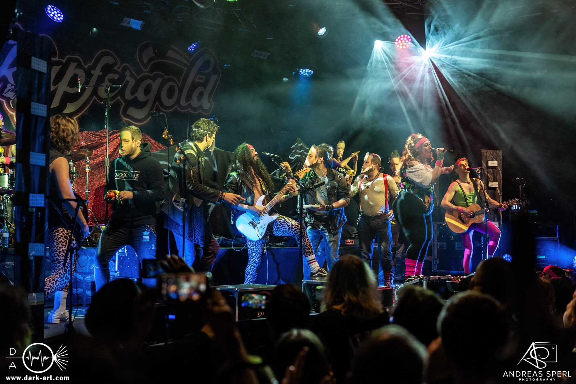 Mit Kupfergold wurde das Stimmungslevel direkt noch einmal deutlich angehoben. Kaum hatte die Band die Bühne betreten, war klar: Hier geht es nicht um Distanz oder große Inszenierung, sondern um Nähe, Spaß und kollektives Mitmachen. Vom ersten Moment an entstand das Gefühl, man würde sich schon lange kennen – ein Abend unter Freunden, nur eben mit deutlich mehr Lautstärke.