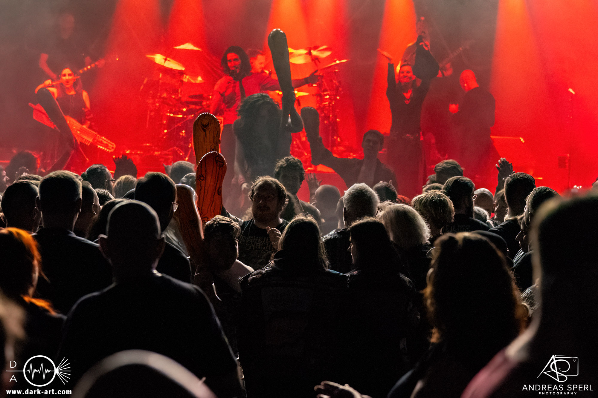 Zum Finale schlugen Schandmaul dann noch einmal den Bogen zurück zur puren Ausgelassenheit. Bei Knüppel aus dem Sack fand die Aufforderung zur Wall of Love großen Anklang, auch kamen mehrere Musiker der vorherigen Bands in Kostümen auf die Bühne, bewaffnet mit aufblasbaren Keulen, und zogen gemeinsam durch das Publikum. Mit Walpurgisnacht endete der Auftritt schließlich, jedoch nicht, ohne die Halle zuvor noch einmal zu einem langen, getragenen „ohohohoh“ zu animieren – ein Chor, der selbst während der Umbaupause noch nachhallte.