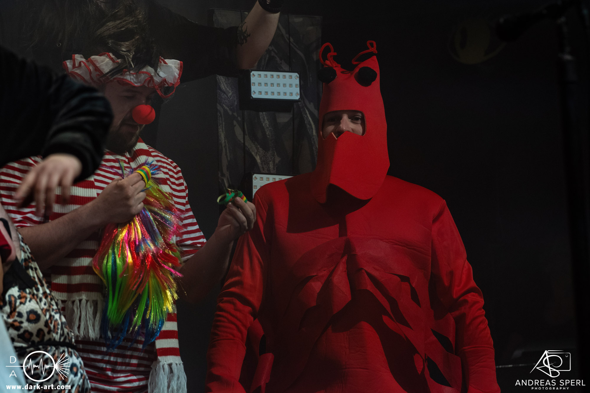 Gegen Ende des Sets wurde es dann so richtig ausgelassen. Ein verkleideter Kobold begab sich crowdsurfend ins Publikum, verteilte Süßigkeiten und initiierte einen großen Circlepit. Beim abschließenden Es ist Obst im Haus kamen schließlich auch Mitglieder von Haggefugg, mit Masken und Obst bewaffnet, auf die Bühne, sorgten für kontrolliertes Chaos und machten dem Songtitel alle Ehre, Vitamine inklusive.