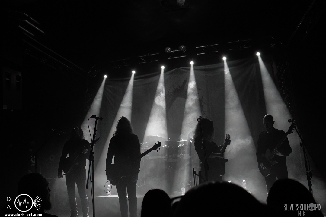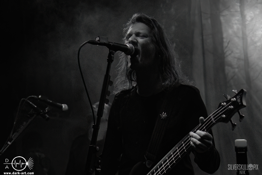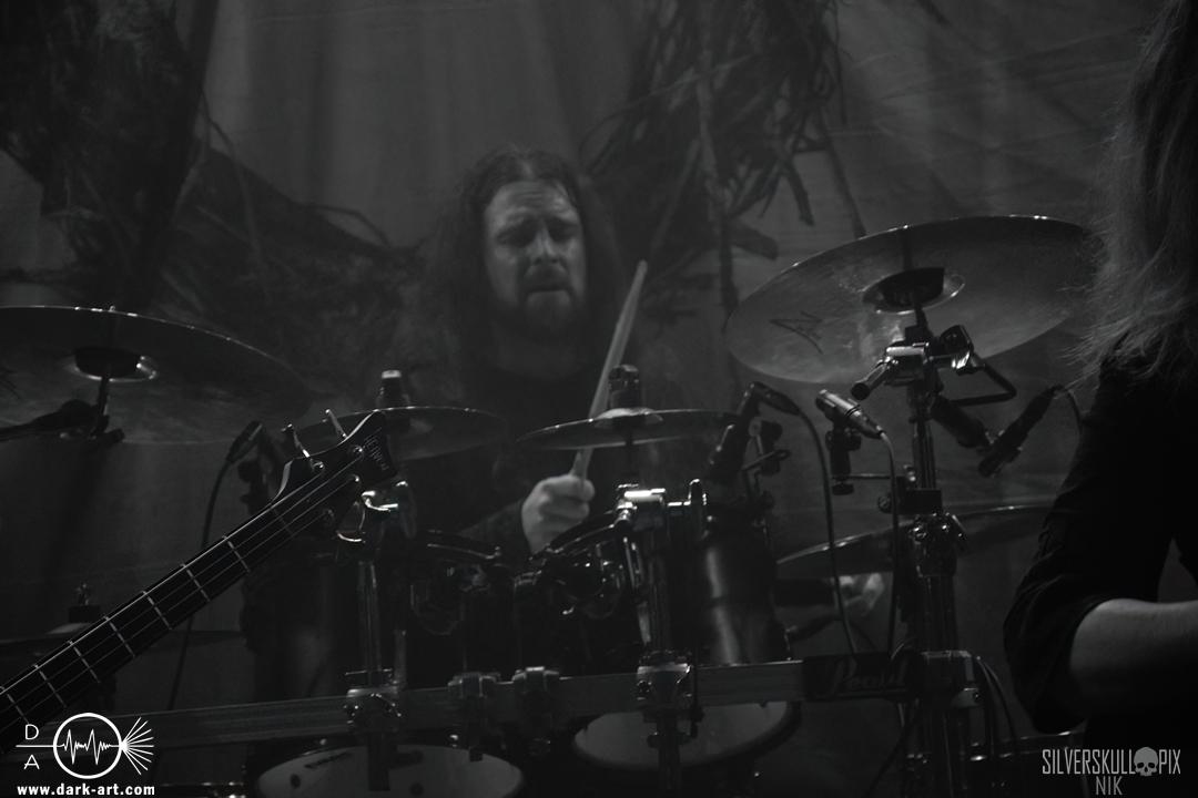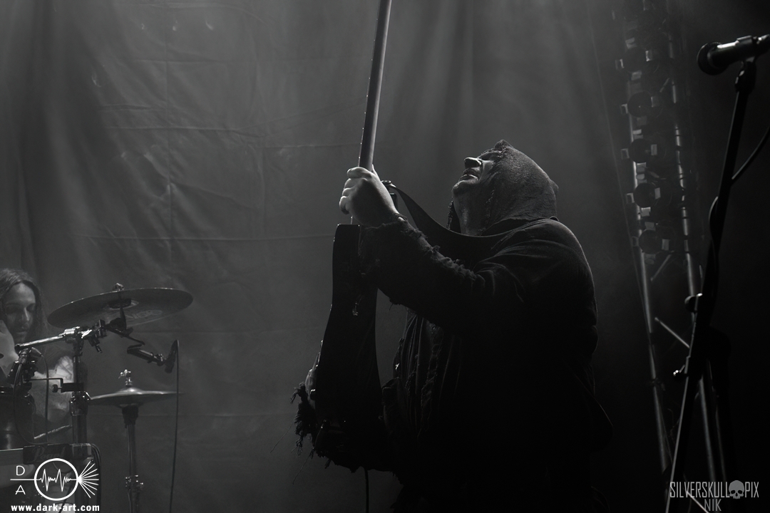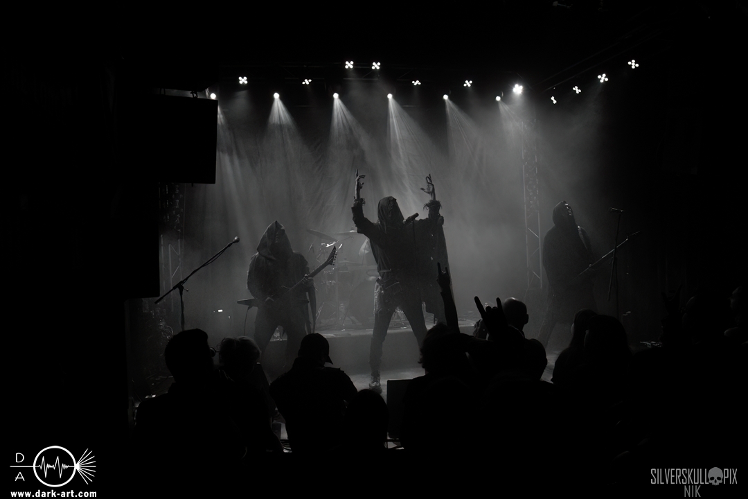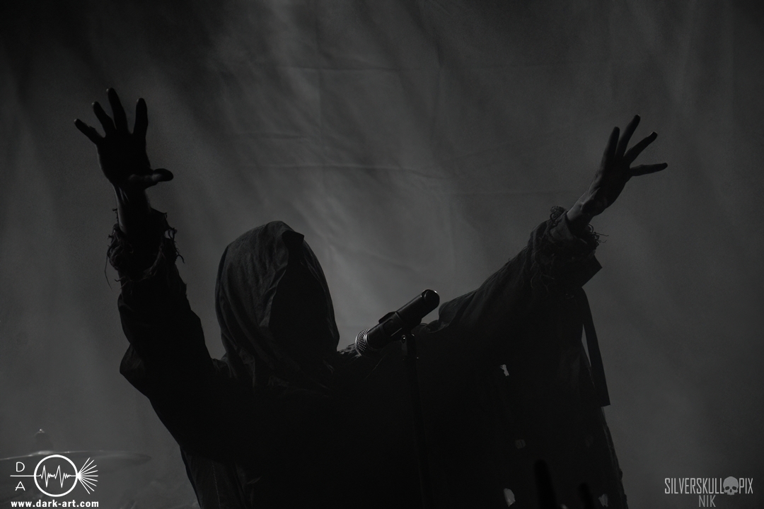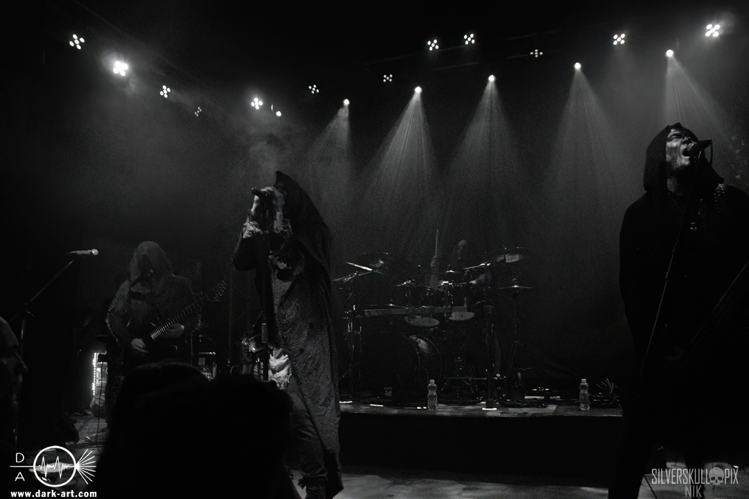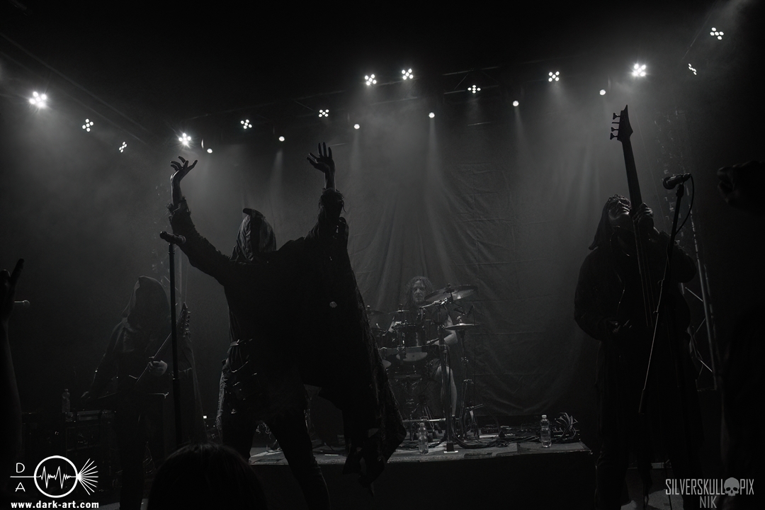 Dann war es endlich so weit und der Headliner des Abends betrat die Bühne. Mit ihrem naturverbundenen Atmospheric Black Metal boten uns Elderwind einen schönen Querschnitt ihrer Diskografie und bedienten mit der Setlist jedes ihrer vier Alben. Persy und Dmitry an den Saiteninstrumenten unterstützten immer wieder mit Backing Vocals, während Andrey die Drumsticks glühen ließ. In Kapuzengewänder gehüllt boten sie auch optisch ein klangvolles Bild und Sänger Alexander setzte oft auf die Wirkung seiner Hände. Im Zusammenspiel mit den Lichteffekten wirkte der ganze Auftritt sehr majestätisch, da hatte sich das lange Warten definitiv gelohnt. Die gekonnten Tempowechsel sorgten dafür, dass zu keiner Zeit Langeweile aufkam, Elderwind boten ein Klangbild, das zu Träumen verführte