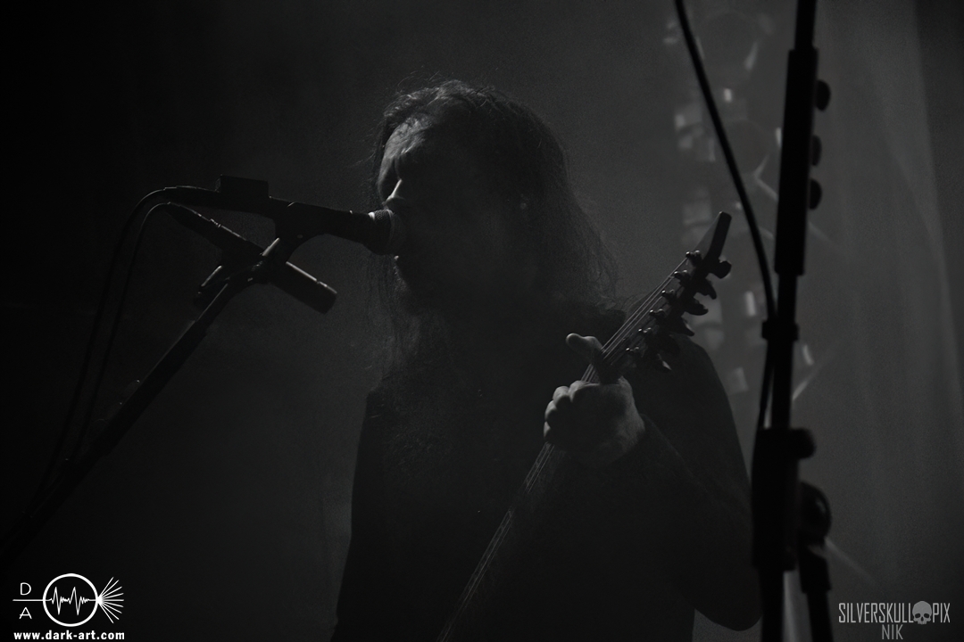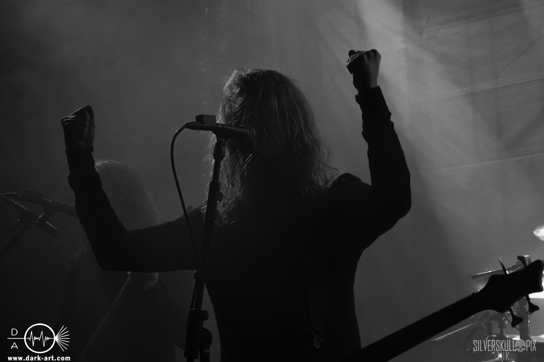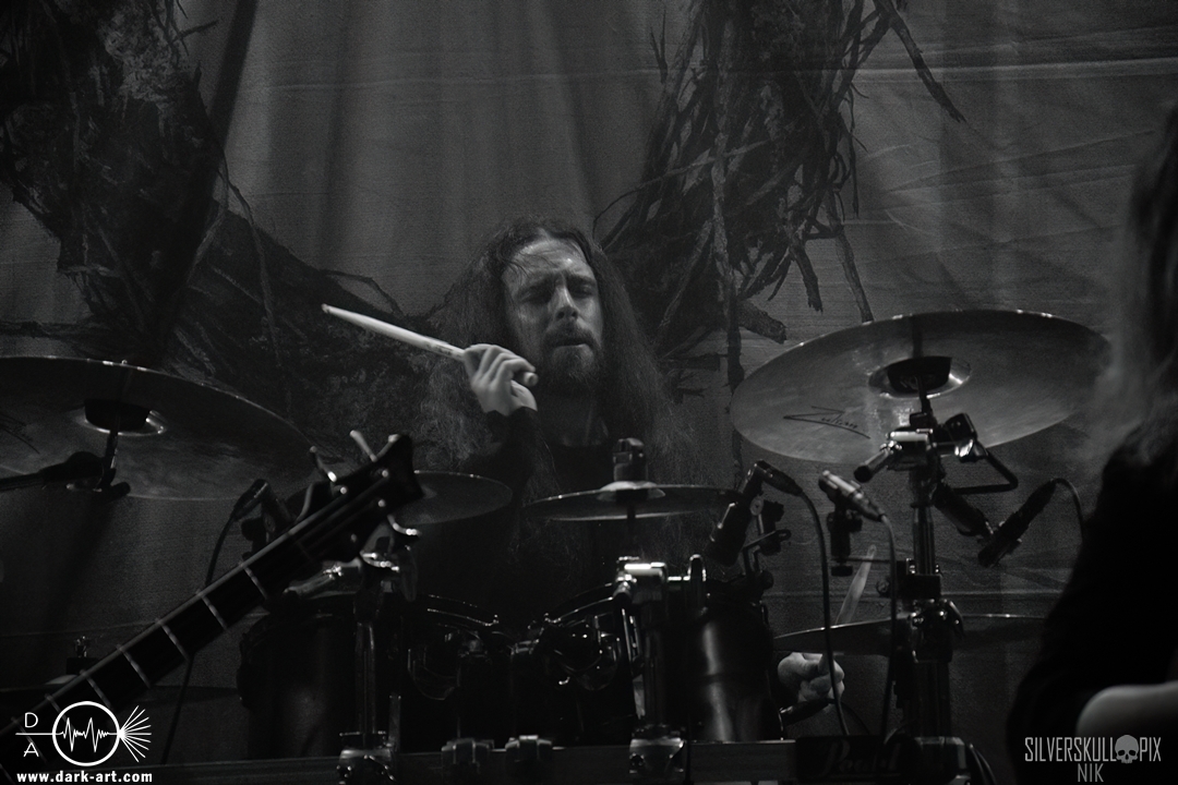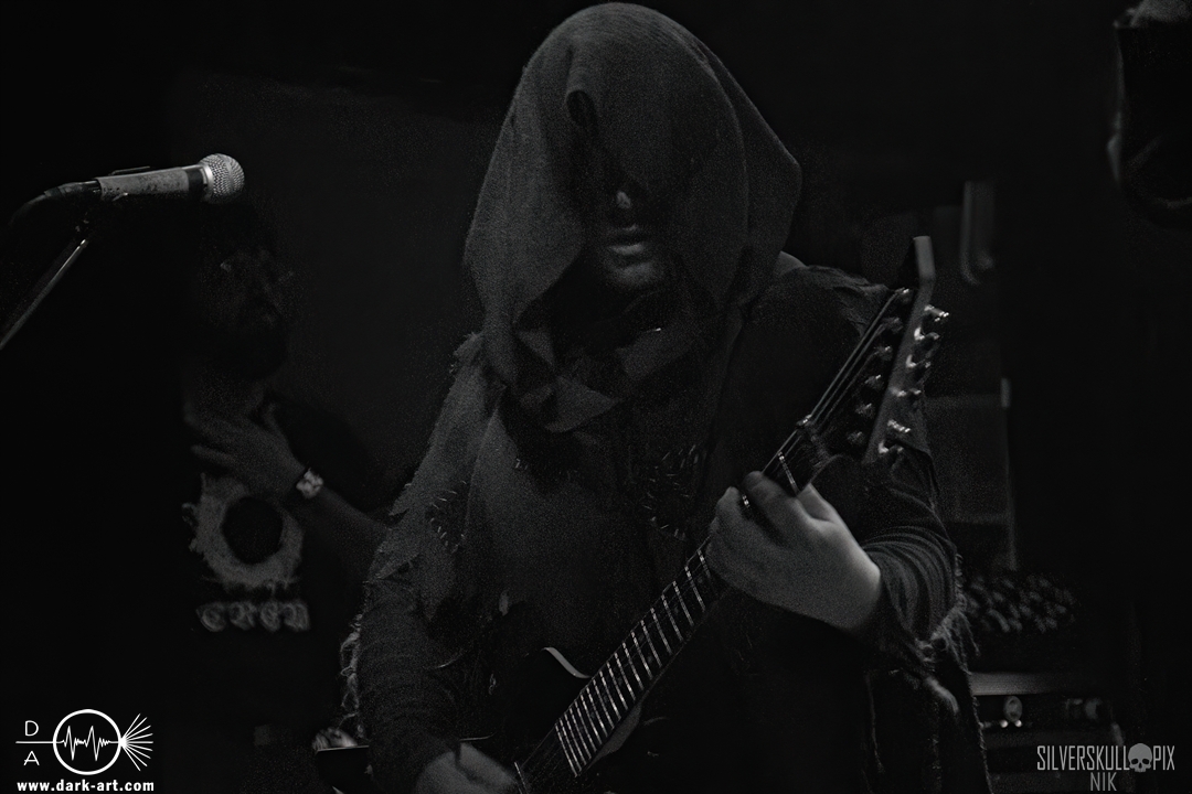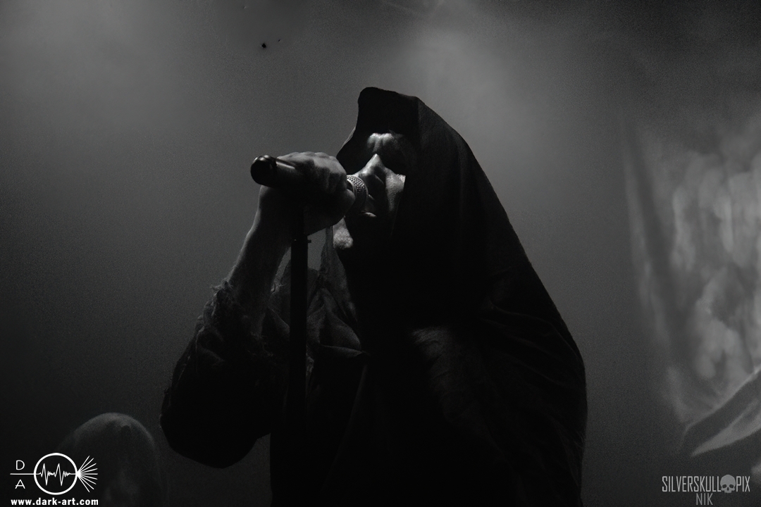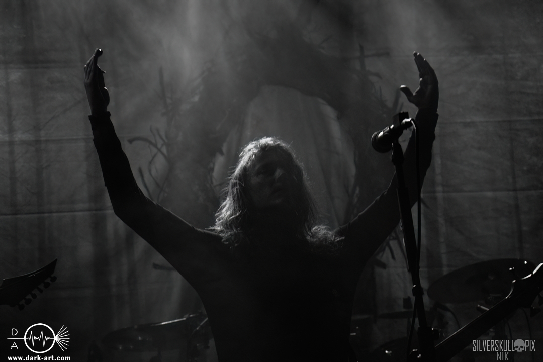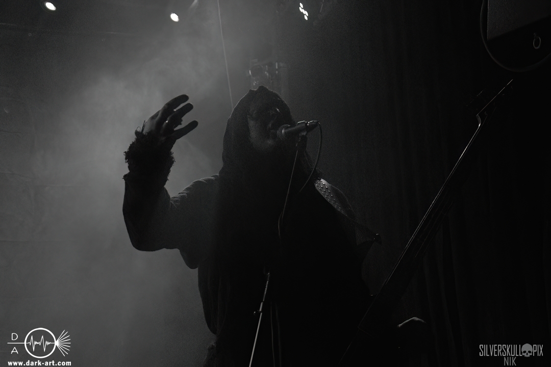 Dann war es endlich so weit und der Headliner des Abends betrat die Bühne. Mit ihrem naturverbundenen Atmospheric Black Metal boten uns Elderwind einen schönen Querschnitt ihrer Diskografie und bedienten mit der Setlist jedes ihrer vier Alben. Persy und Dmitry an den Saiteninstrumenten unterstützten immer wieder mit Backing Vocals, während Andrey die Drumsticks glühen ließ. In Kapuzengewänder gehüllt boten sie auch optisch ein klangvolles Bild und Sänger Alexander setzte oft auf die Wirkung seiner Hände. Im Zusammenspiel mit den Lichteffekten wirkte der ganze Auftritt sehr majestätisch, da hatte sich das lange Warten definitiv gelohnt. Die gekonnten Tempowechsel sorgten dafür, dass zu keiner Zeit Langeweile aufkam, Elderwind boten ein Klangbild, das zu Träumen verführte