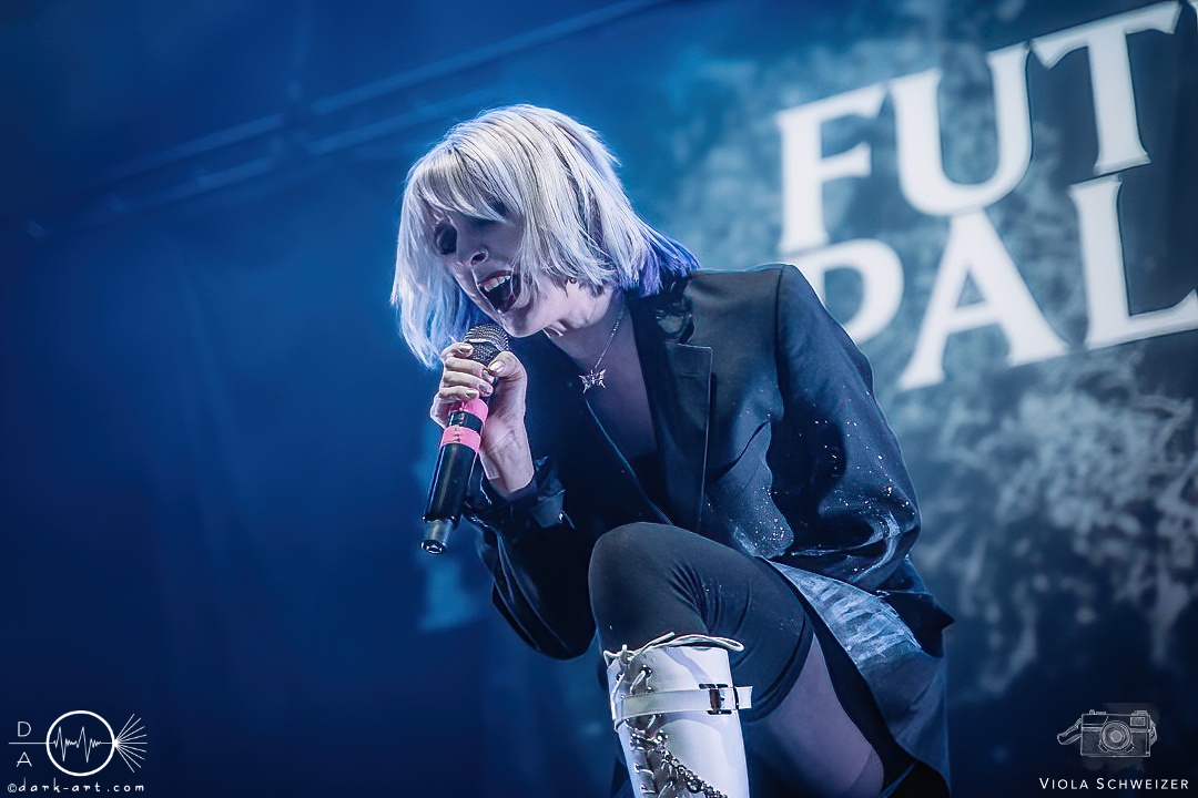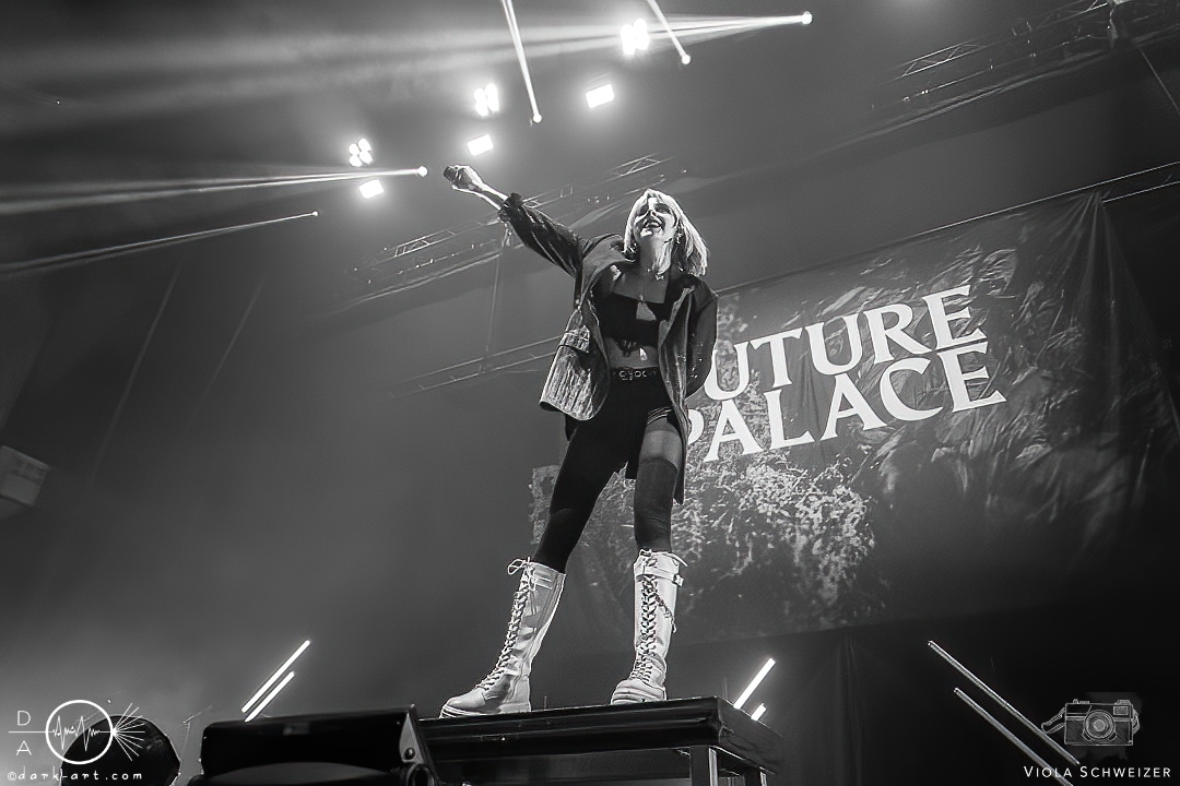 Das Licht in der Halle verdunkelte sich und die einzelnen Mitglieder der ersten Band kamen von rechts auf die Bühne. Mit begeisterten Jubelrufen begrüßte das Publikum Future Palace, welche sich kurz mit lauter Stimme vorstellten, „wir sind Future Palace aus Berlin“. Das Logo auf dem Bühnenhintergrund diente als beeindruckende Dekoration und verlieh der Show zusätzliche visuelle Wirkung.