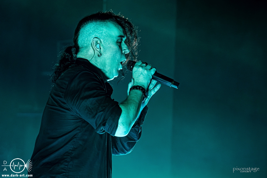 Mit Timekiller betrat Peter Spilles die Bühne und die Halle tobte. Was sofort auffiel, war das Fehlen des charakteristischen blauen Streifens, der sonst das Gesicht zierte, aber vielleicht ist es einfach Zeit für etwas Neues. Er stand auf einem kleinen Podest, dessen Quadrate in der Farbe der Scheinwerfer aufleuchteten. Im Hintergrund war das Project Pitchfork Emblem zu sehen. Als Nächstes folgte Song of the Winds, ein altes Stück von 1992, welches eher selten live zu hören ist, was ein Raunen der Begeisterung hervorrief. Danach begrüßte er die zahlreichen Besucher „Hallo Langen, ist ja schön bei euch und toll, dass jeder noch jemand mitgebracht hat“, was zu einigen Lachern im Publikum führte. Allerspätestens als die ersten Töne von Conjure erklangen, hatte er die Zuhörer am Wickel, das daraufhin am Jubeln, Toben und Tanzen war, aber auch Peter Spilles stand nicht still und tanzte auf der Bühne. Was nicht wirklich verwunderlich war, denn der Sound von Project Pitchfork geht ins Blut, rauscht ins Gehirn, das nur den Befehl „Beweg dich“ gibt, während Spilles in der eigenen Musik völlig untertauchte und im Applaus der Menge badete.