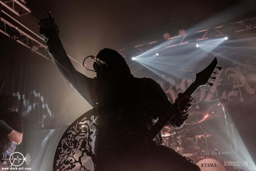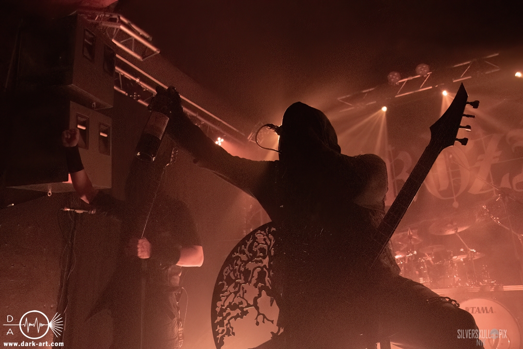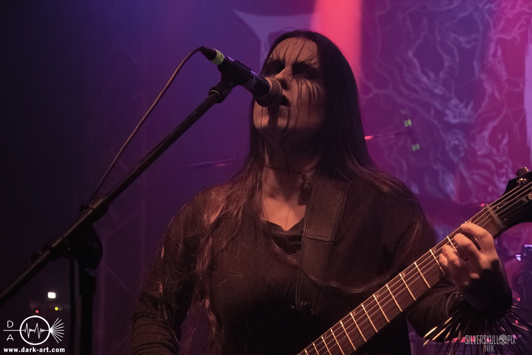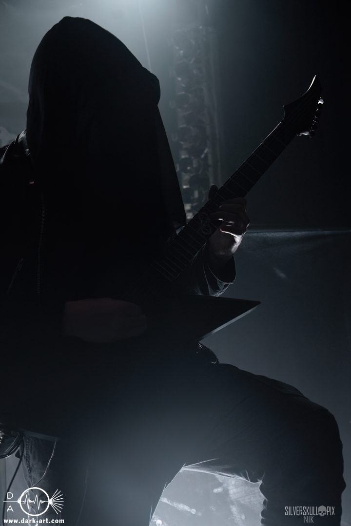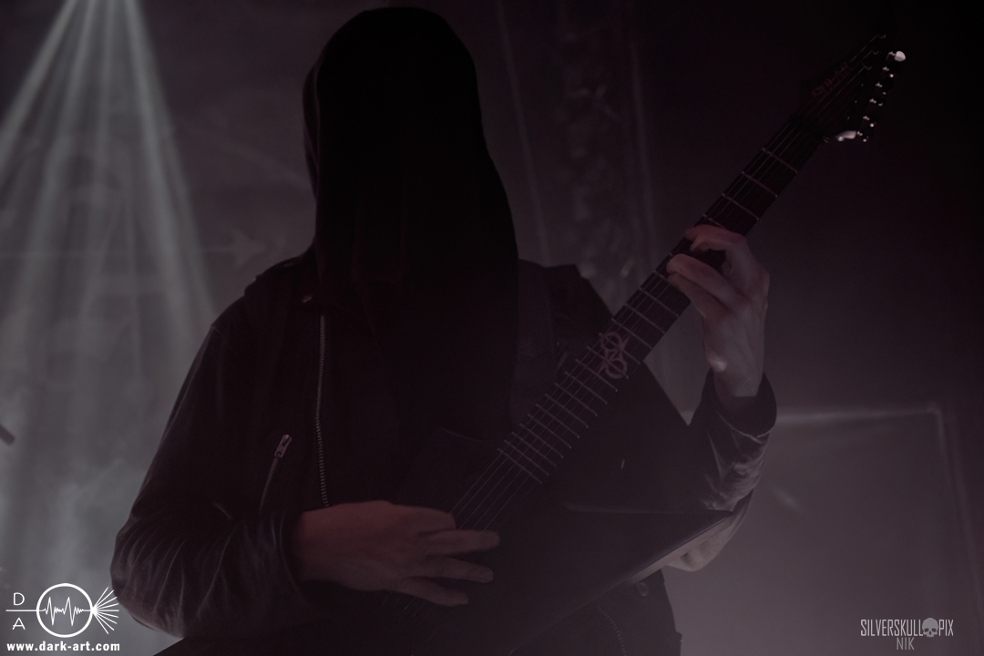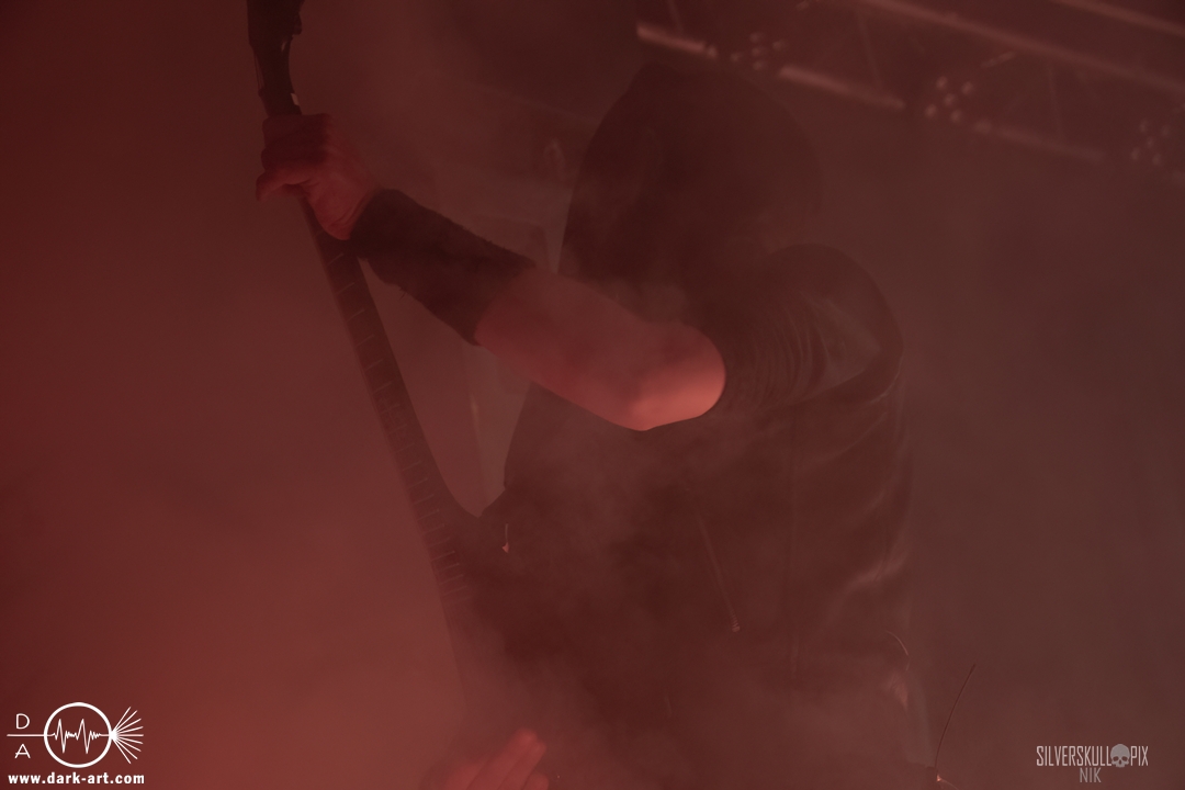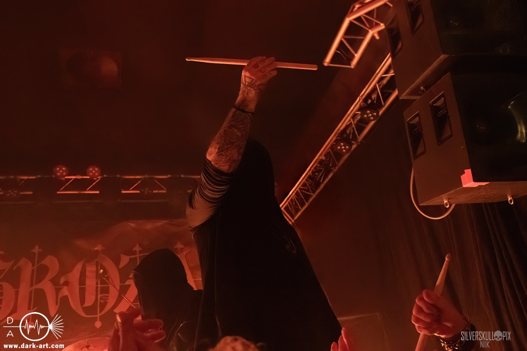 Dann zierte Yggdrasil der Weltenbaum das Bühnenbild und es war Zeit für Groza. Erneut standen P.G. und U.A. auf der Bühne, diesmal gemeinsam mit S.R. und T.H.Z. In ihren bekannten Outfits mit den schwarzen Schleierkaputzen legten sie so richtig los. Zu Beginn des Sets und dem einleitenden Asbest war der Sound zunächst noch etwas dürftig, doch dieser wurde nach und nach immer stärker. Und mit ihm auch die Band. Mit Songs wie Equal.Silent.Cold oder Dysthemian Dreams aus ihrem aktuellen Album Nadir beschworen Groza eine packende Atmosphäre herauf. P.G. und U.A. wechselten sich gekonnt mit den Vocals ab, insgesamt war das alles sehr nah an der Perfektion. Mit Elegance of Irony oder Unified in Void bedienten sie ihre älteren Alben, die natürlich nicht fehlen durften. Auch die ruhigen, instrumentalen Abschnitte passten sehr gut ins Gesamtbild, sie wirkten zu keiner Zeit zu lang, da stimmte einfach alles. Ein emotionaler Auftritt fand seinen Höhepunkt, als sie den Song Daffodils ihrem verstorbenen Freund Mike widmeten. P.G. und T.H.Z tranken auf ihn, man konnte den Schmerz und die Emotionen wirklich greifen. Groza bedankten sich bei der ausverkauften Location, die einen sehr würdigen Rahmen für ihre erste Headliner-Tour durch Europa bot.