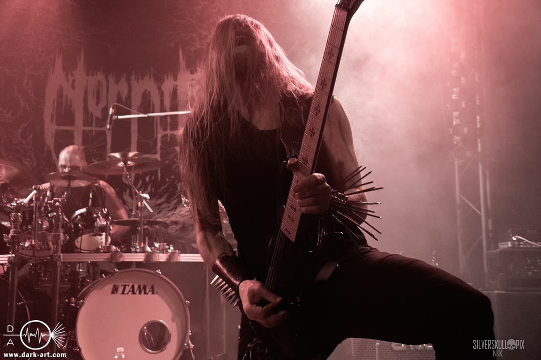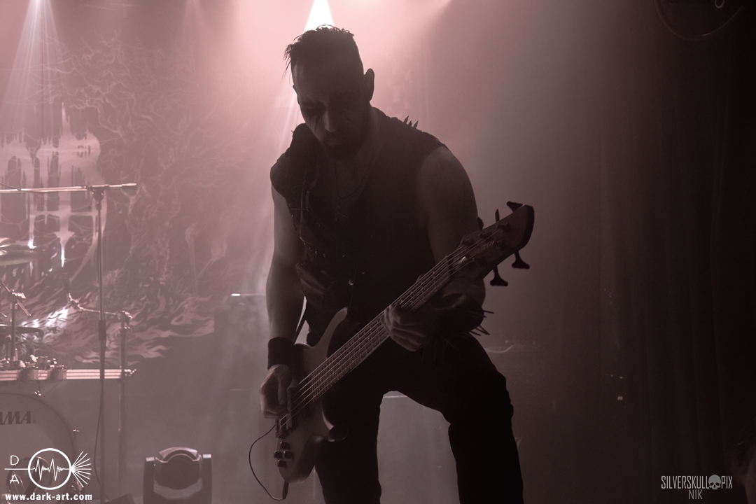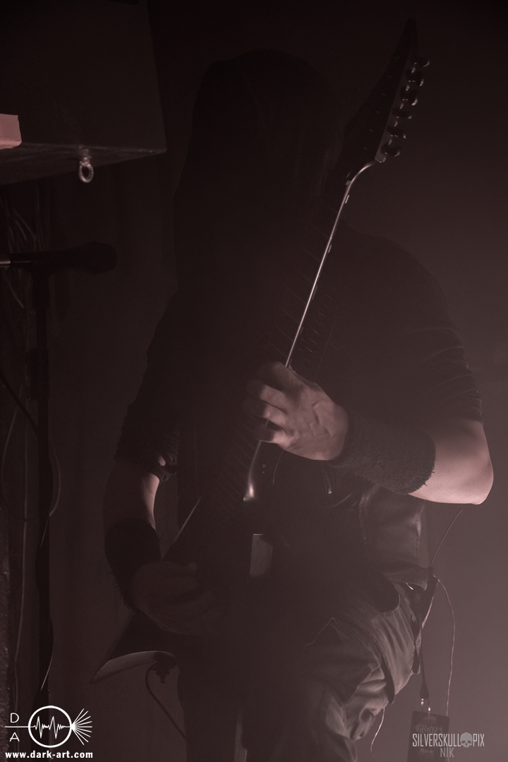 Los ging es mit Antikvlt aus Wien, die uns einen spannenden Sound aus den Boxen zimmerten. Das Duo um Chris Marrok von Anomalie und Daniel Johansson von Draconian hatte sich tatkräftige Unterstützung an Bord geholt: P.G. und U.A. von Groza schnallten sich Bass und Gitarre um und so sorgten sie zu Viert für einen gelungenen Start in den Abend. Ohne große Ansagen ließen sie es mal walzend angehen, mal ließen sie ein saftiges Riffgewitter über uns hereinbrechen. P.G. unterstützte Chris immer wieder mit Backing Vocals und so entstand stellenweise eine düstere Atmosphäre, die nicht selten Ritual-Charakter bekam. Mit dabei hatten sie natürlich auch ihr Debütalbum A Revelation of Intoxication, das sie sehr erhaben und absolut würdig vorstellten. Alles in allem waren Antikvlt ein sehr guter Opener, man sollte sie auf jeden Fall im Auge behalten