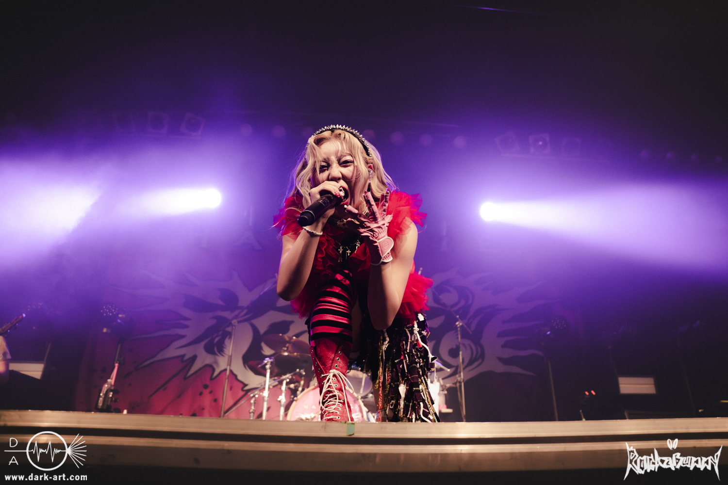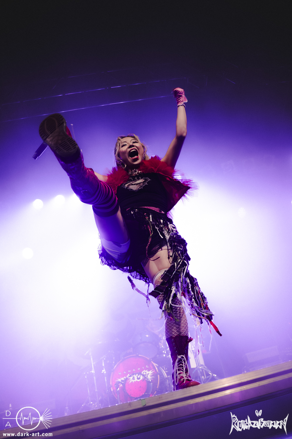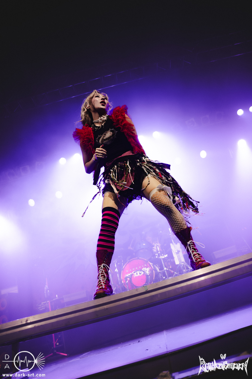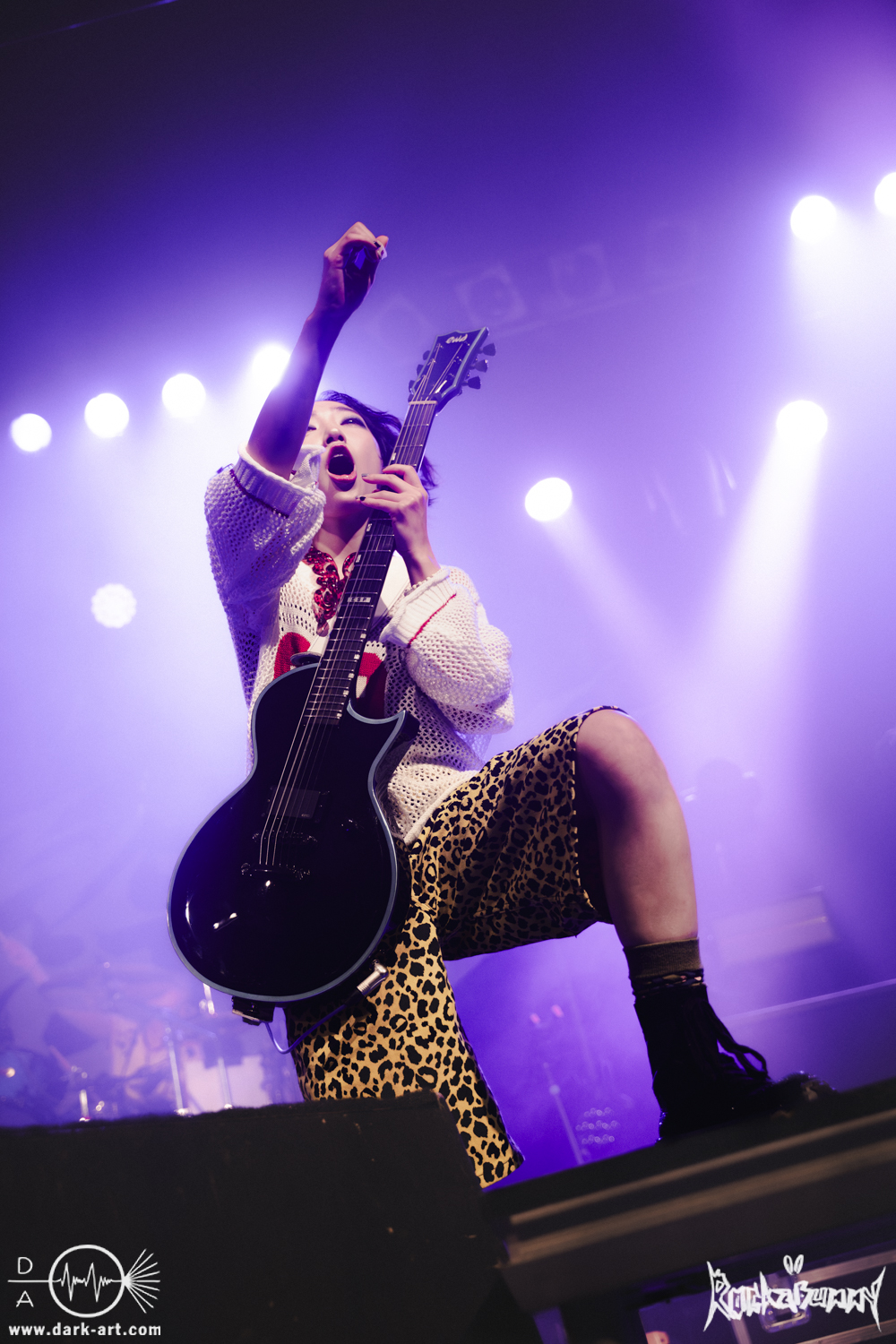Das Quartett aus Japan eröffnete ihr Set mit dem Song O•TA•KU Lovely Densetsu und brachte von Sekunde Eins volle Energie auf die Bühne. Mit ihrem Misch aus heavy Gitarren, wilden Screams und farbenfroher, japanischer Ästhetik hatten sie die ausverkaufte Live Music Hall im Nu in der Hand.