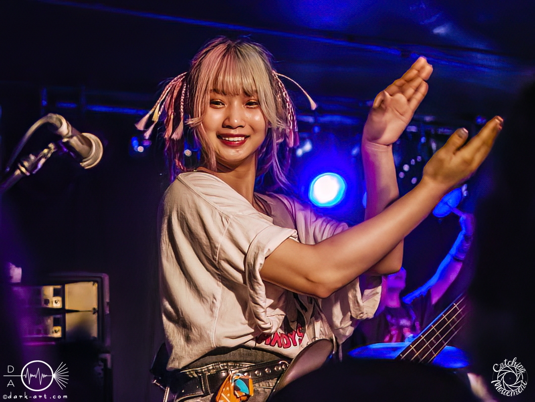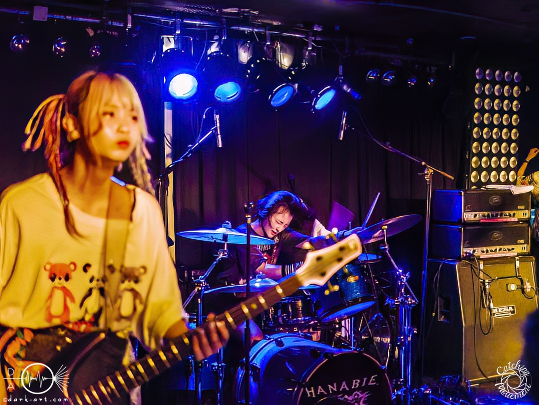Die Wartezeit half dabei, dass man die Klamotten weiter durchschwitzte und man gefühlt sich auch unter eine Dusche hätte stellen können. Man wäre nicht nasser gewesen. Und Hanabie stand noch bevor. Nachdem die Umbaupause vorbei war und das Licht wieder ausging, kamen dann die vier Bandmitglieder eine nach der anderen auf die Bühne, Yukina als letzte mit einer Deutschlandfahne. Und ab dann war kein Halten mehr. Wie von mir vermutet, machten sich die vier drauf und dran das Nachtleben abzureißen. Es wurde immer heißer und heißer, aber die Zuschauer störte das nicht. Yukina zeigte in beeindruckender Weise, wie gut sie den Wechsel zwischen Growls, Screams, normalem Gesang und der Kawaii-typischen Art zu singen, beherrscht. Wenn sie loslegt mit ihren Screams, brüllt sie einen förmlich an die Wand. Oder alternativ in die Menge hinter einem, die eh kein Platz hat auszuweichen. In den paar Pausen zwischen den Liedern wurden immer wieder mal Fächer ausgepackt, sowohl im Publikum, als auch von den Musikerinnen. Diese versuchten auch den Menschen in den ersten paar Reihen damit Frischluft zuzufächern, doch heiße Luft bleibt heiße Luft. Und sollte das Nachtleben eine Klimaanlage besitzen, spätestens an dem Abend musste sie einen grausamen Tod sterben. Das ganze tat aber dem Spaß keinen Abbruch, der auch durch kleinere Späße auf Englisch hervorgerufen wurde. Als die ersten Töne von Osaki ni Shitsurei Shimasu (eigentlich お先に失礼します。, aber das können hierzulande ja die wenigstens lesen 😉 ) kamen, brandete besonderer Jubel auf. Nach nicht mal einer Stunde und einer kurzen Zugabe von einem Lied, war der Auftritt dann vorbei. Er war zwar kurz, aber dafür extrem intensiv und Lust machend auf mehr. Eine etwas größere Halle stände den vieren bestimmt gut zu Gesicht, vielleicht ja auf der nächsten Tour.