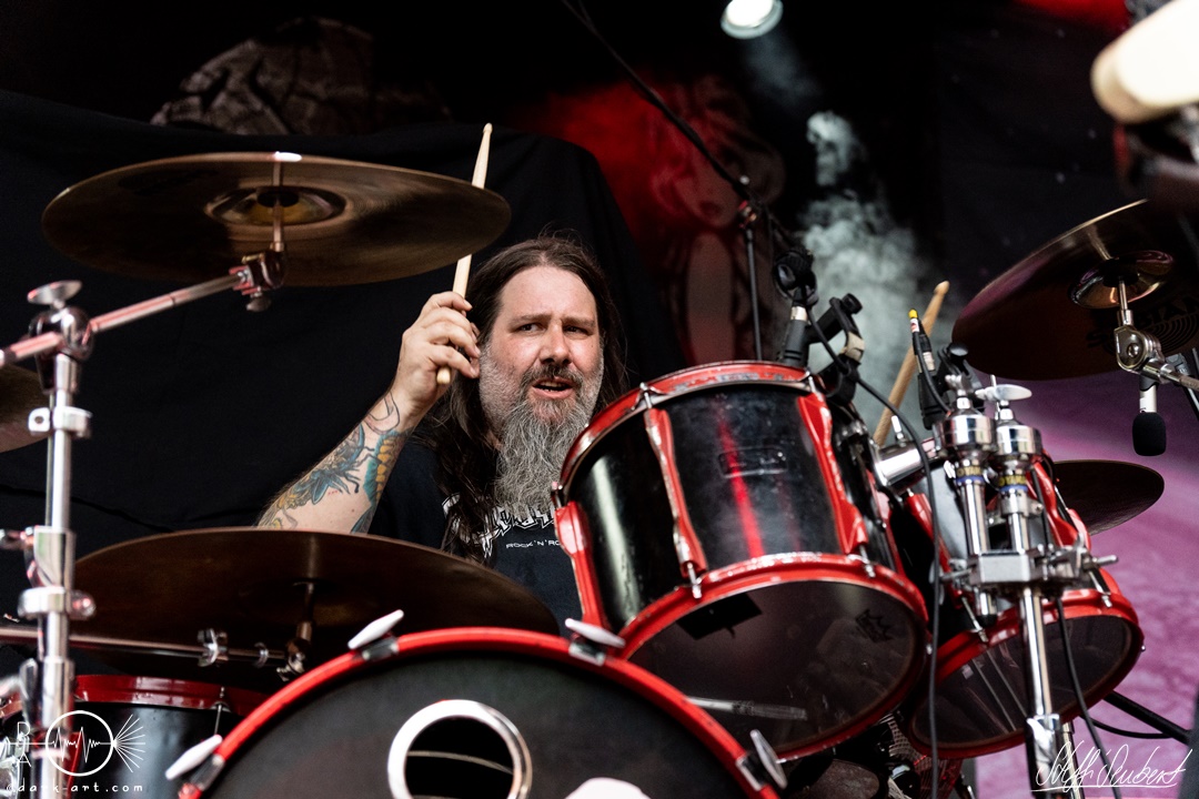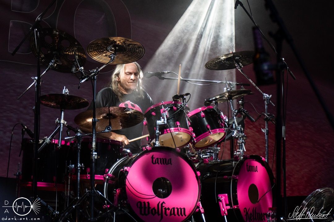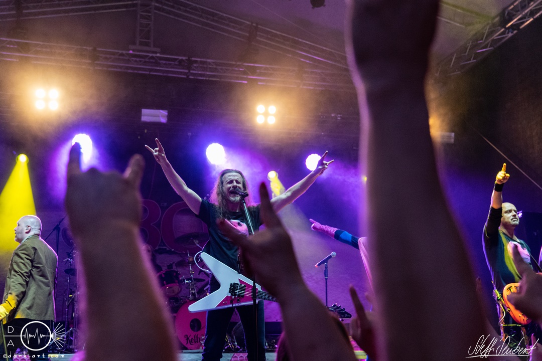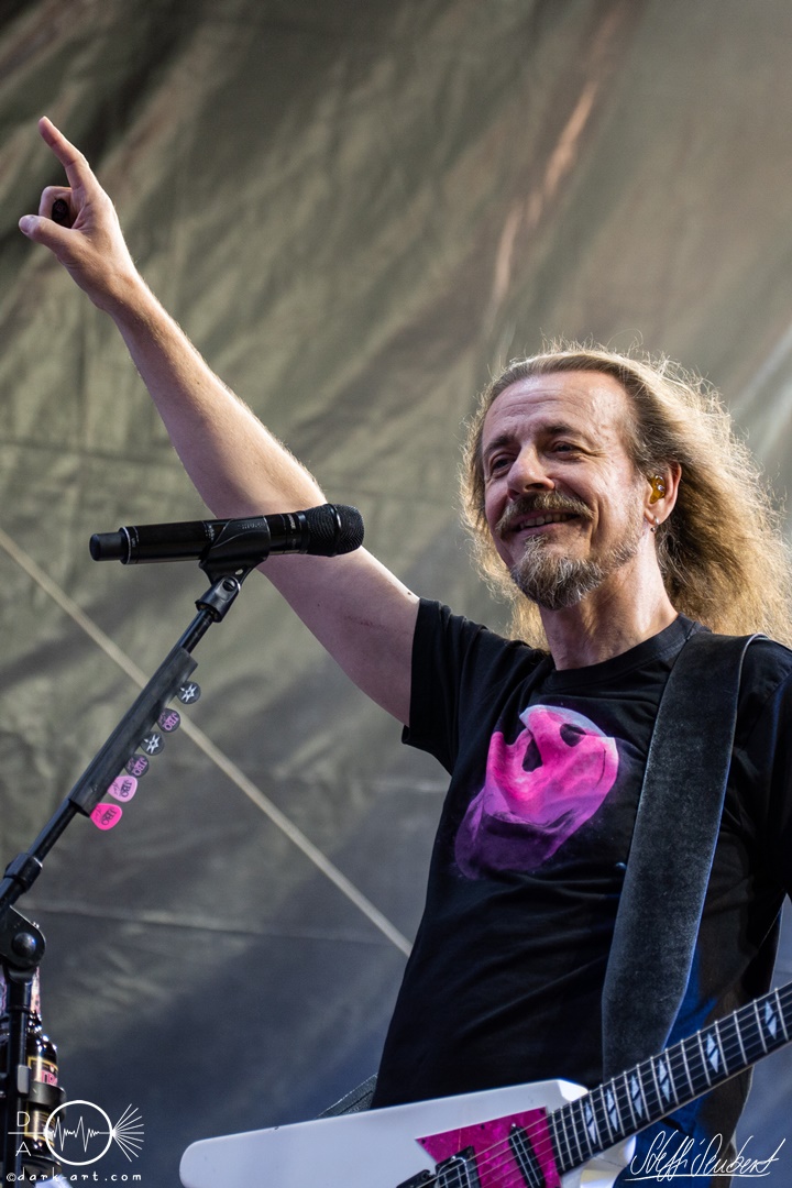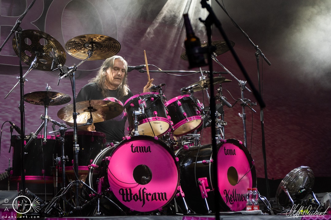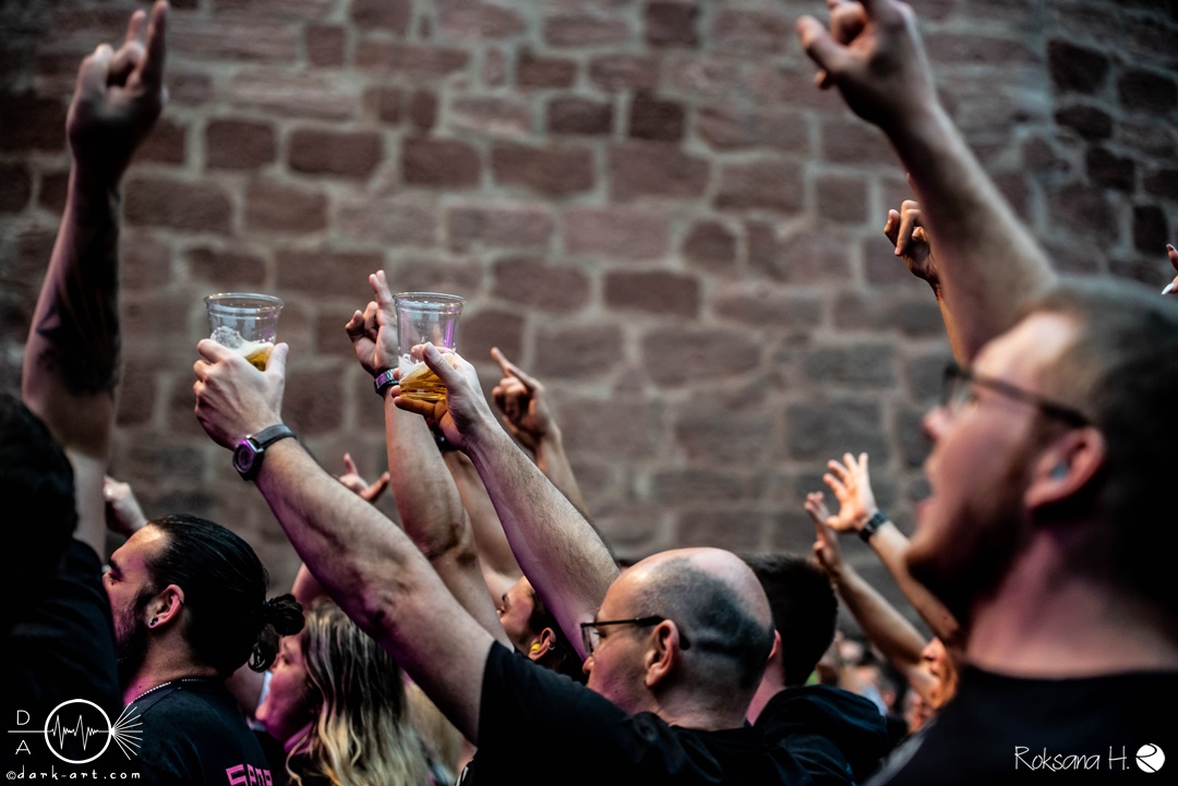 Alles sang und tanzte bei Mei Alde is im Playboy drin und Ich will Spaß mit. Um den Menschen einen Moment zum Erholen zu geben, folgte ein Drumsolo von Wolfram, welcher von Hannes im Hintergrund veräppelt wurde. Dann war es soweit, der nächste Song der nie (aber wirklich niemals!) auf der Setlist fehlen darf, wurde mit den Worten: „Singt ihr mal, ihr könnt den Text eh besser als wir“ angekündigt. Es war Zeit für Ein guter Tag zum Sterben und wer jetzt nicht direkt einen Ohrwurm hat, dem ist leider nicht mehr zu helfen. Alle, aber wirklich alle, sangen das Lied von vorne bis hinten (fast) fehlerfrei mit. Immer wieder ein Highlight bei den Auftritten der Spaßtruppe. „Eins – der Daumen hoch! Zwei – die Pommesgabel, Drei – der zweite Daumen, Vier – Alle Viere“. Nachdem das ausreichend, unter Anleitung von Vito geübt wurde, hatte der „Vier Finger Mann“ seinen großen Auftritt und performte zu Vier Finger für ein Halleluja auf der Bühne und heizte dem Spießer, der am Ende doch noch ein ordentlicher Metaler wurde, richtig ein.